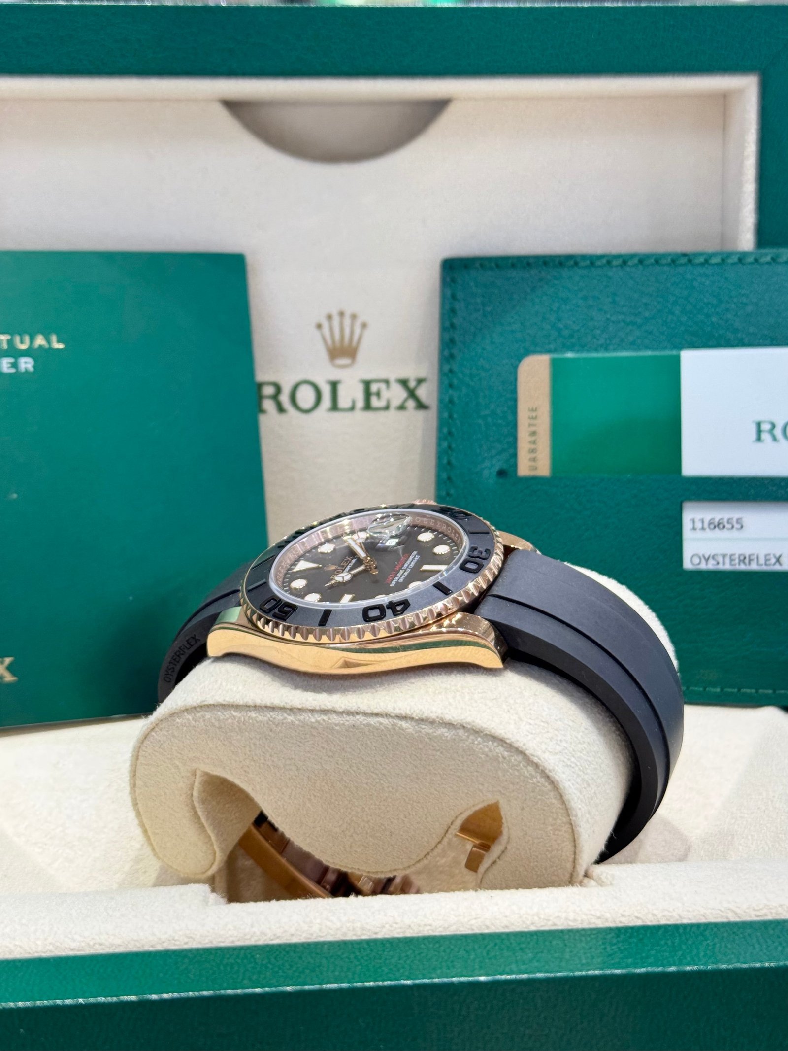 Bracelet: Black Oysterflex strap with 18ct rose gold Oysterlock clasp