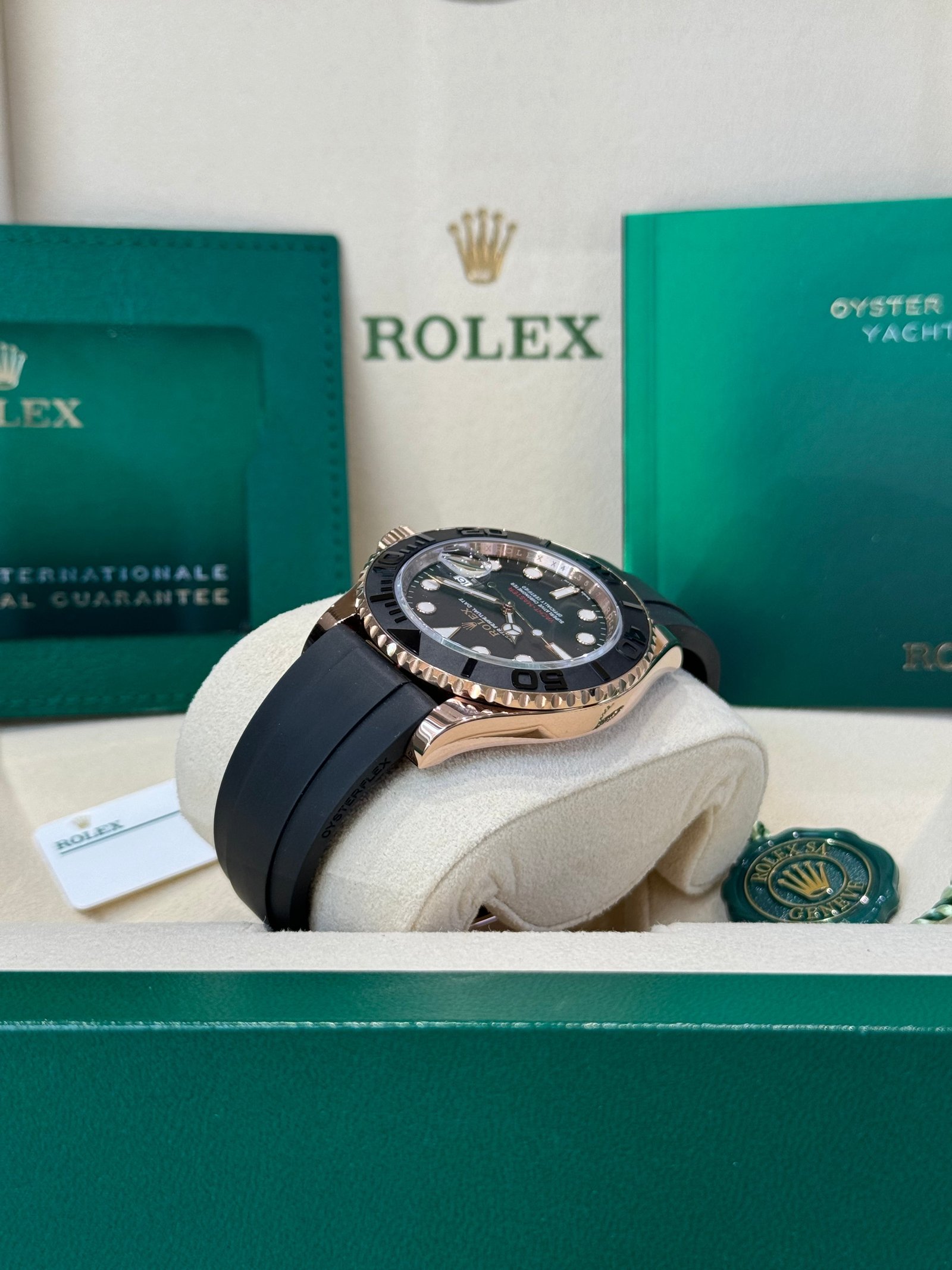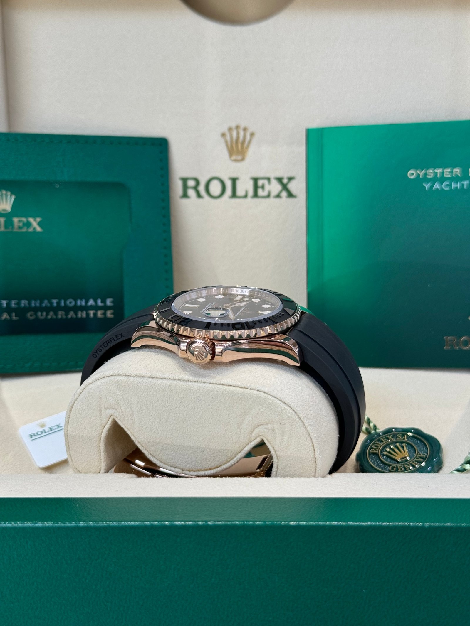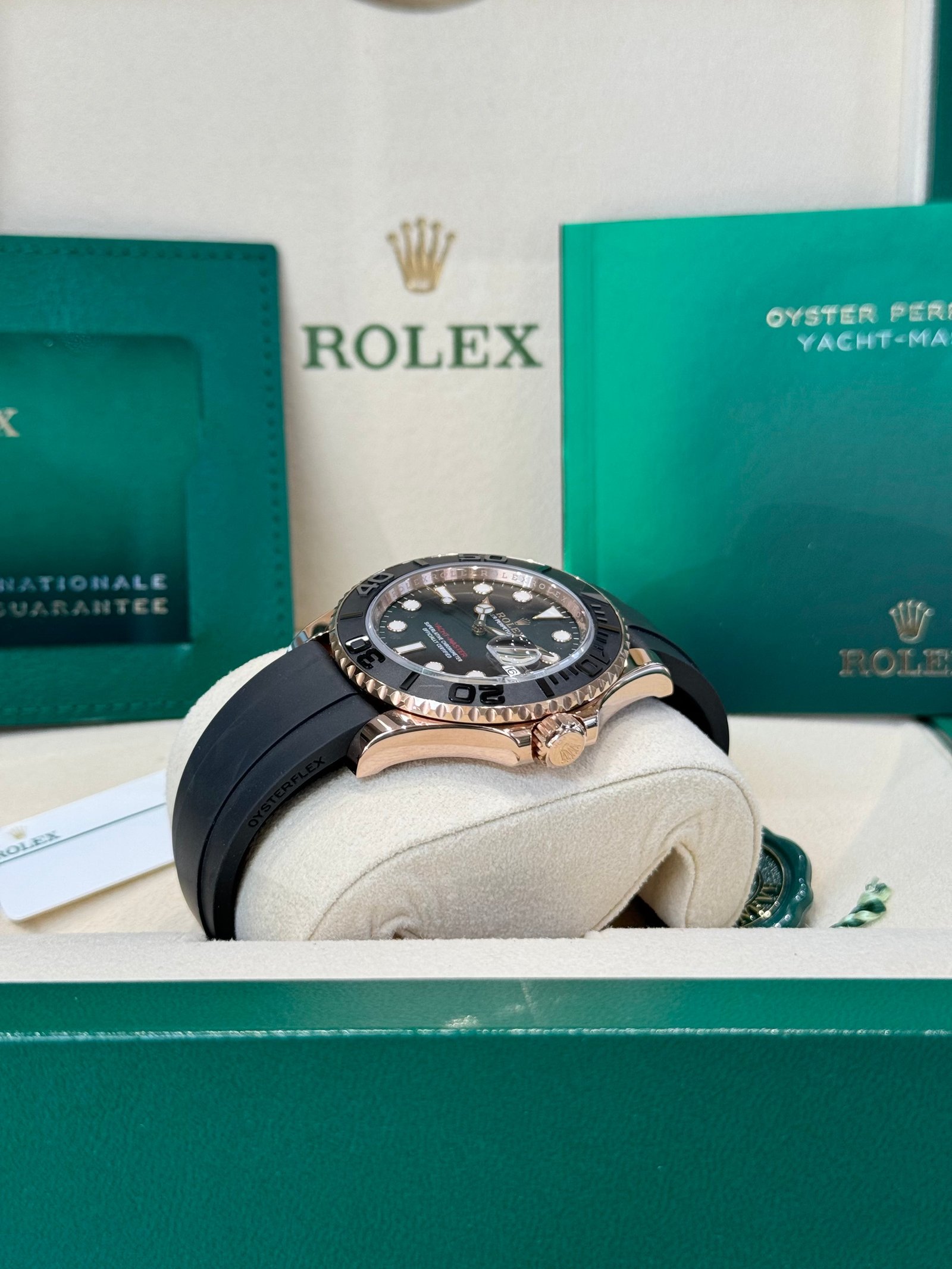 Bracelet: Black Oysterflex strap with 18ct rose gold Oysterlock clasp