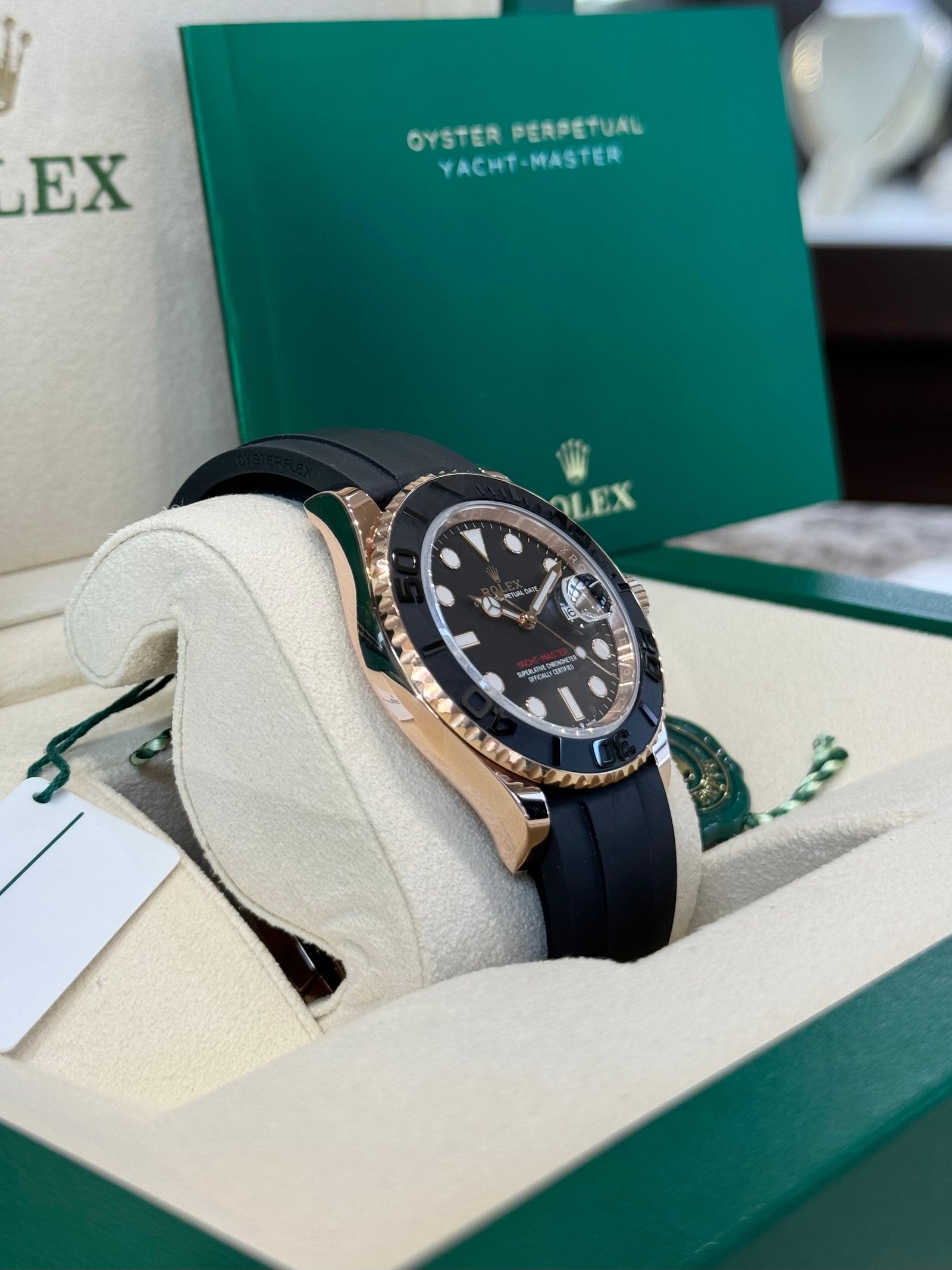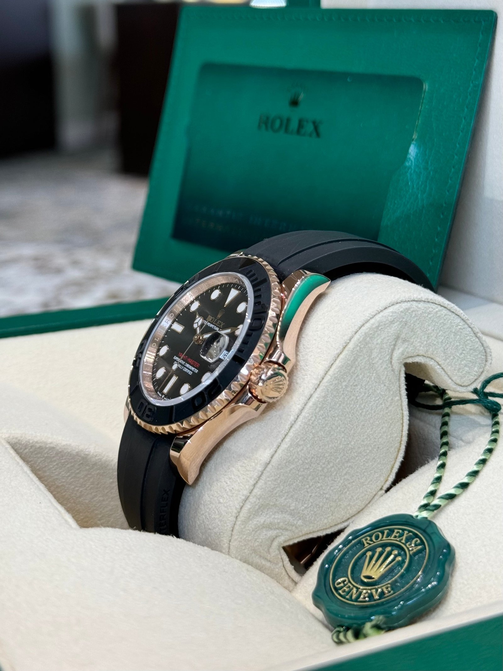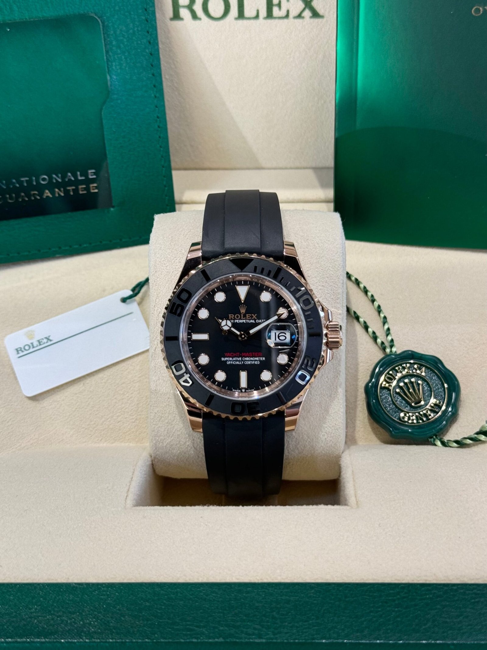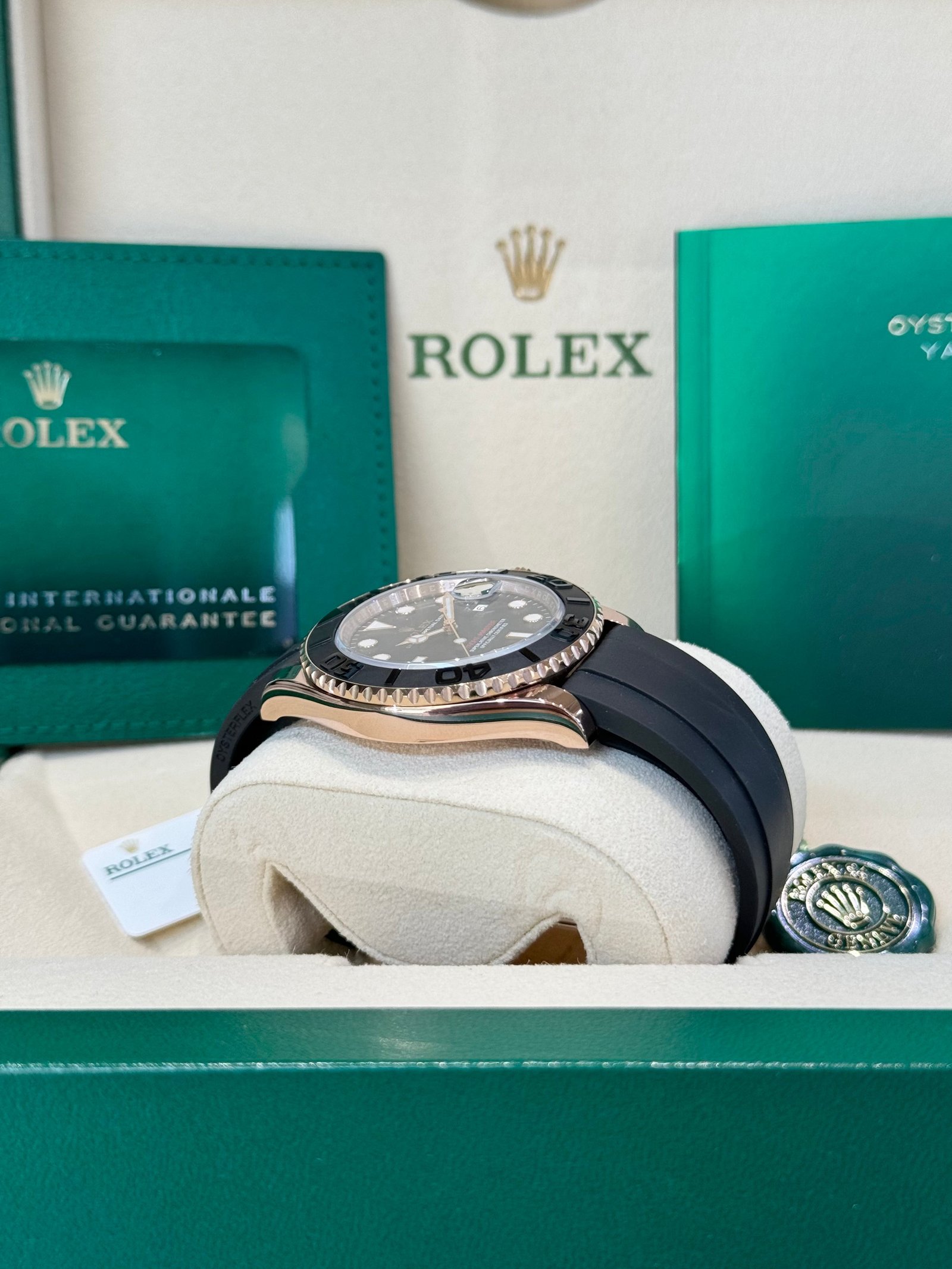 Bracelet: Black Oysterflex strap with 18ct rose gold Oysterlock clasp