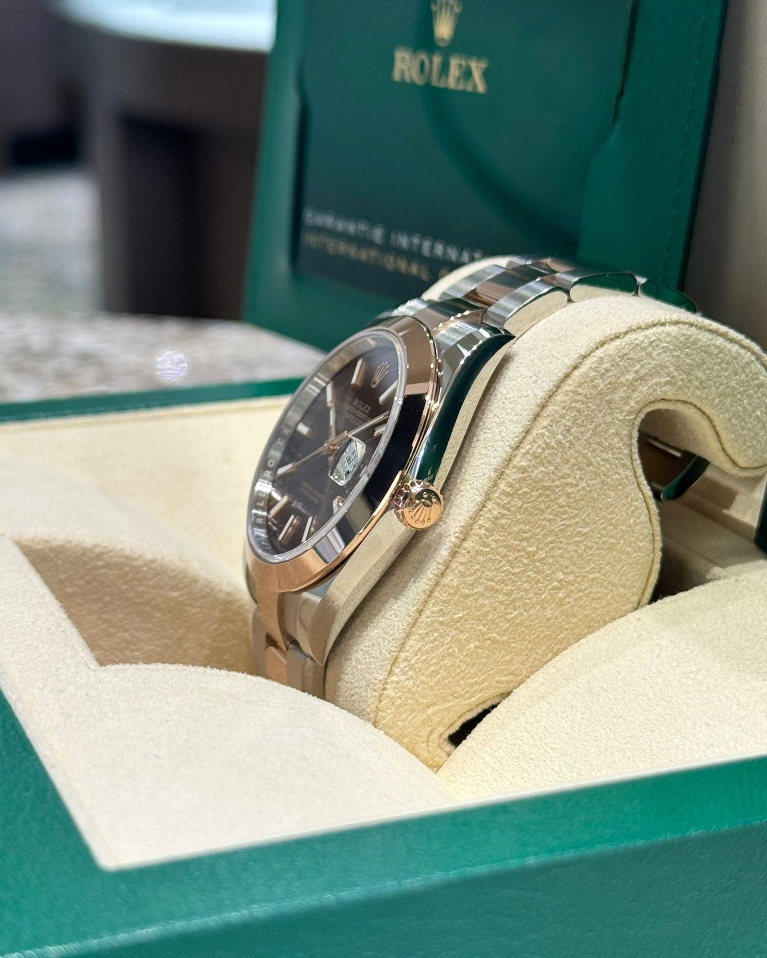 Dial: Chocolate dial. Date calendar at 3 o’clock aperture.