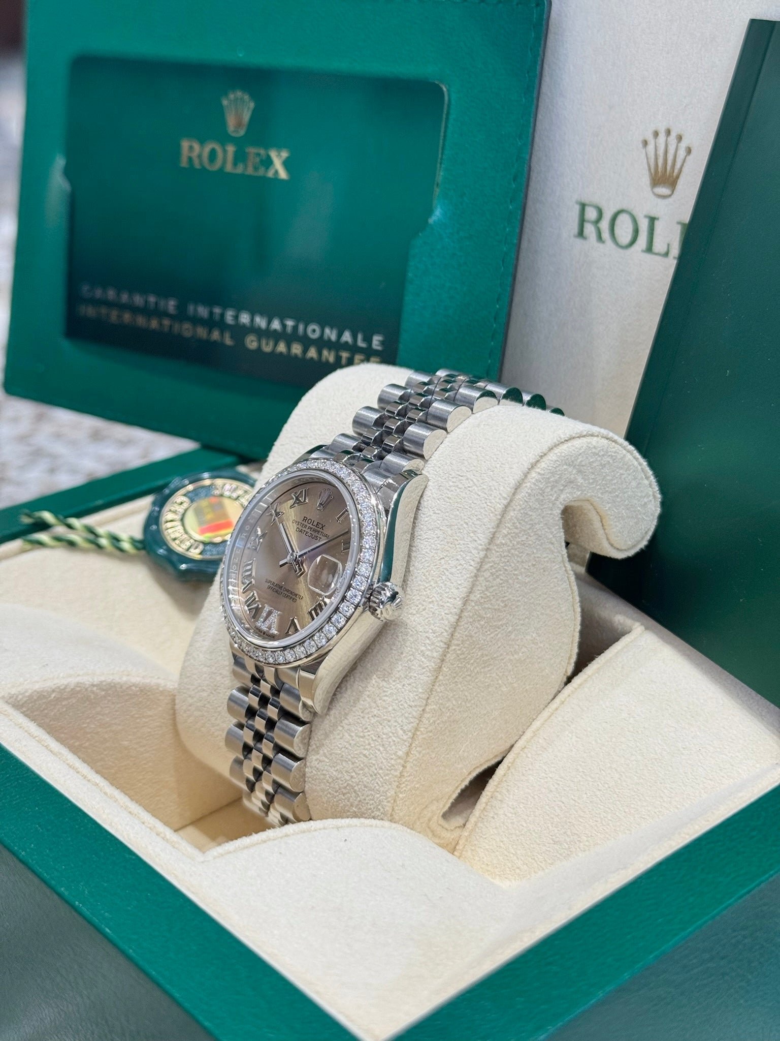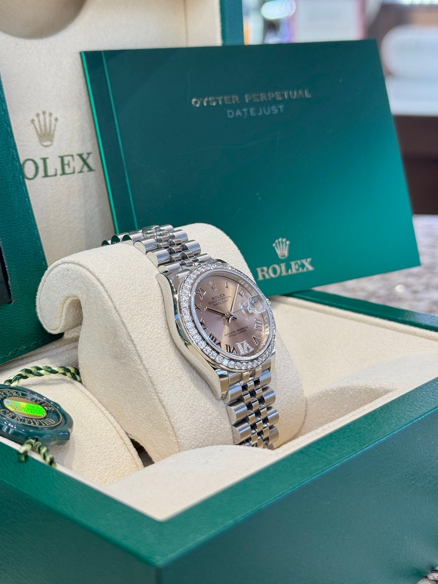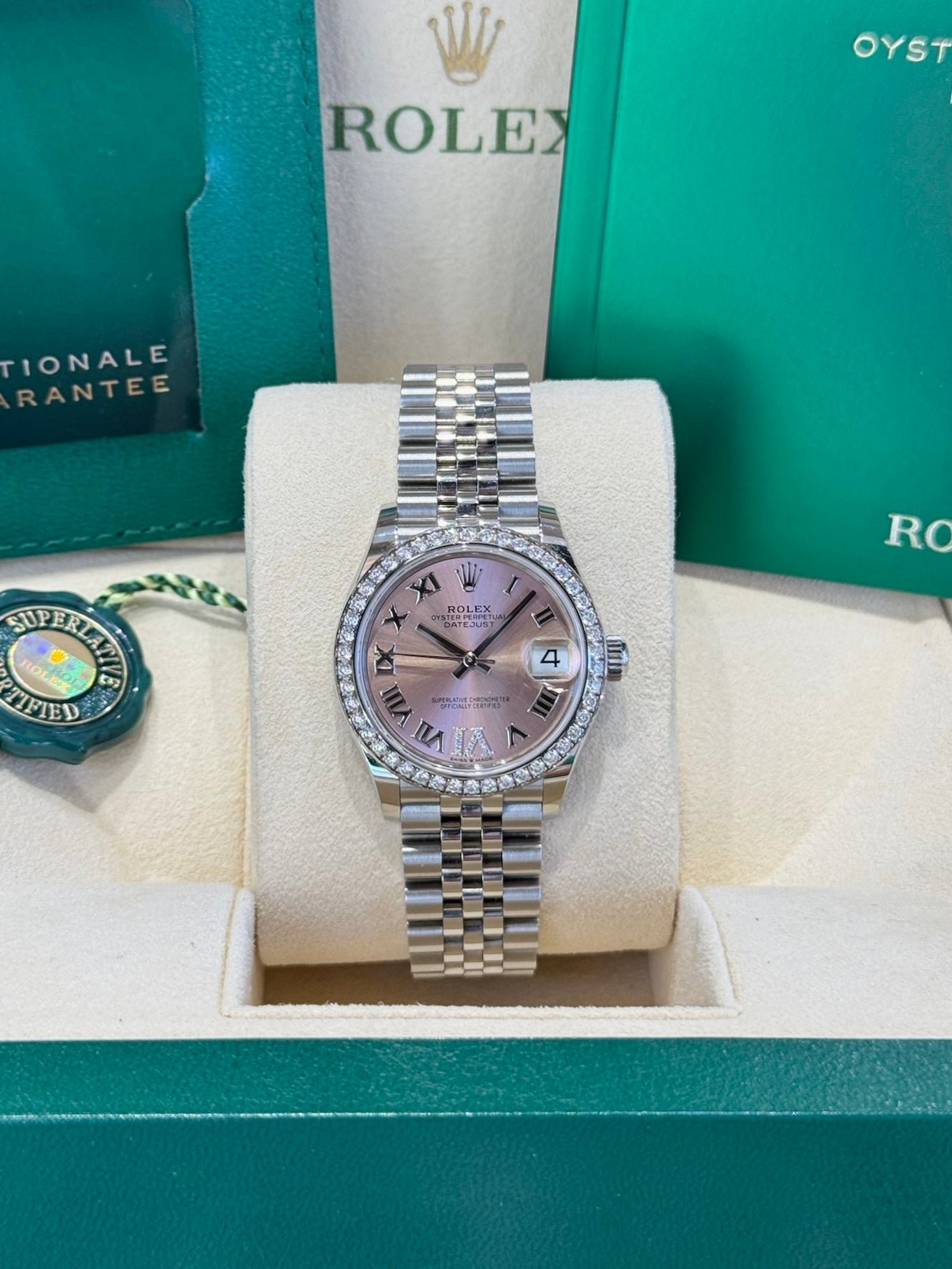 Dial: Pink dial with Roman numerals and diamond pave set VI. Date calendar at 3 o’clock aperture.