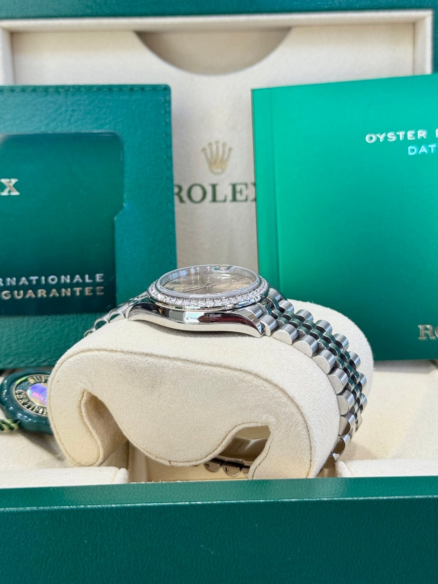 Bezel: 18ct white gold bezel set with diamonds. Inner engraved Rolex bezel ring