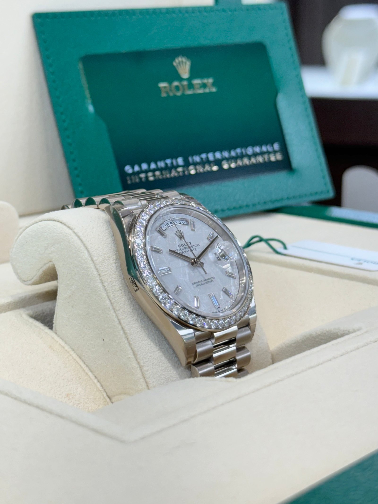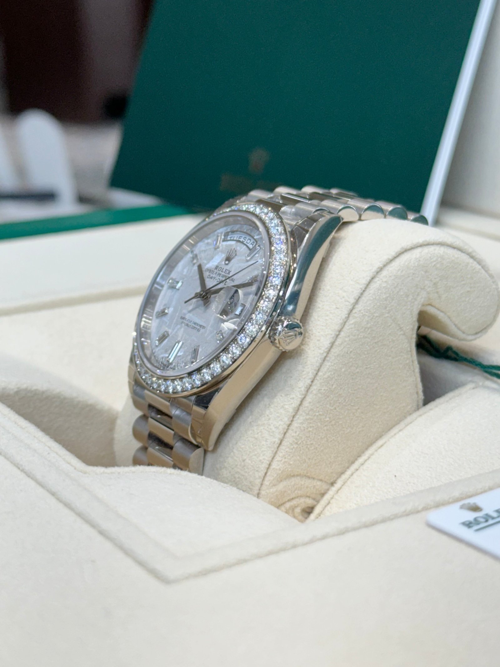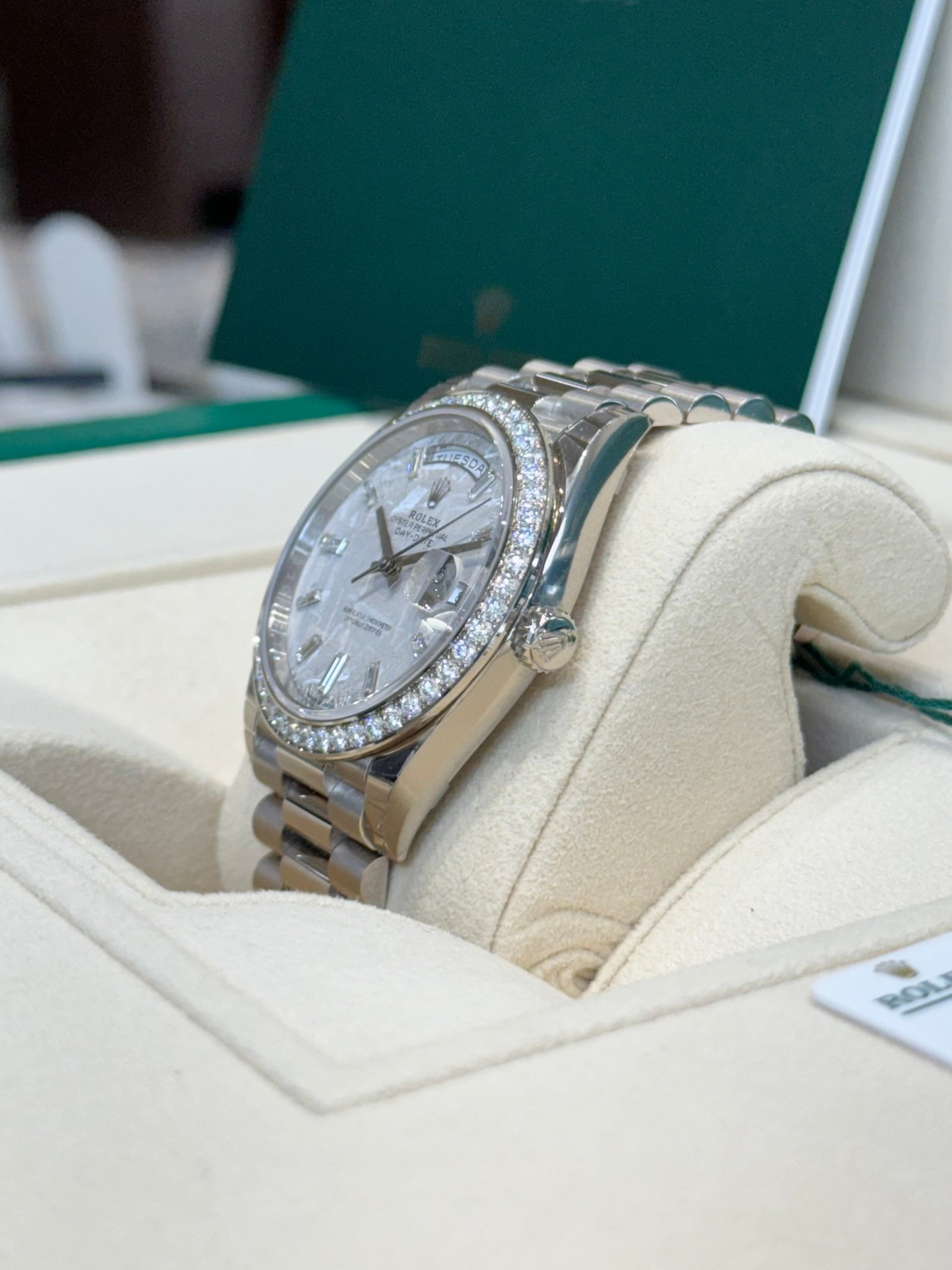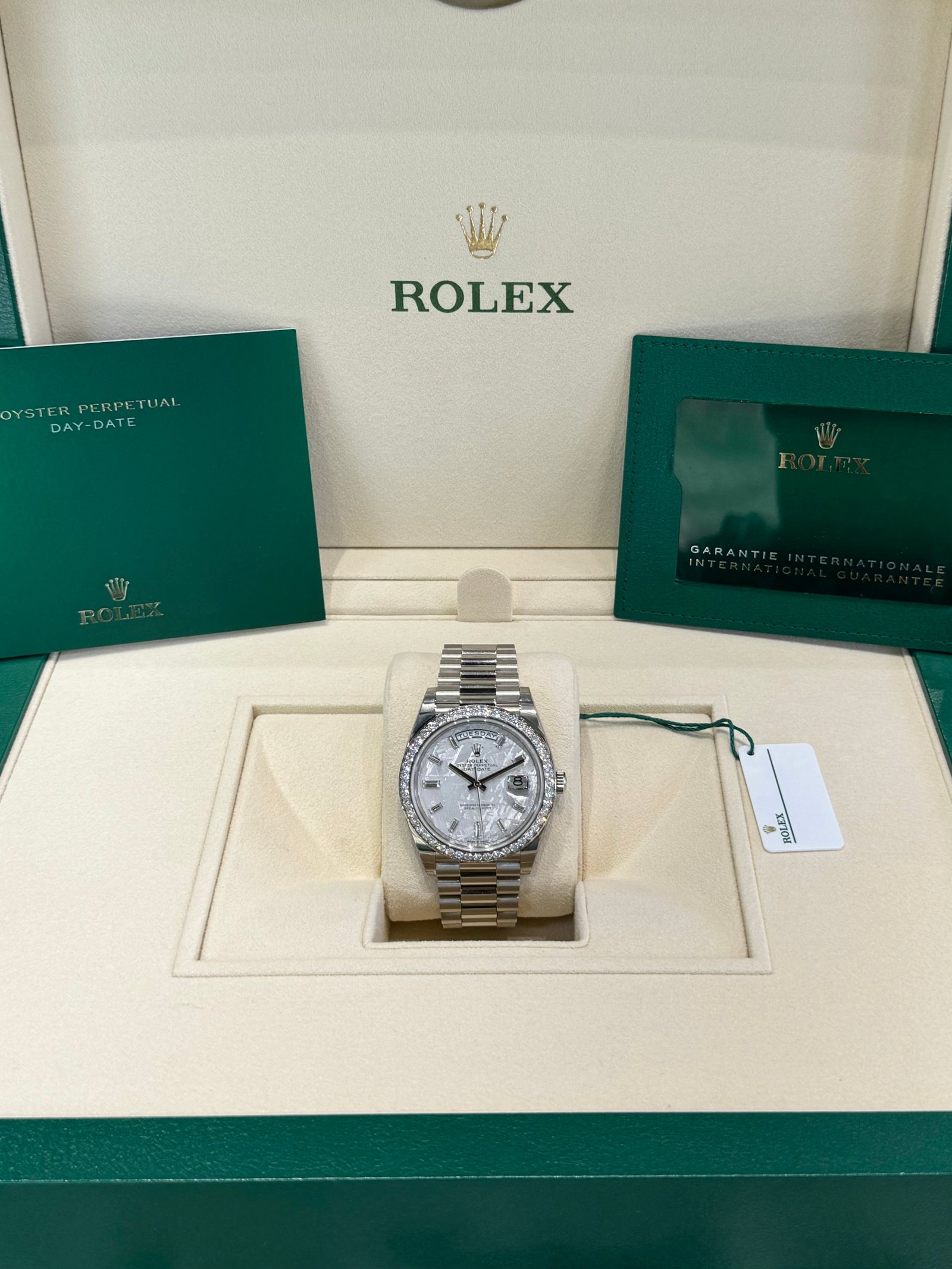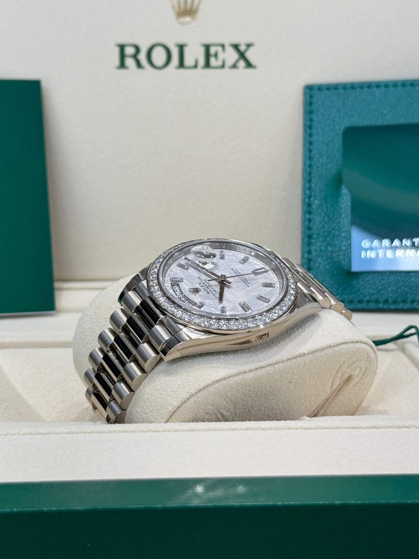 Dial: Meteorite dial with baguette diamond hour markers. Date calendar at 3 o’clock aperture and weekday at 12 o’clock.