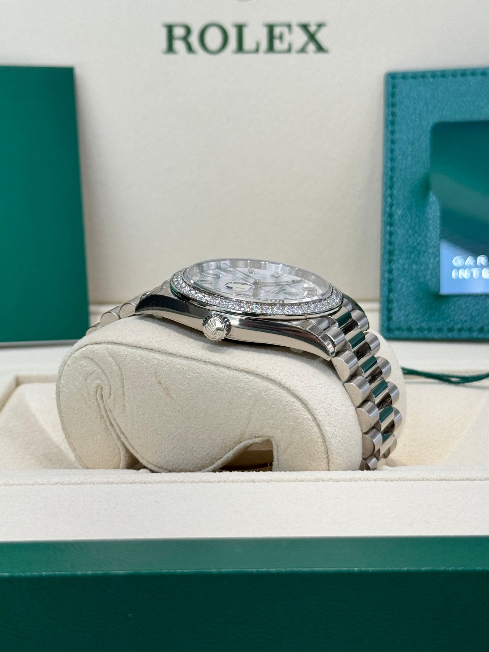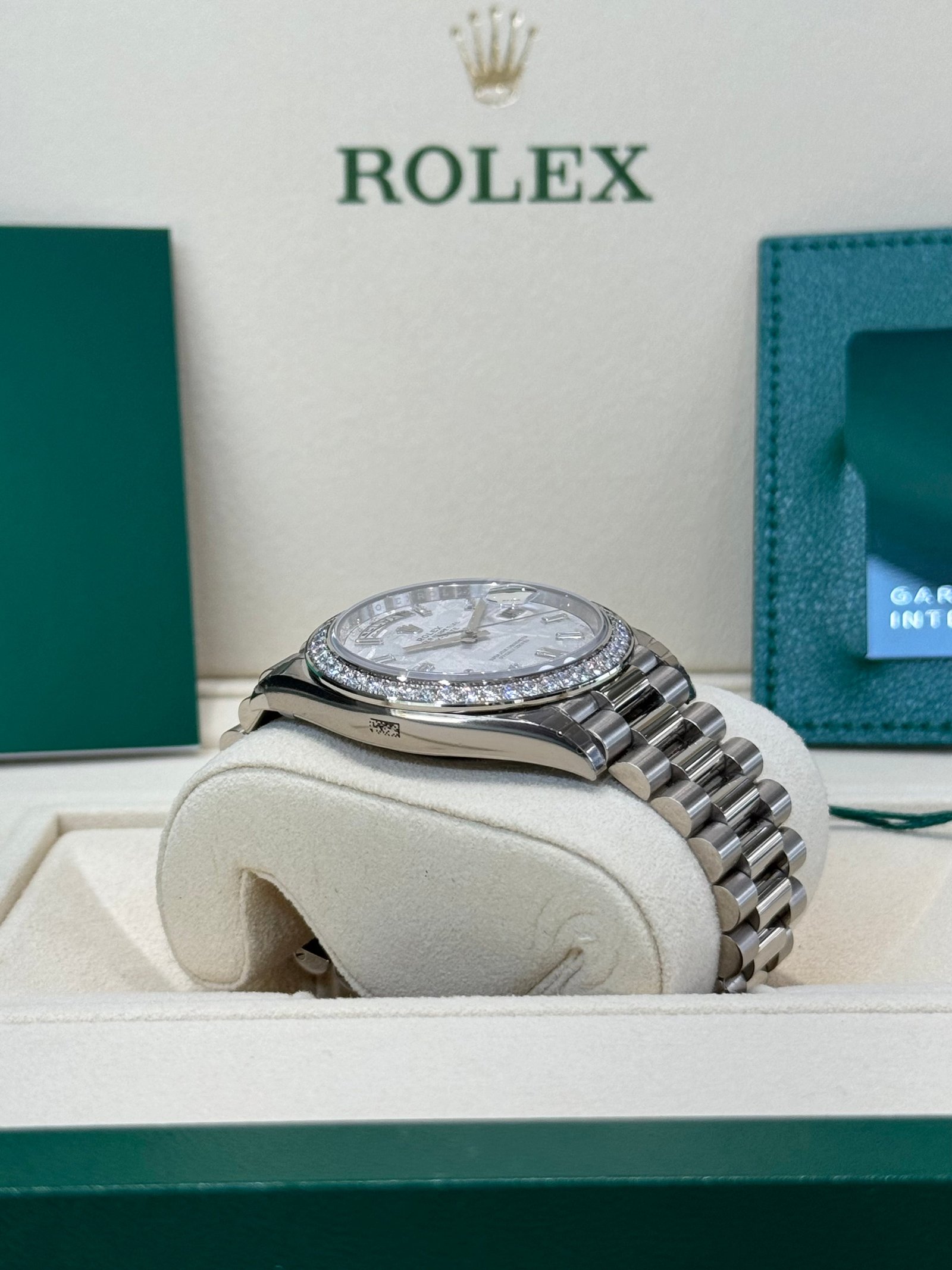 Bezel: 18ct white gold bezel set with diamonds. Inner engraved Rolex bezel ring