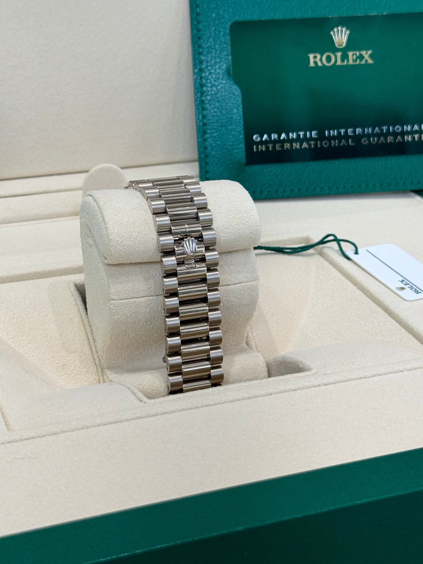 Case: 18ct white gold. 40mm in diameter. Rolex logo on crown