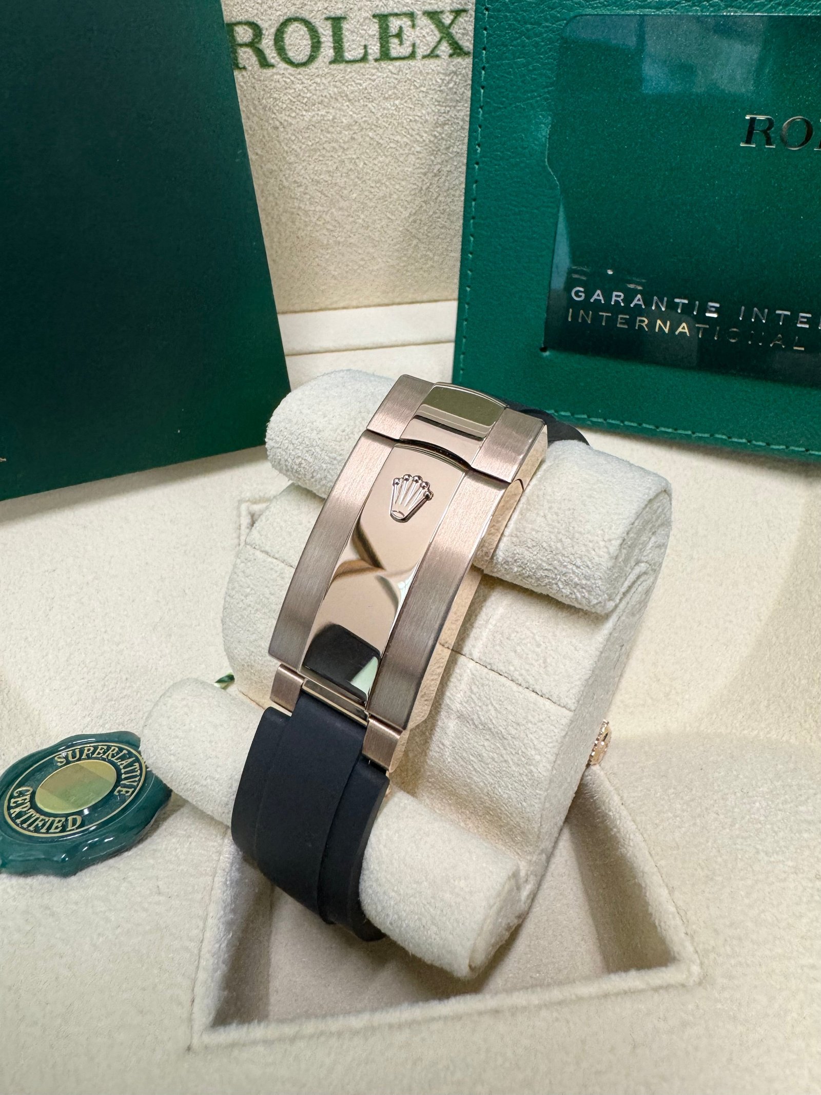 Case: 18ct Everose gold case 42mm in diameter. Rolex logo on crown