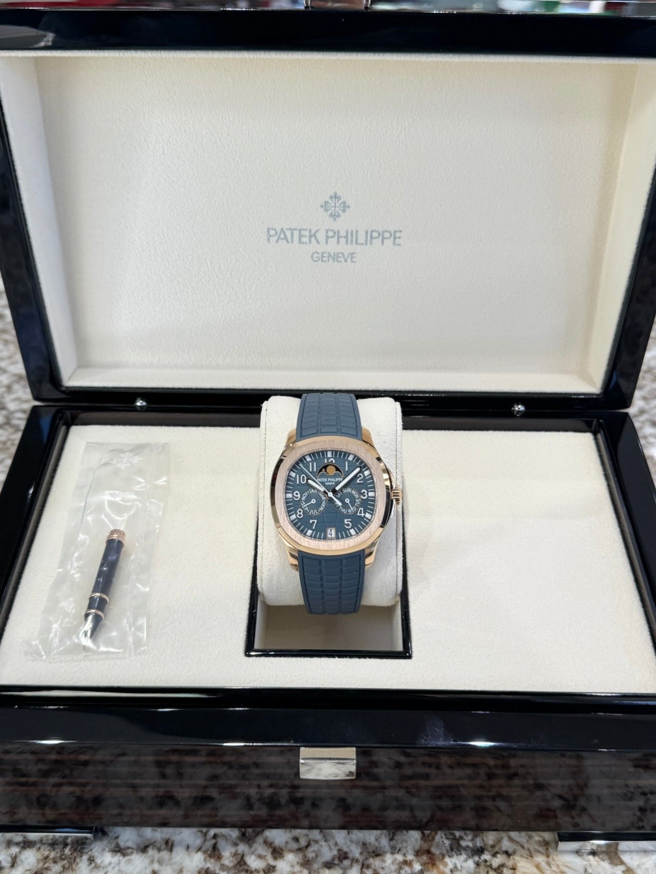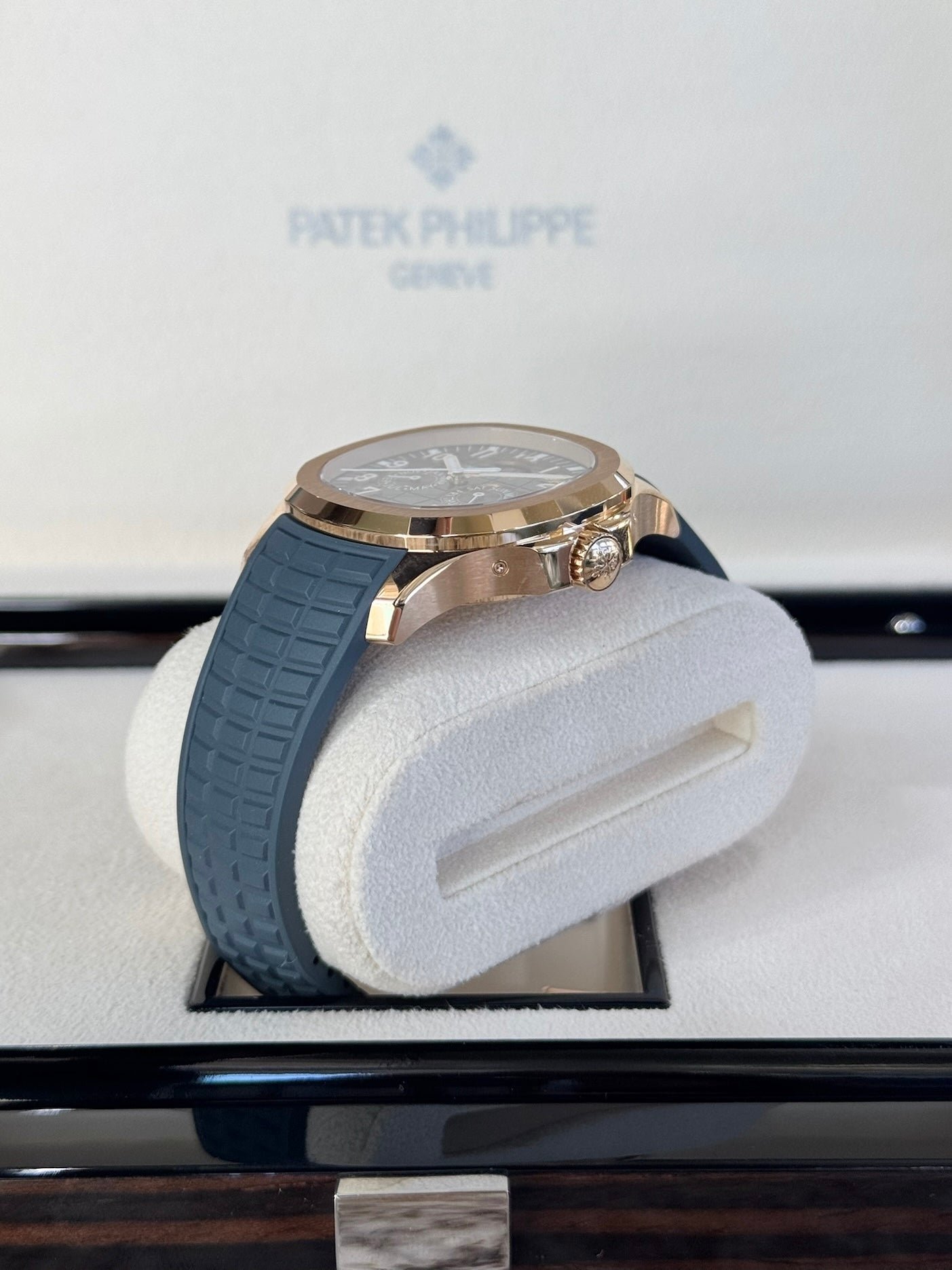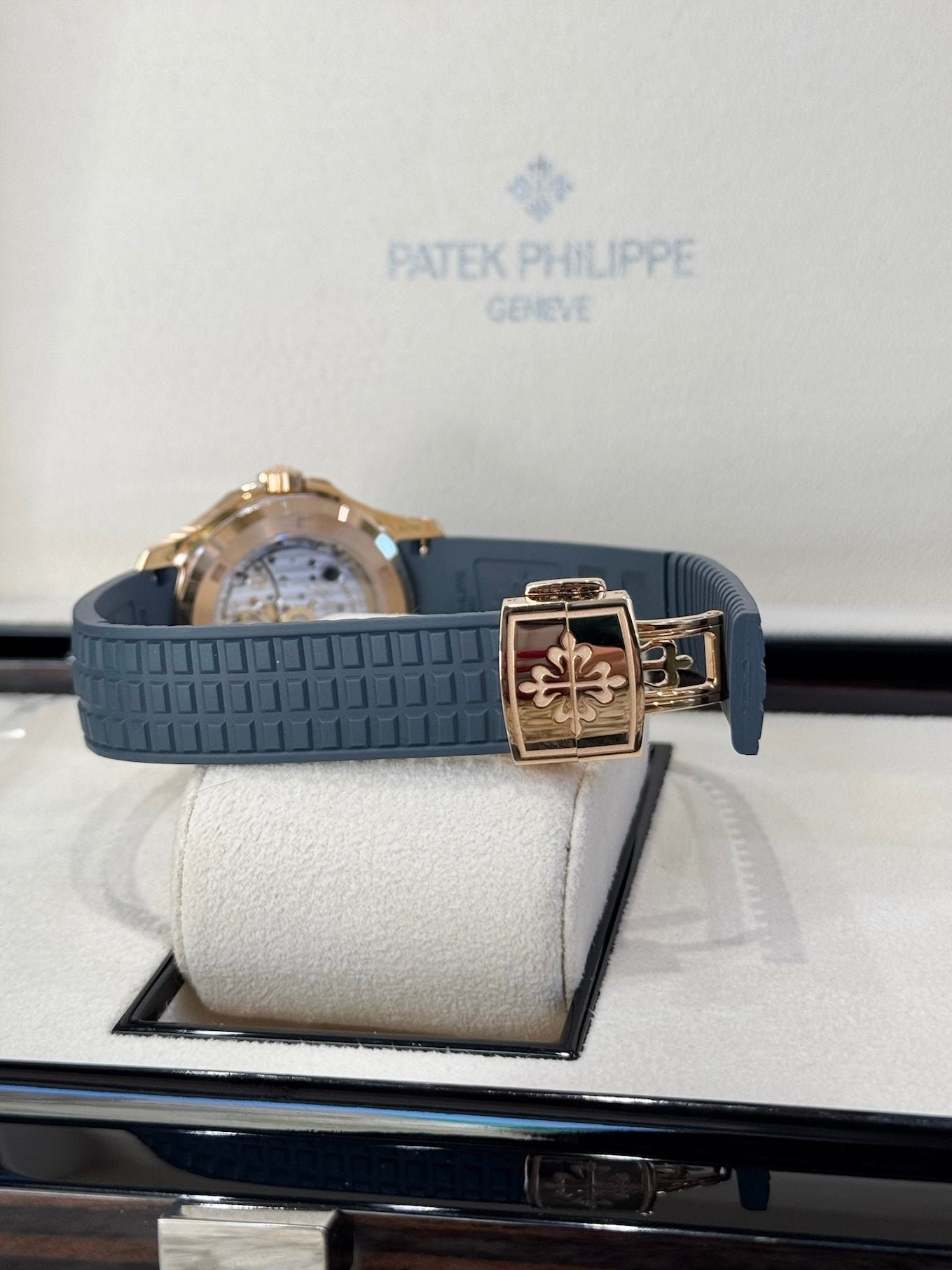 Dial: Blue-gray embossed dial with Aquanaut pattern, gold applied numerals with luminescent coating