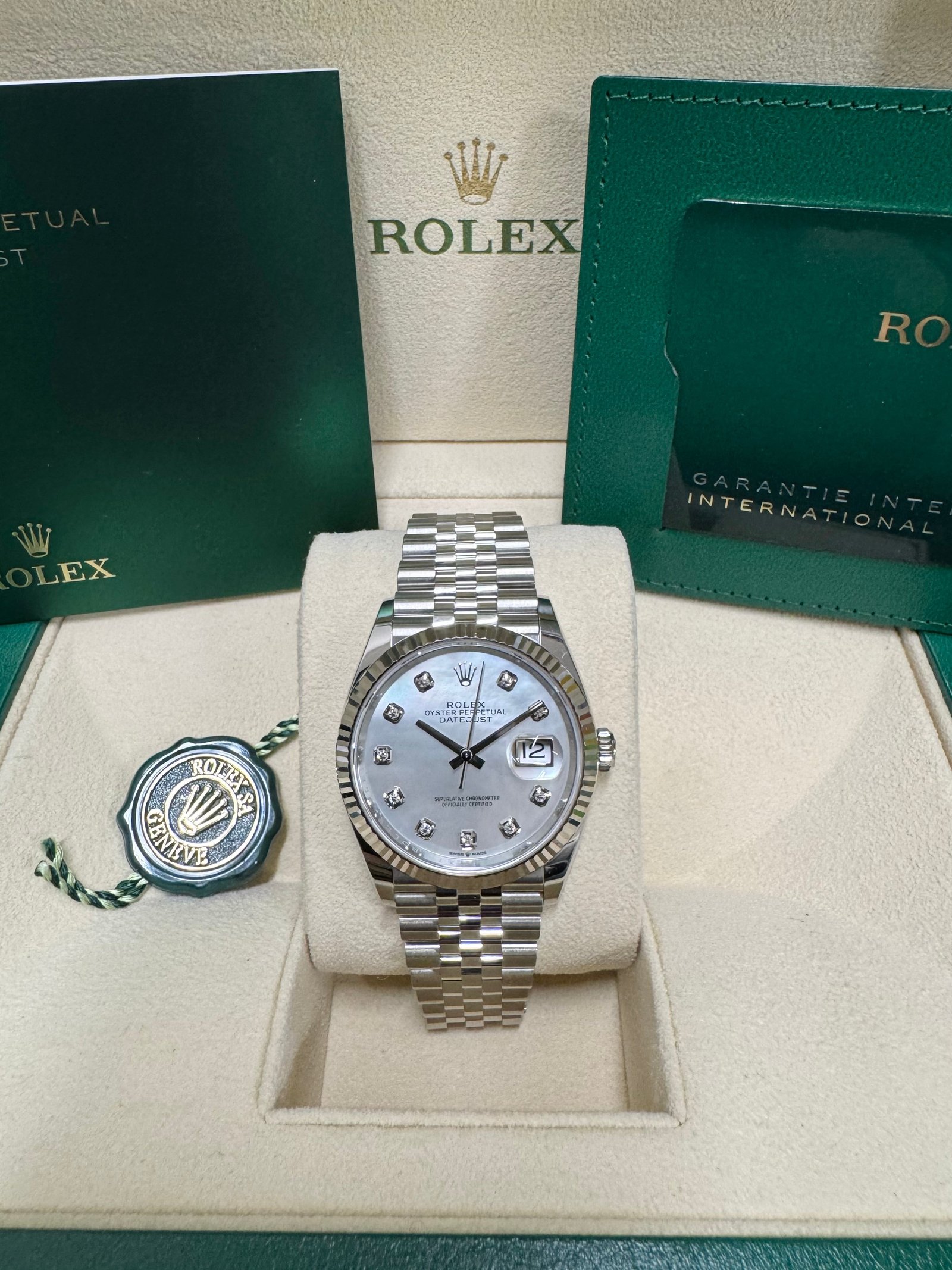 Dial: Mother of Pearl dial with diamond hour markers. Date calendar at 3 o’clock aperture.