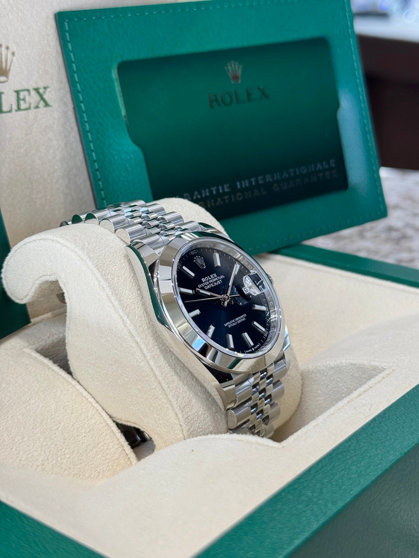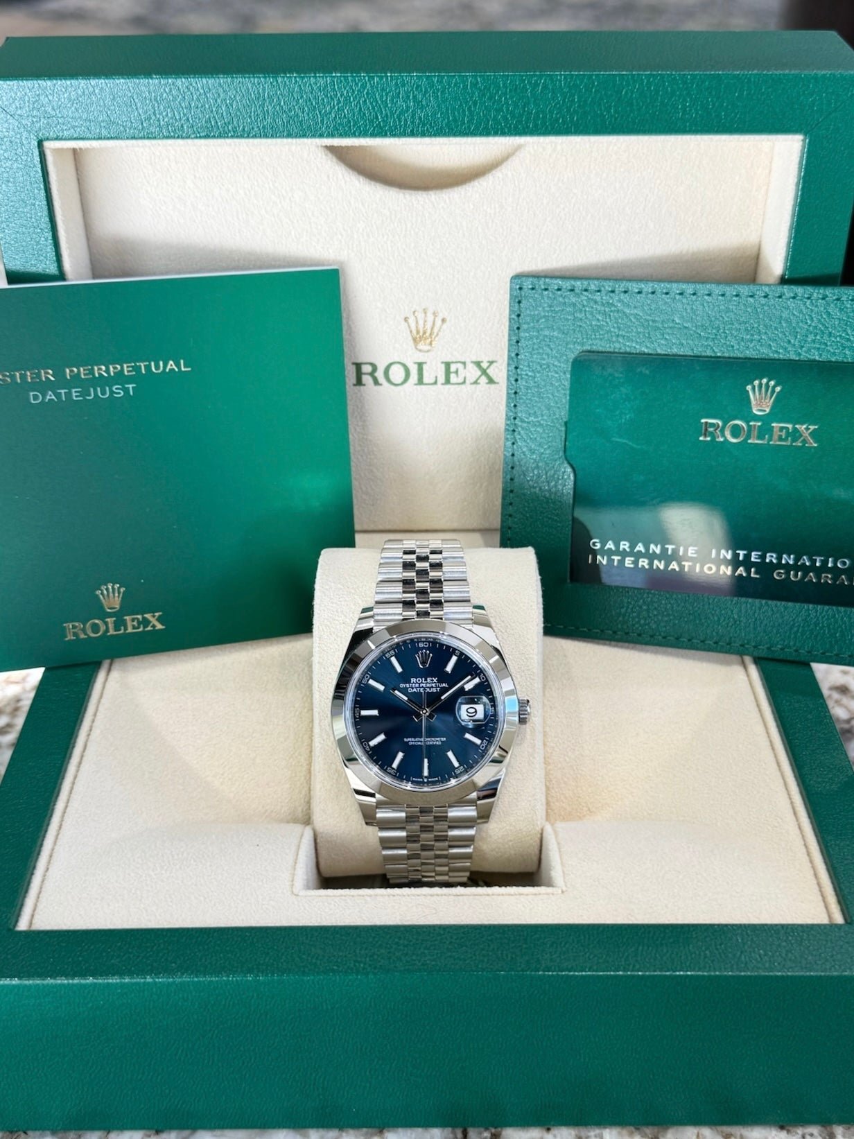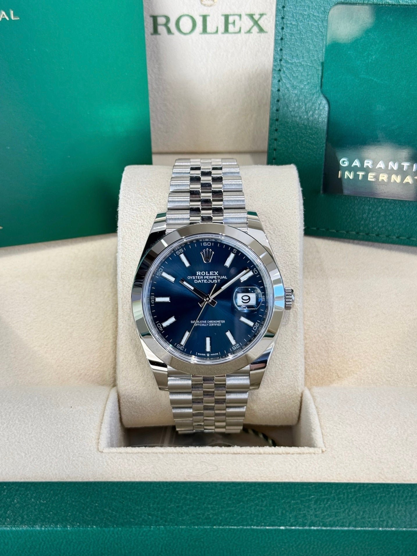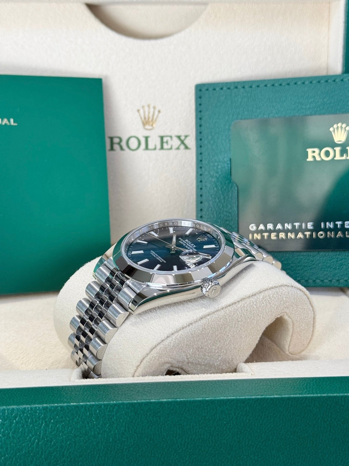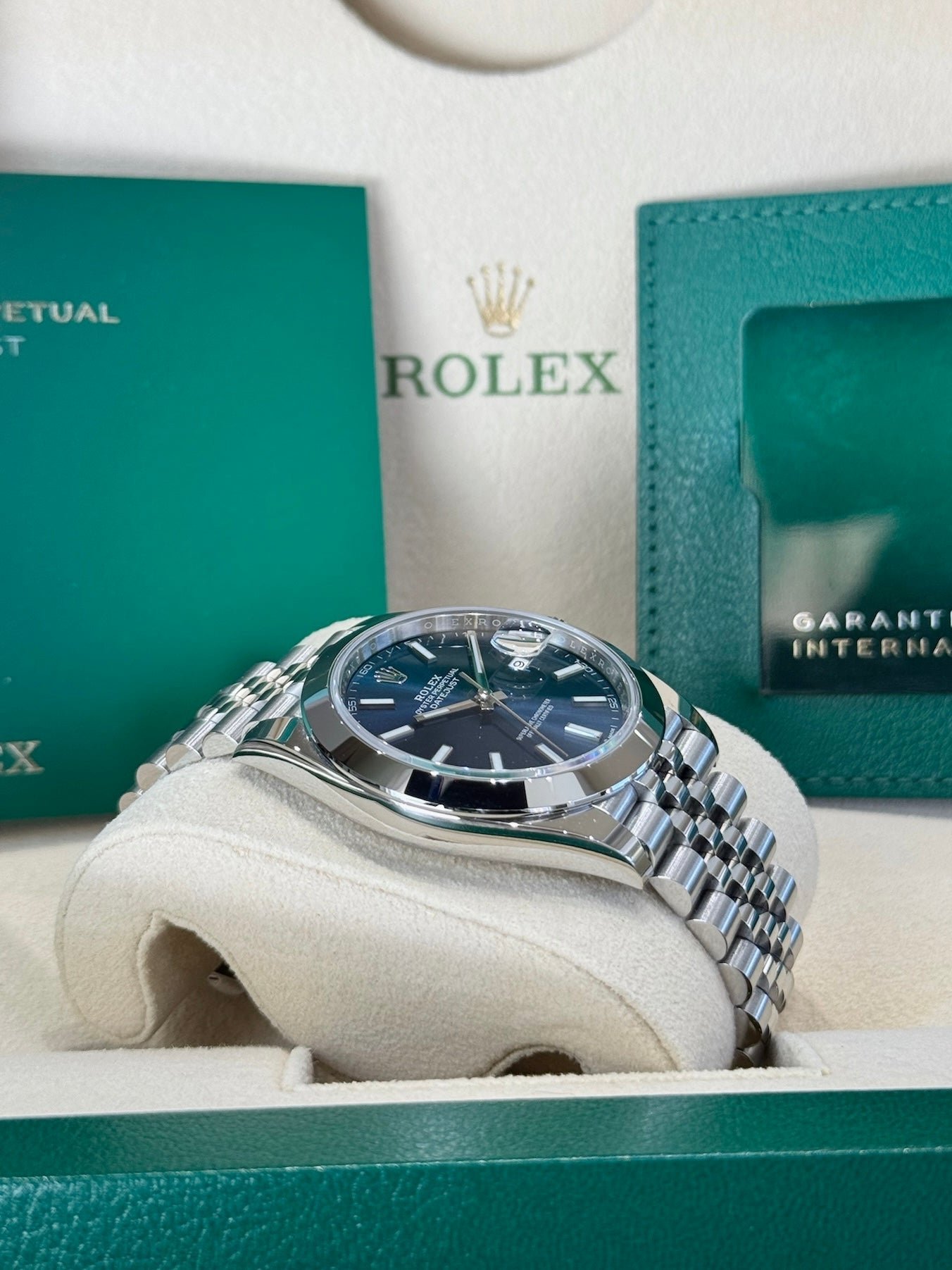Dial: Blue dial. Date calendar at 3 o’clock aperture.