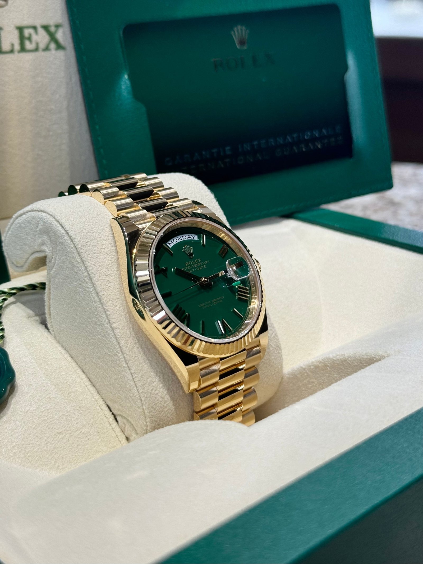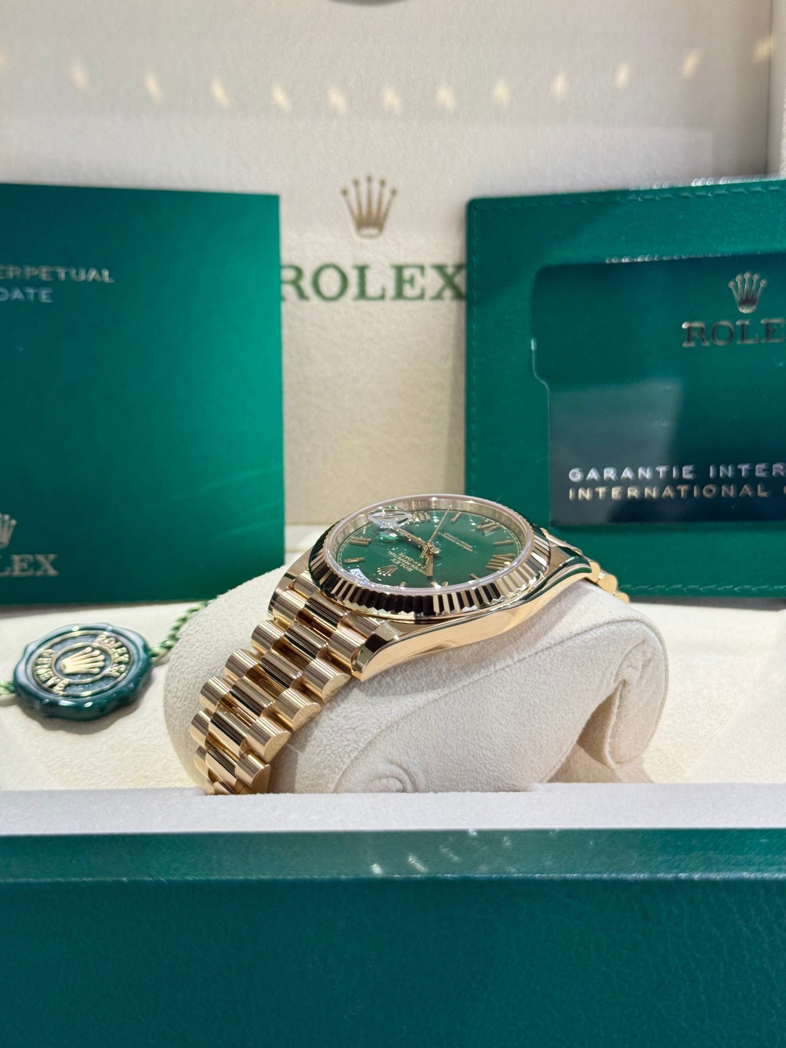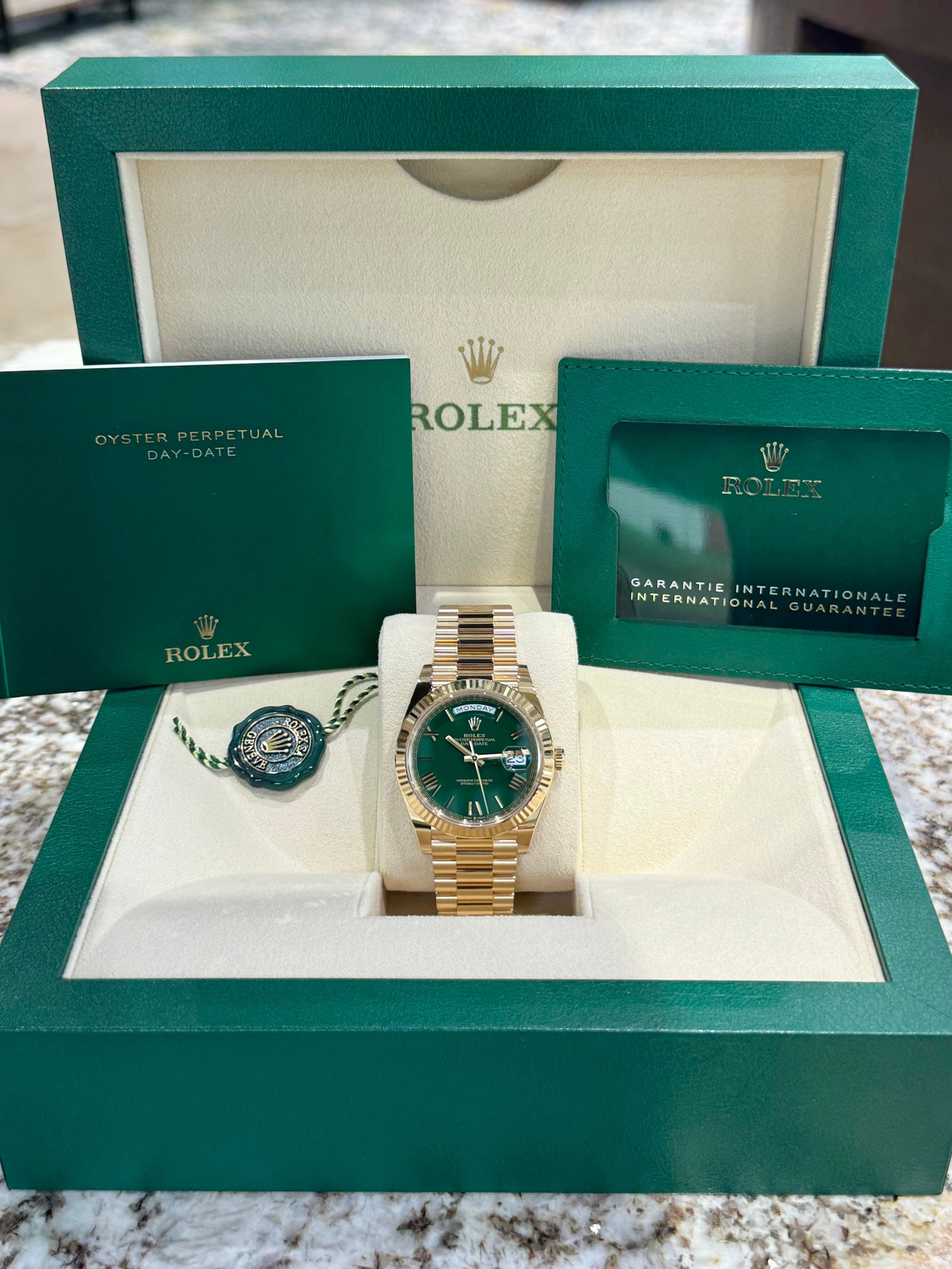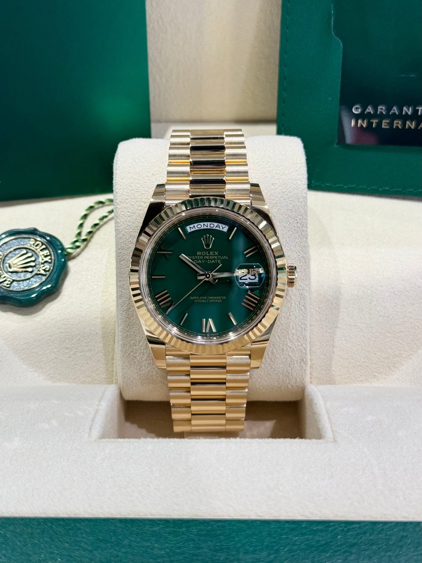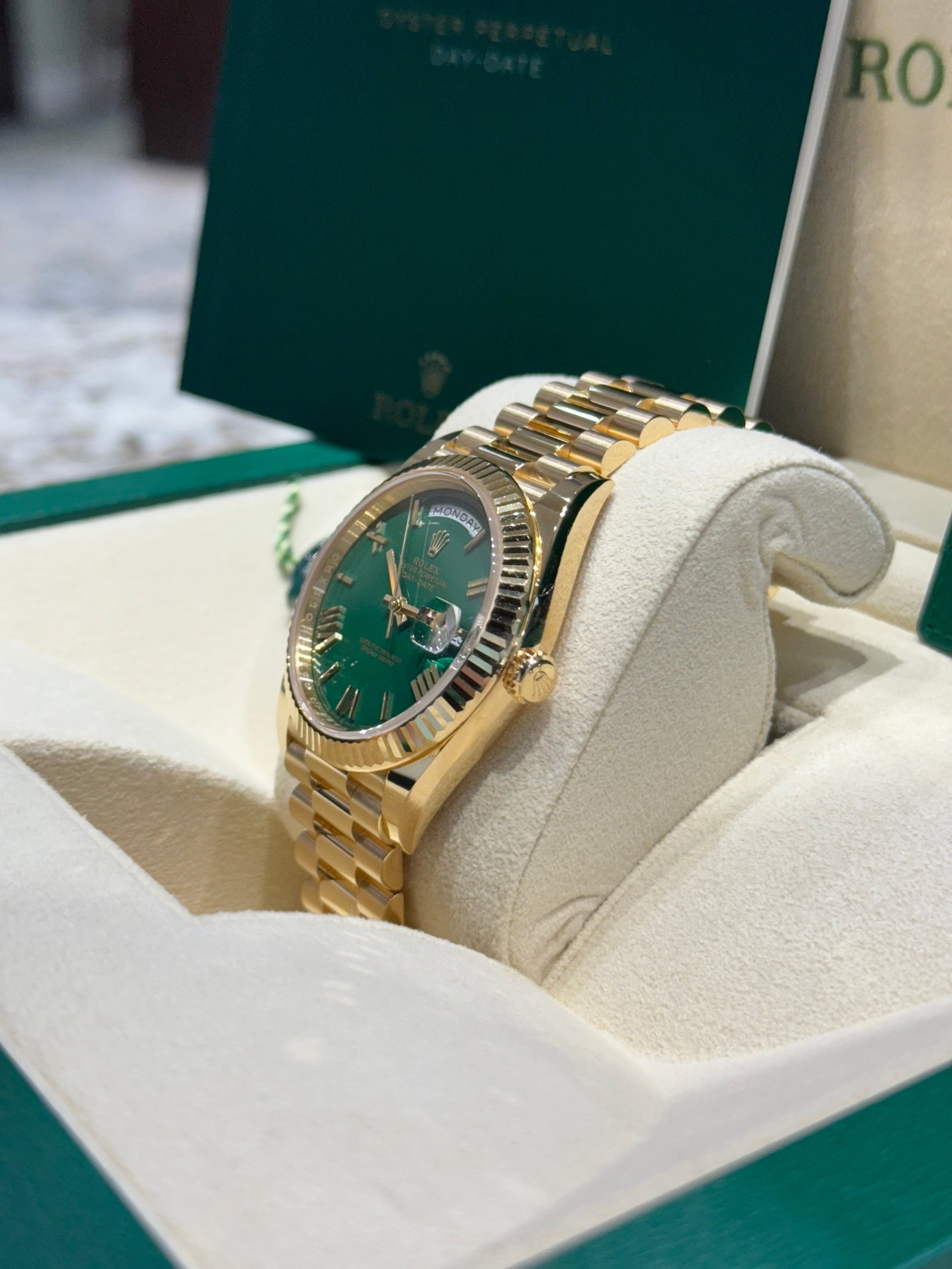 Dial: Green dial with Roman numerals. Date calendar at 3 o’clock aperture. Weekday at 12 o’clock aperture.