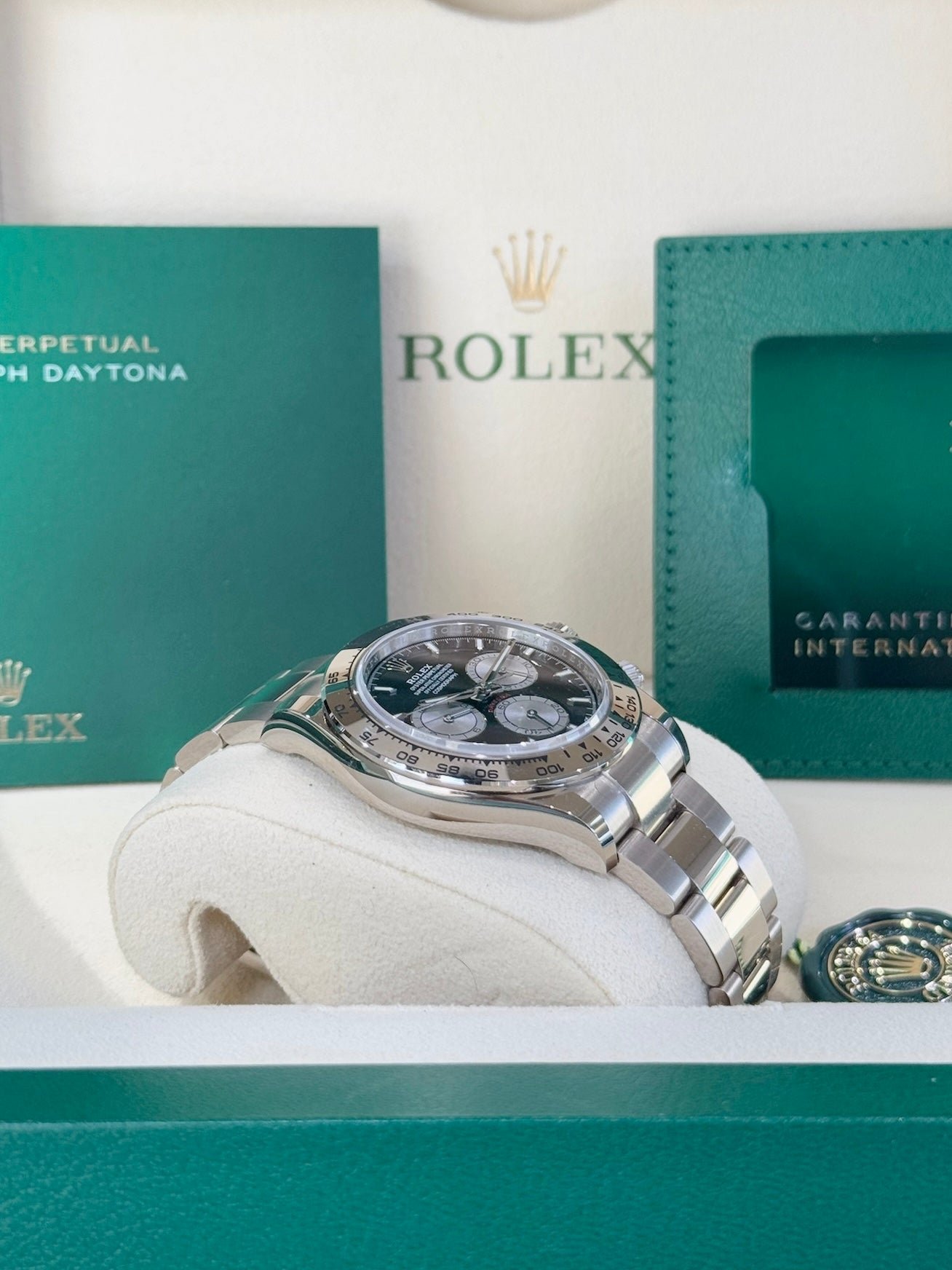 Case: 18ct white gold case 40mm in diameter. Rolex logo on crown