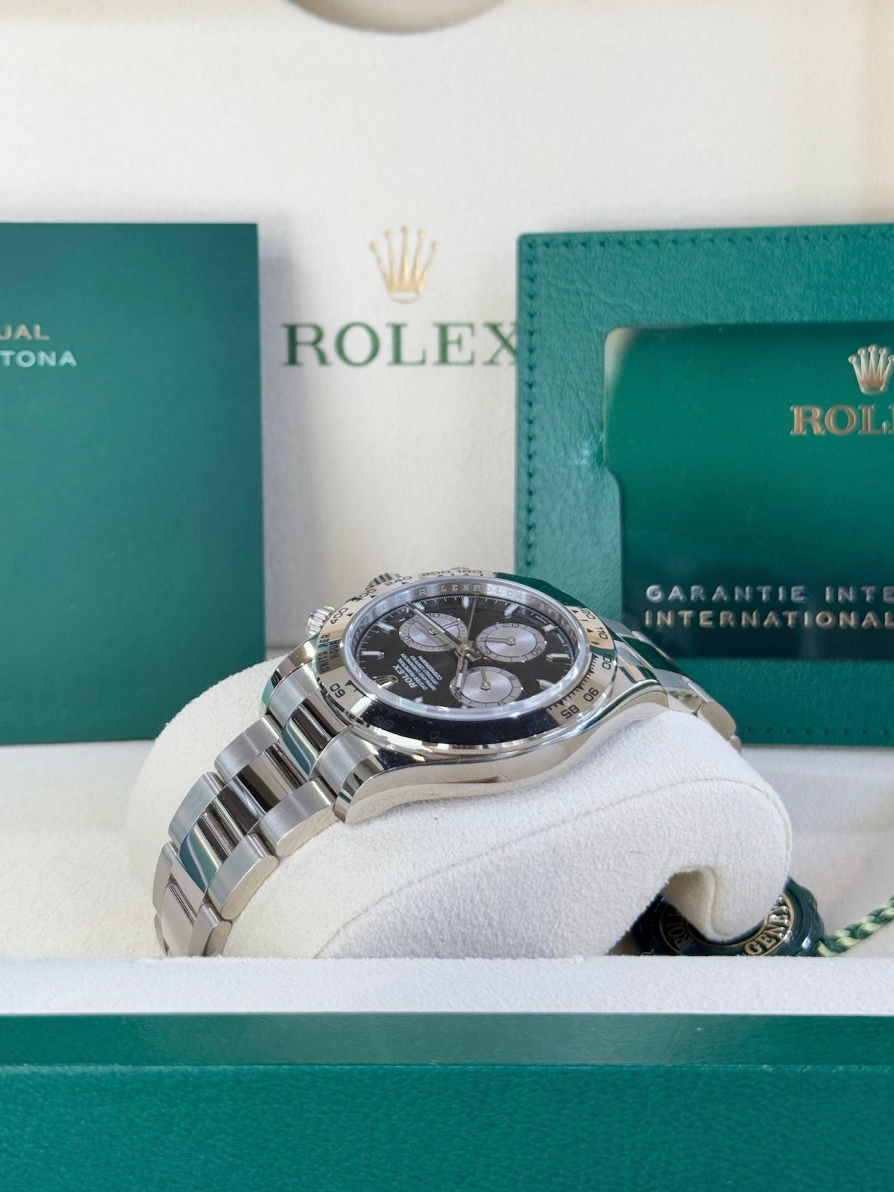 Bezel: Tachymetric engraved 18ct white gold bezel. Inner engraved Rolex bezel ring