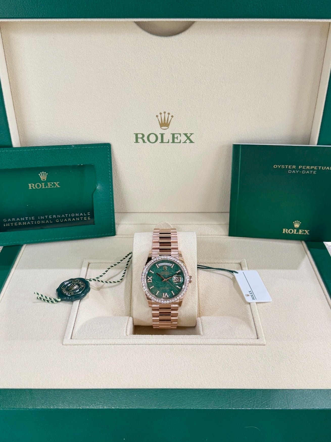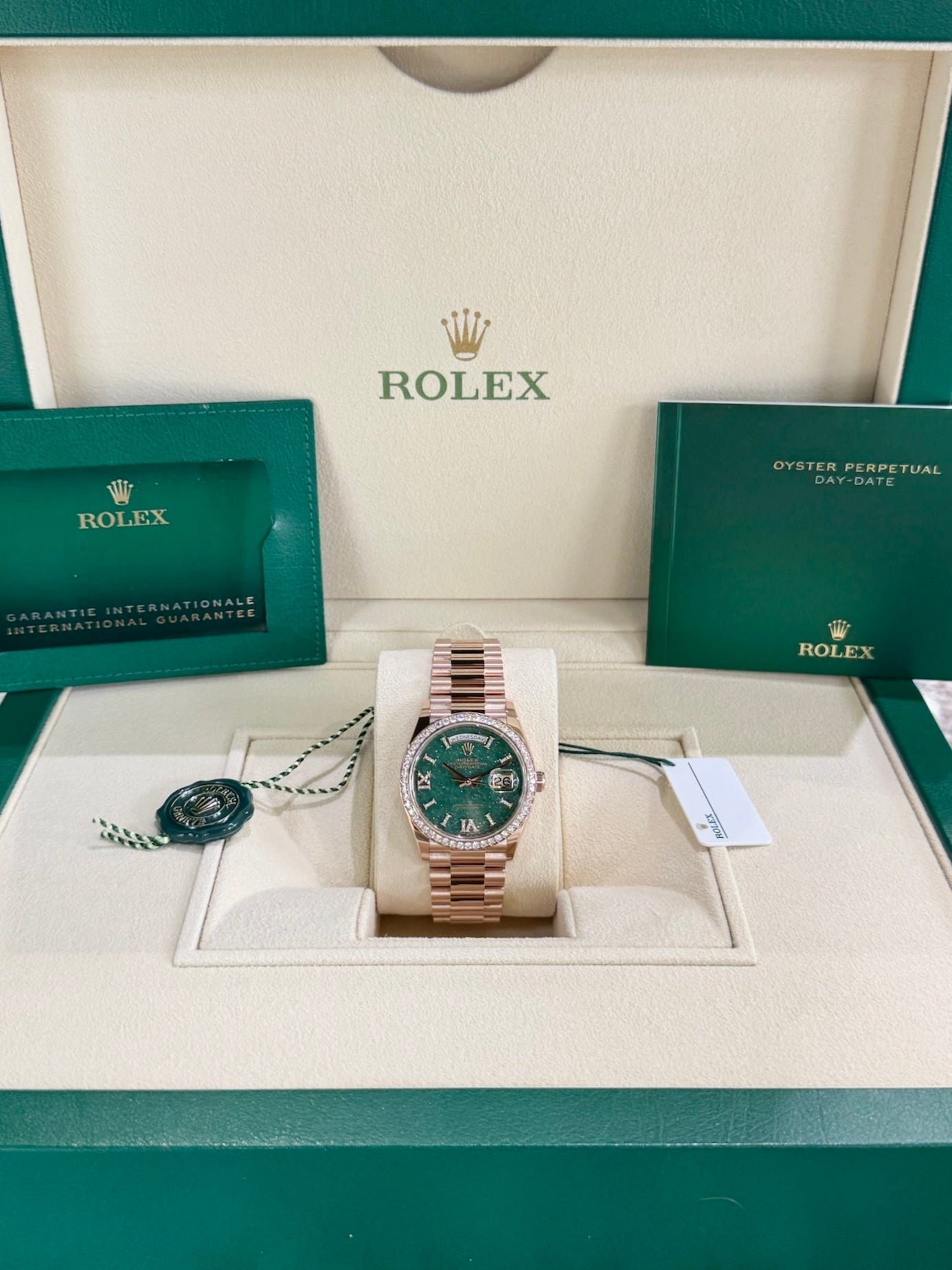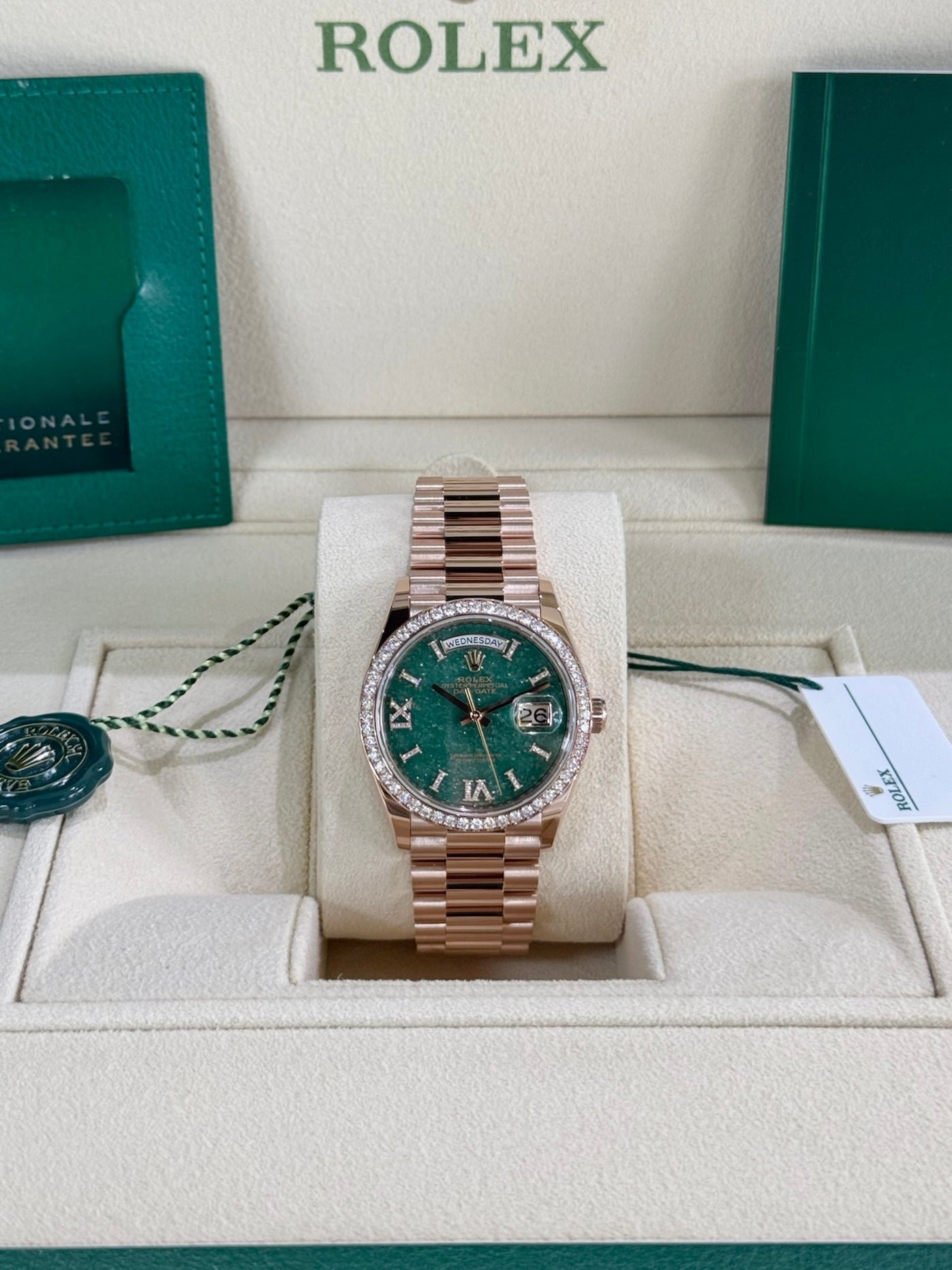 Dial: Green aventurine dial. Hour markers in 18ct gold set with 32 diamonds, Roman VI and IX in 18ct gold set with 24 diamonds. Date calendar at 3 o’clock aperture. Weekday at 12 o’clock aperture.