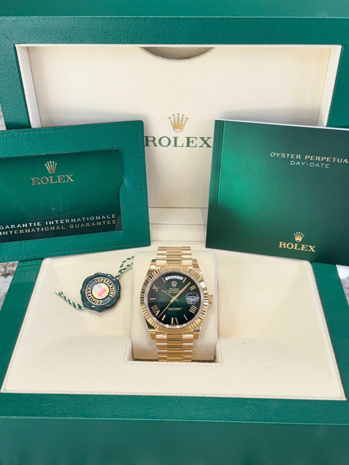 Dial: Green ombre dial with Roman numerals. Date calendar at 3 o’clock aperture. Weekday at 12 o’clock aperture.