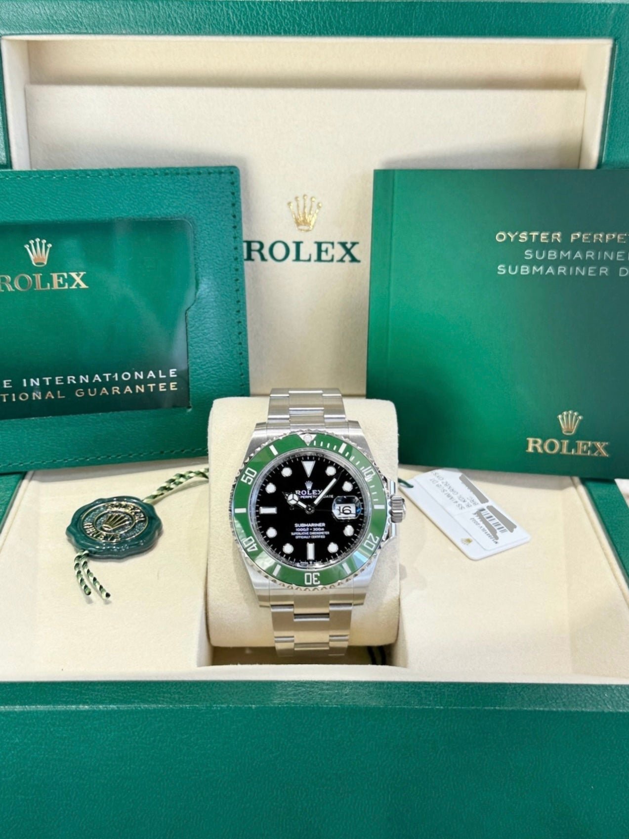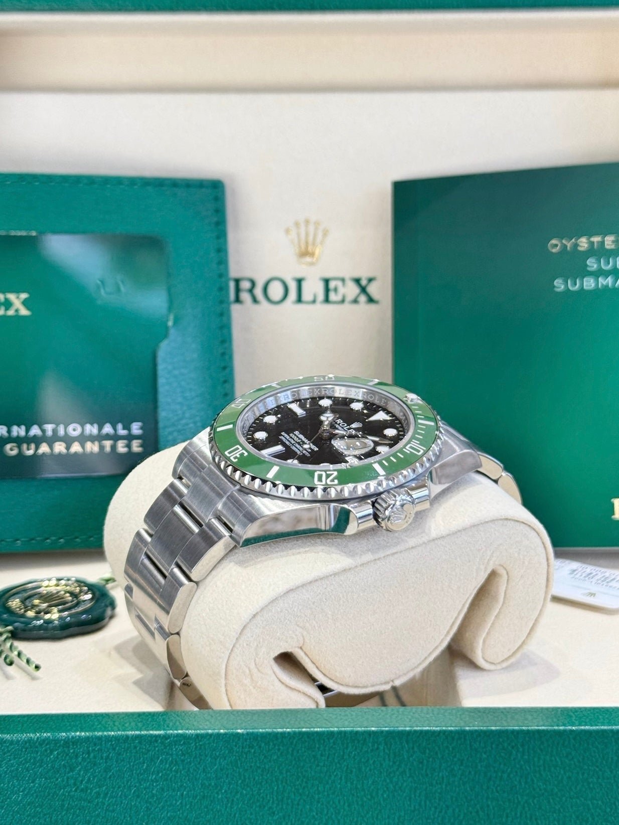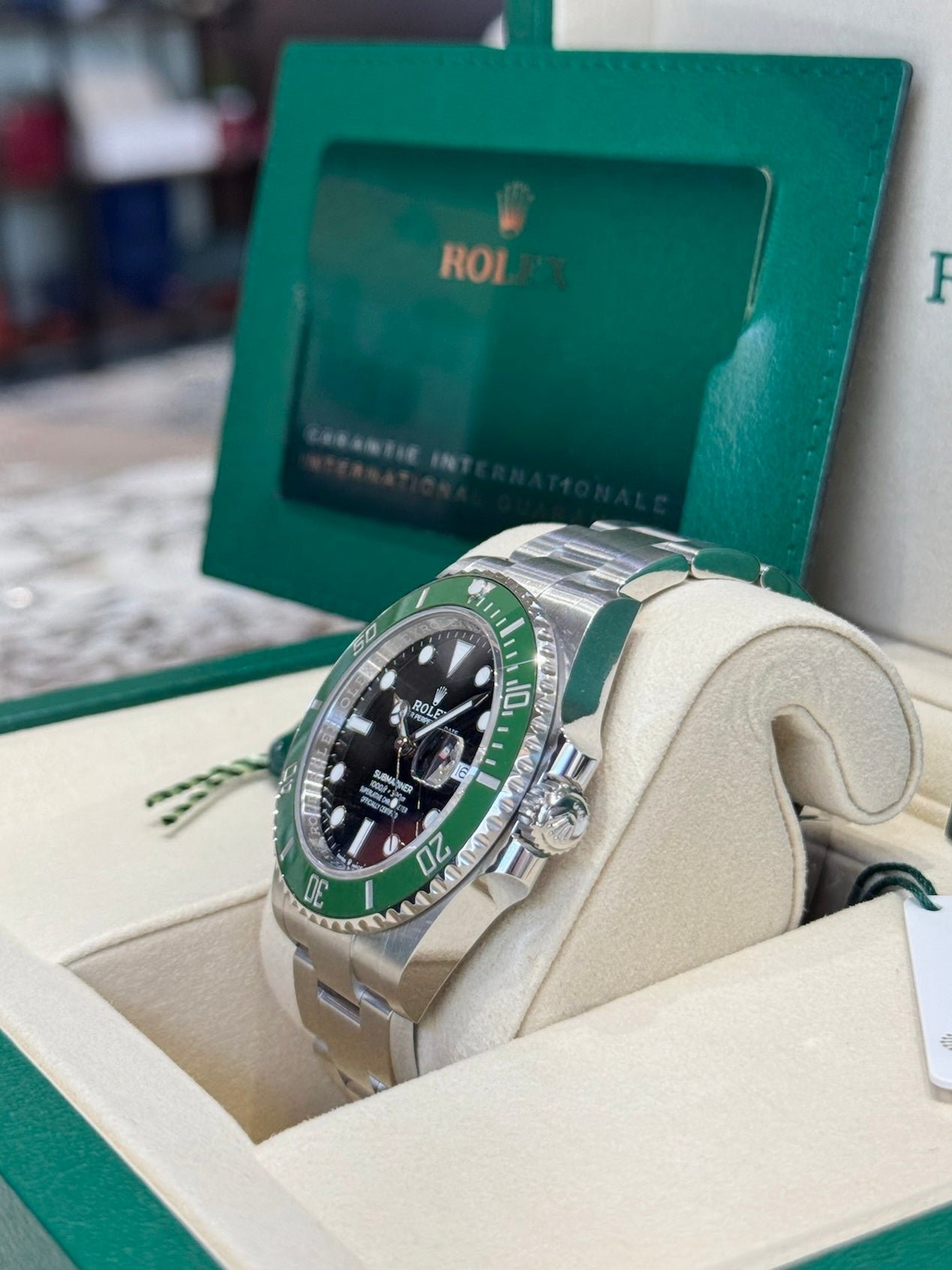 Bezel: Unidirectional green ceramic bezel with 60 minute graduation. Inner engraved Rolex bezel ring