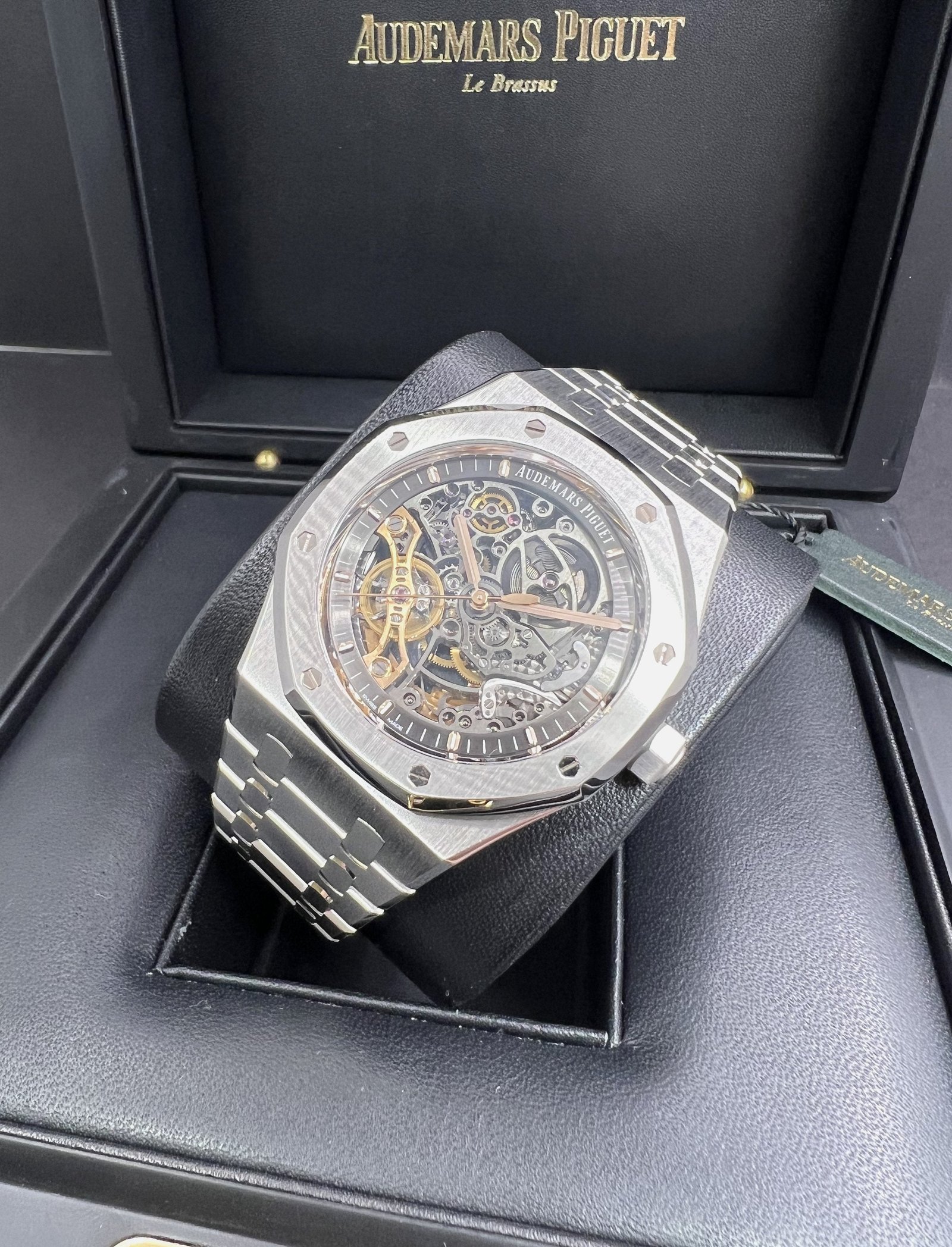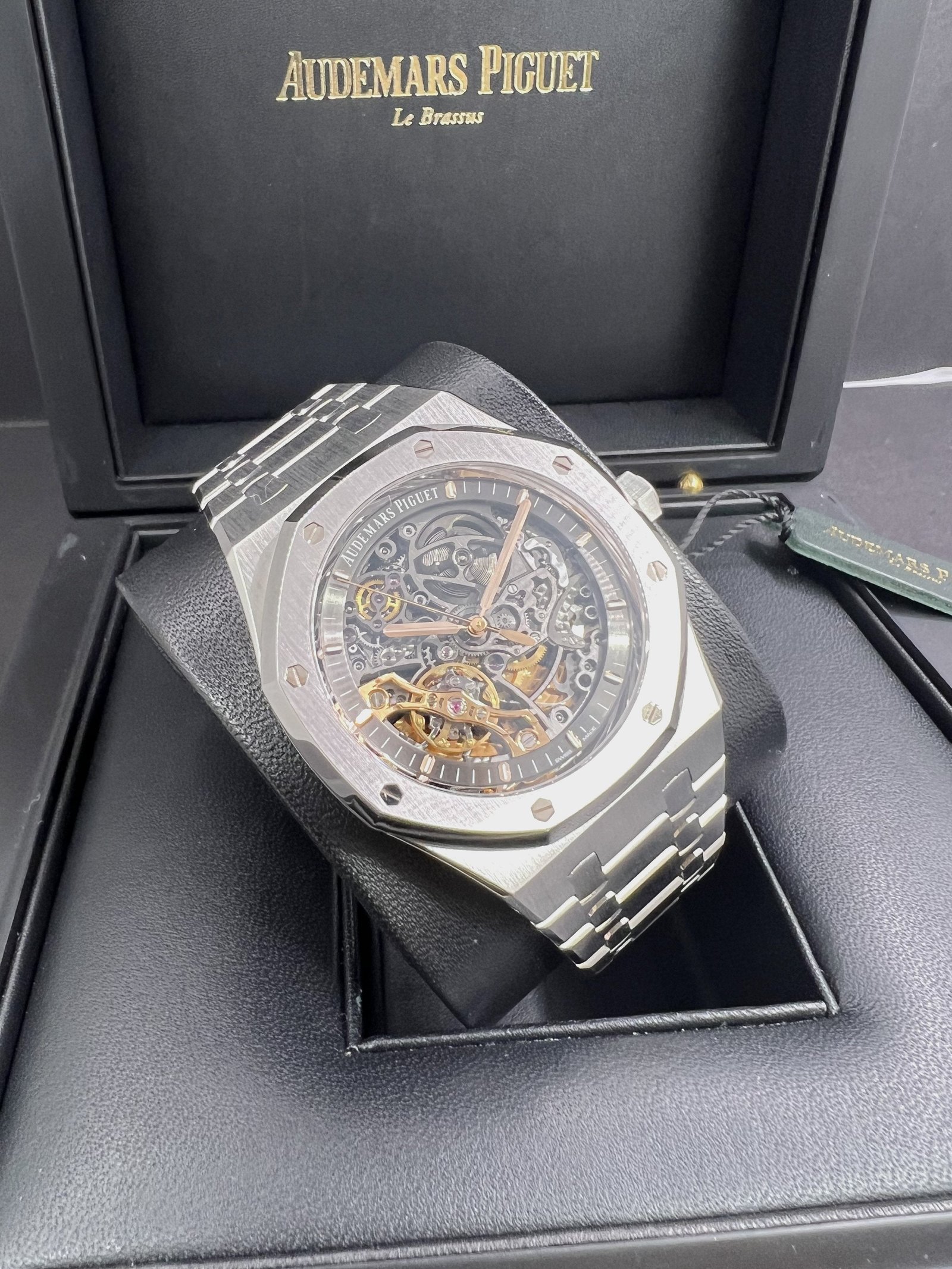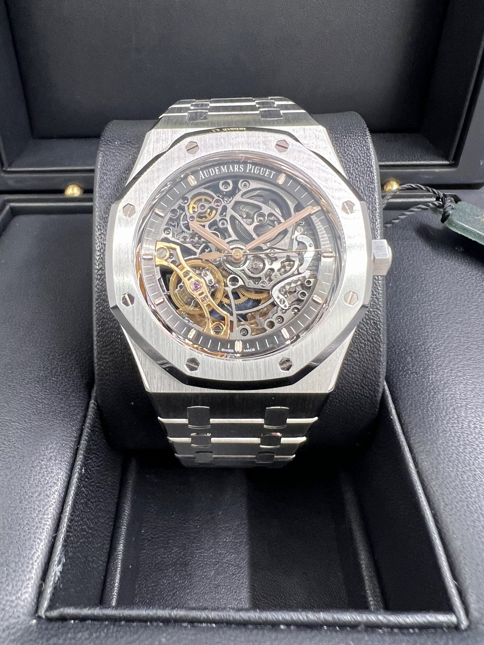 Dial: Slate grey openworked dial, pink gold applied hour-markers and Royal Oak hands with luminescent coating