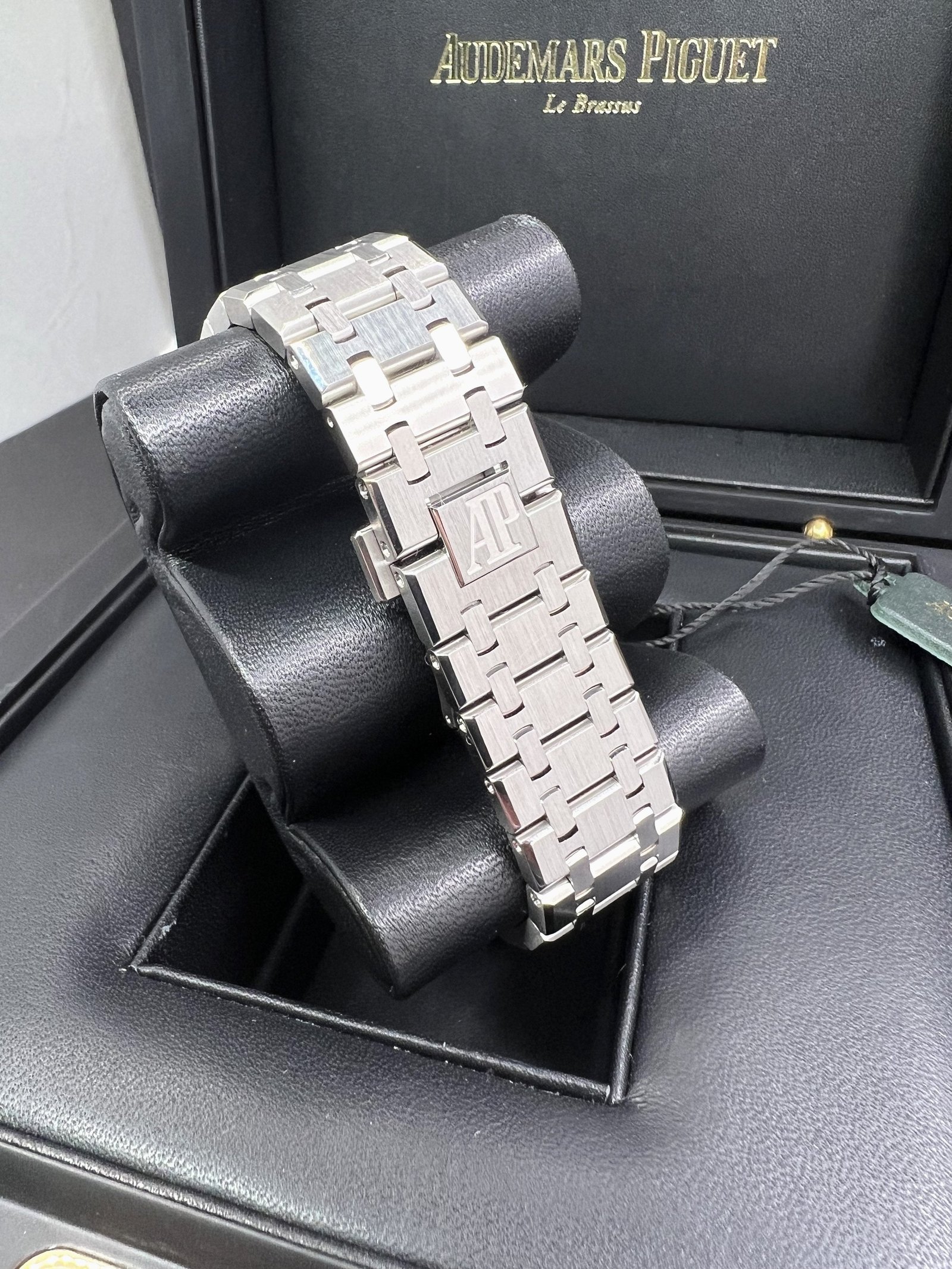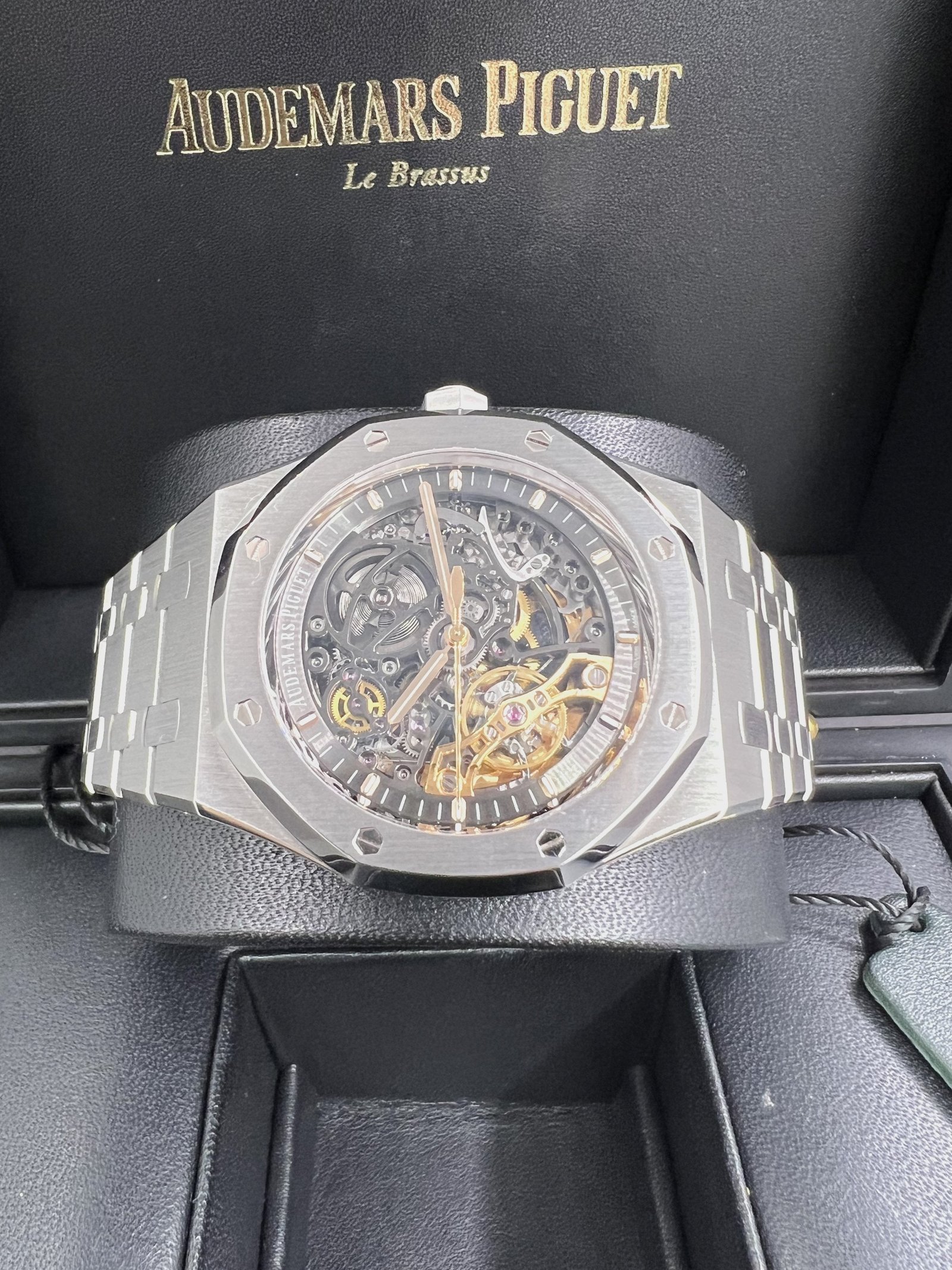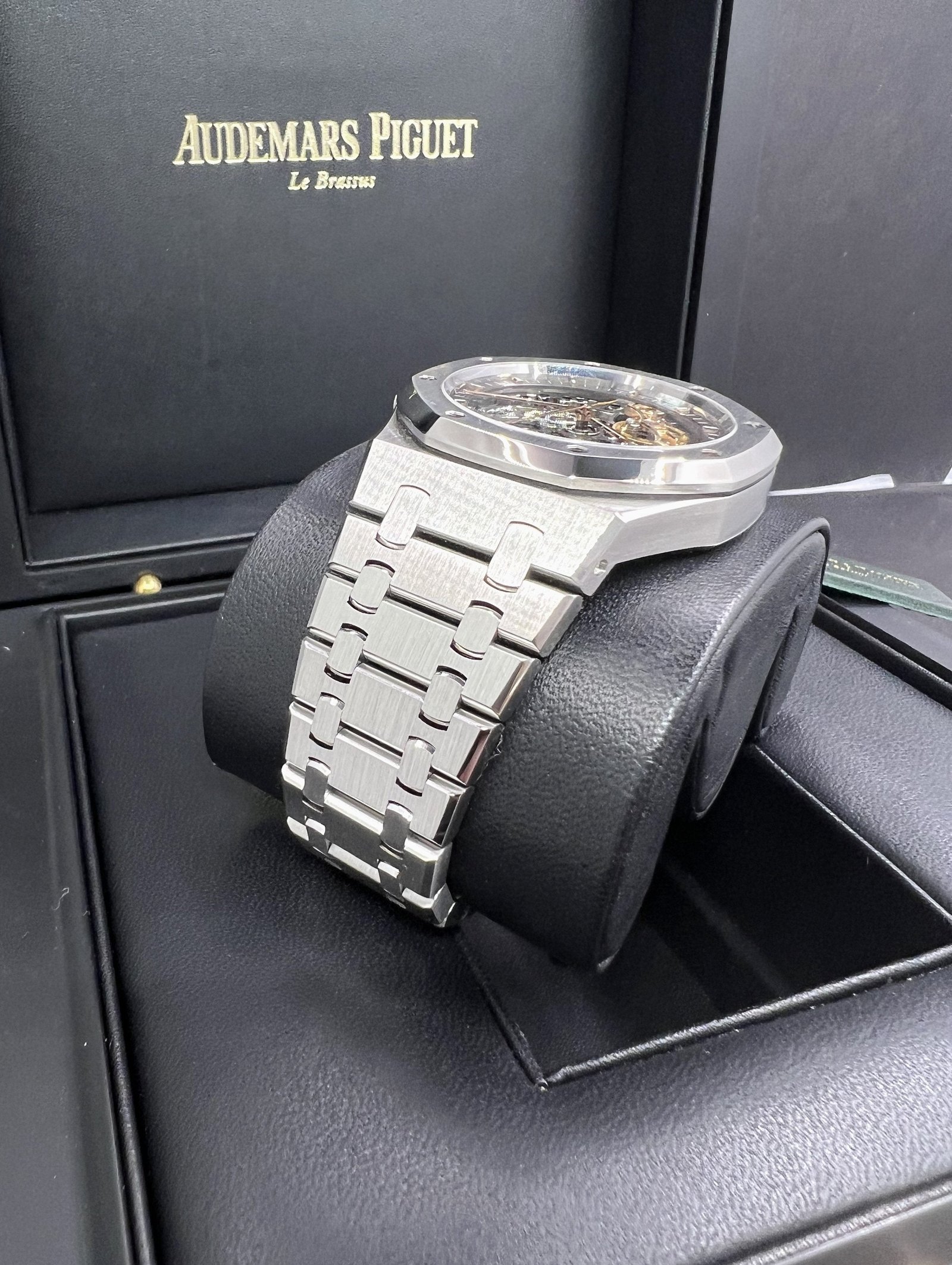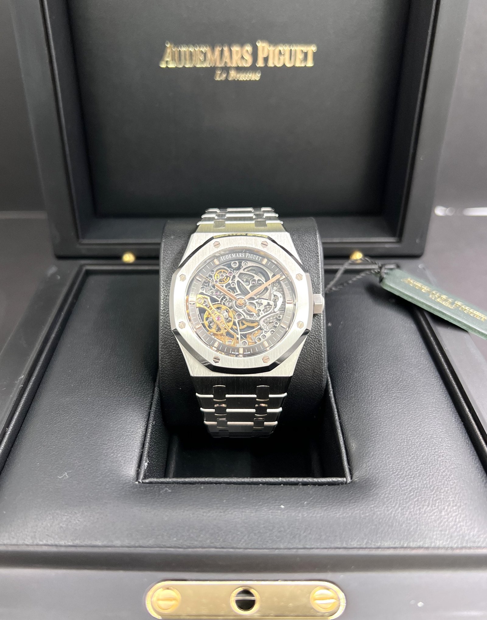 Dial: Slate grey openworked dial, pink gold applied hour-markers and Royal Oak hands with luminescent coating