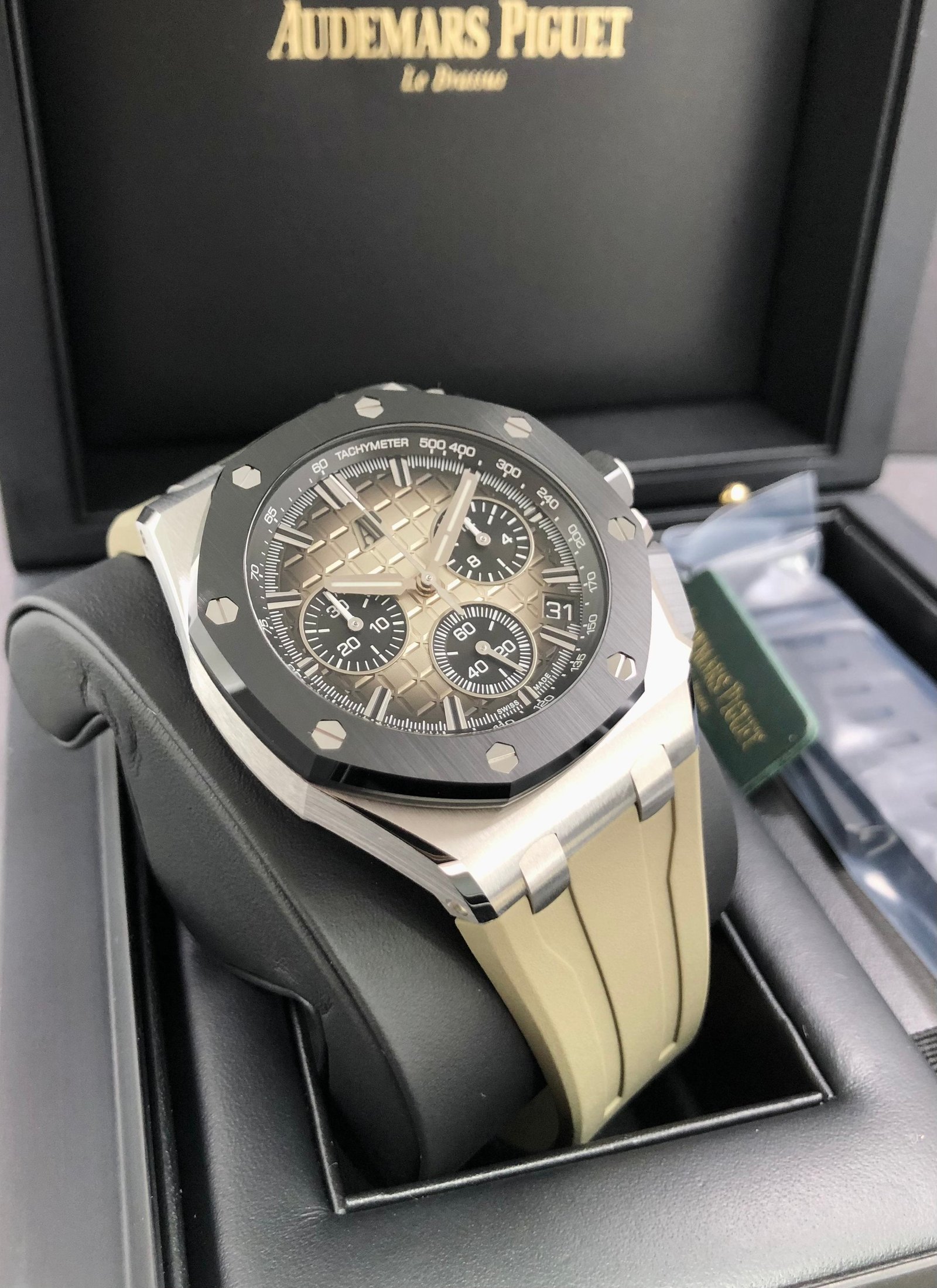 Dial: Smoked taupe dial with “Mega Tapisserie” pattern, black counters and external zone, white gold applied hour-markers and white gold Royal Oak hands with luminescent coating, black inner bezel