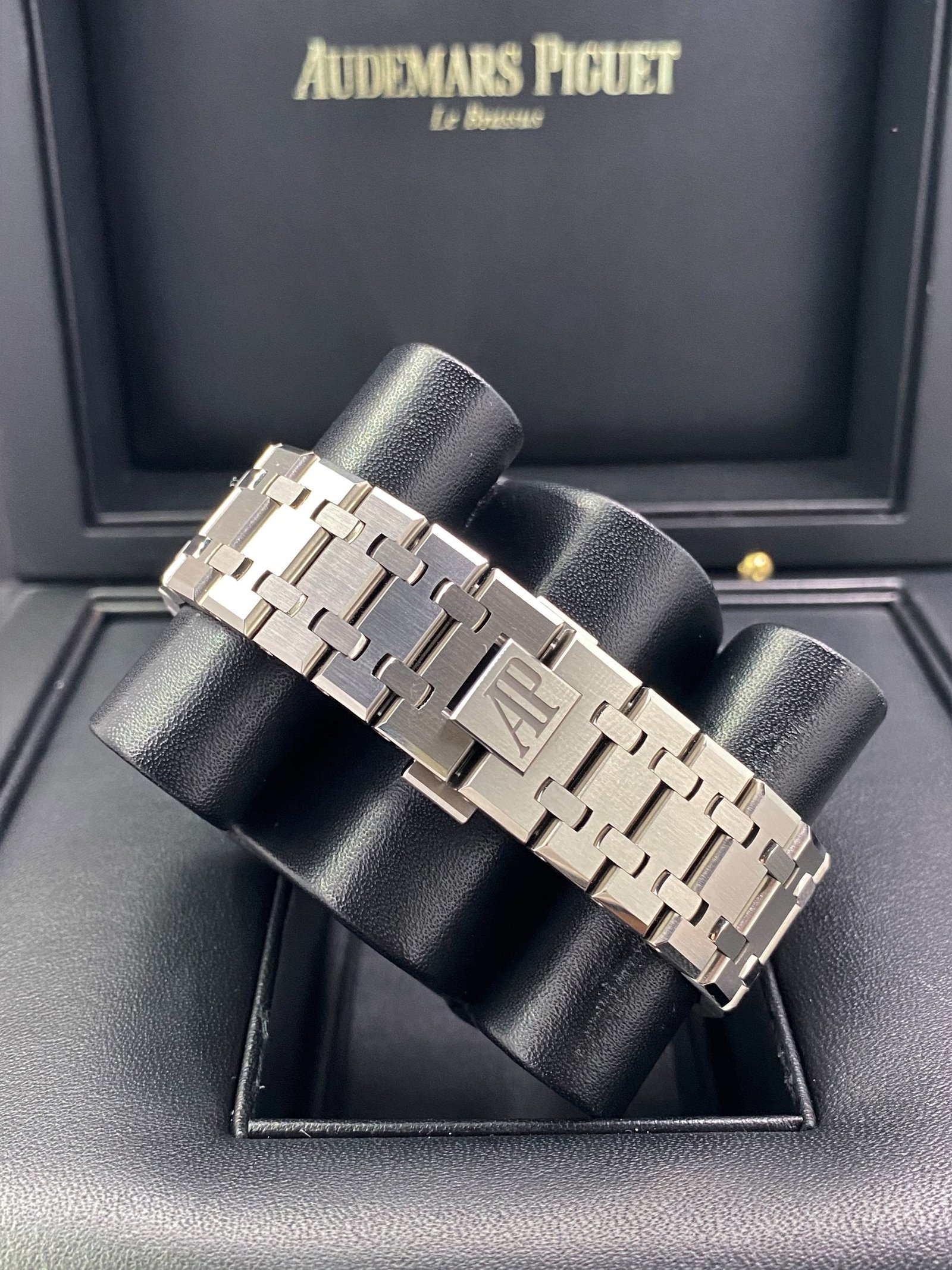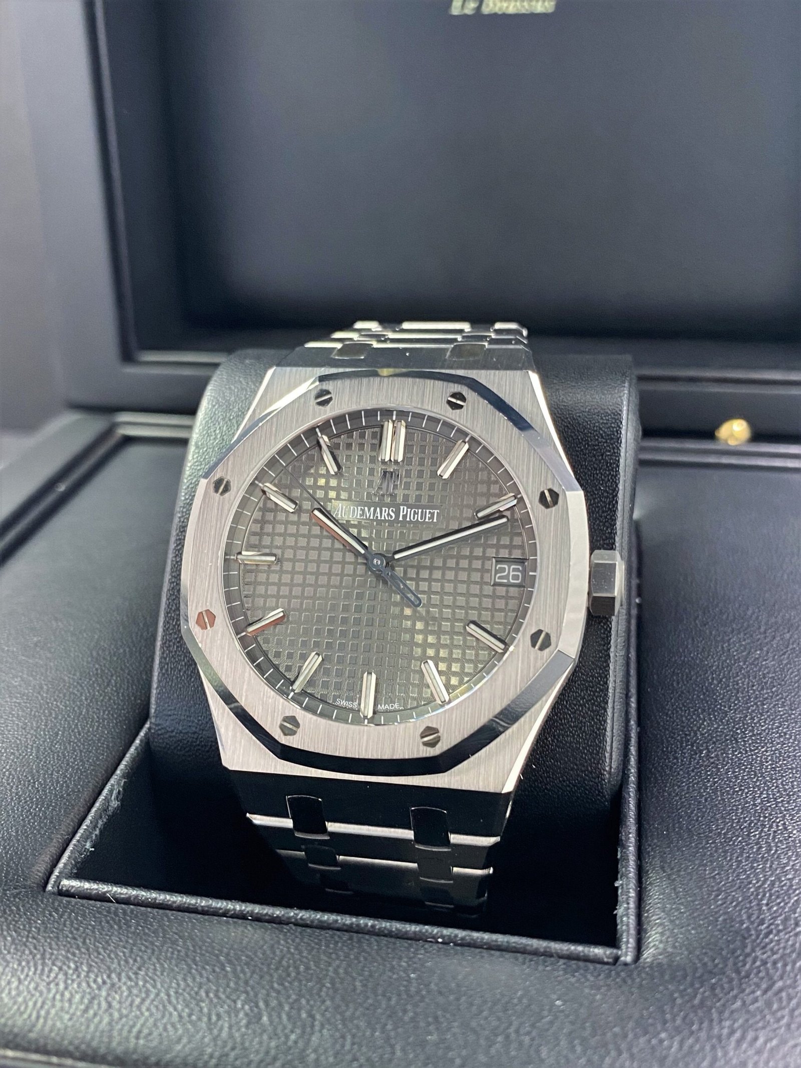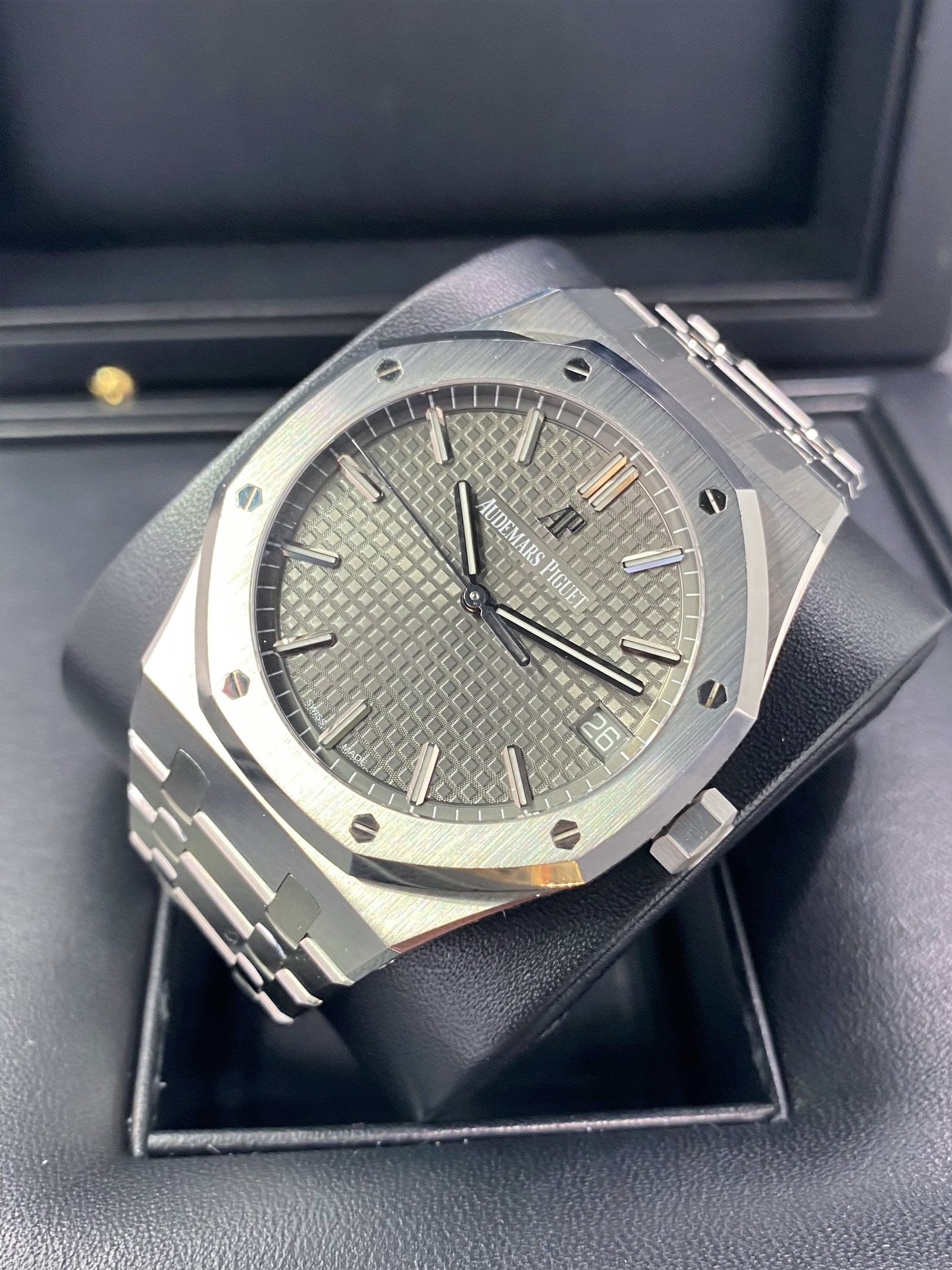 Dial: Slate gray dial with “Grande Tapisserie” pattern, white gold applied hour-markers and Royal Oak hands with luminescent coating