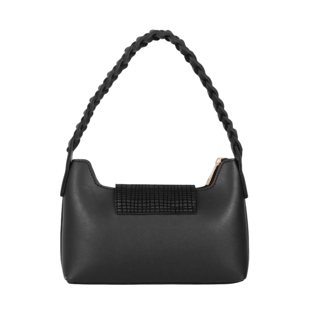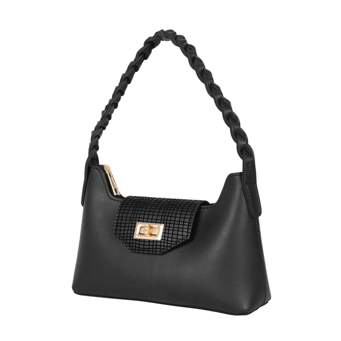 Add elegance to your wardrobe with this black braided handle shoulder handbag, crafted from durable faux leather. Designed with a sleek silhouette, it features a secure twist-lock closure over the main zipper compartment, combining style with functionality. The short braided handle offers a chic touch, making it the perfect accessory for casual outings or evening wear.