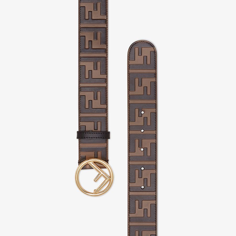 Wide belt with buckle in the shape of the F is Fendi logo. Stud-buckle fastening. Made from brown leather. Finished with embossed and hand-painted FF motif.. Gold-finish metalware.