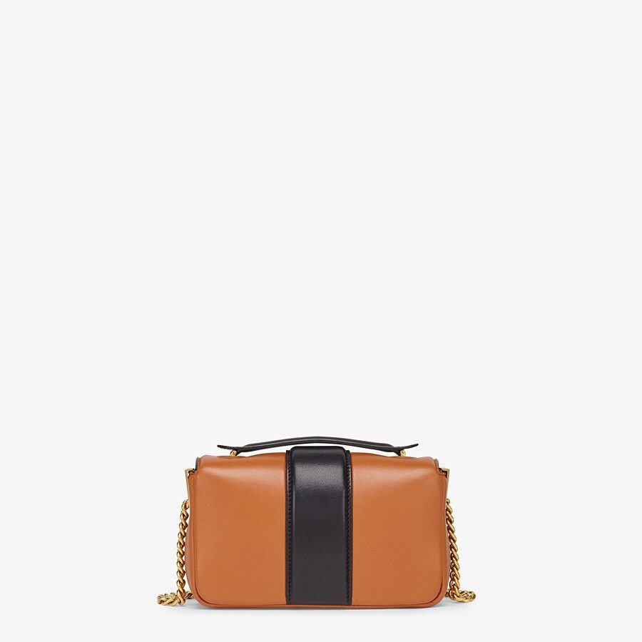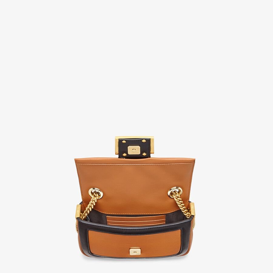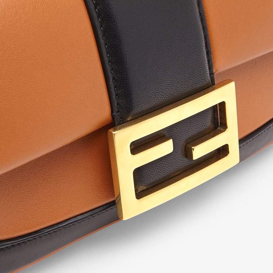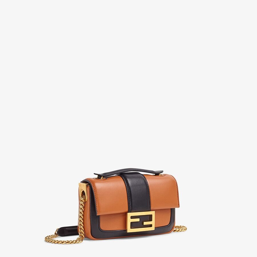 Mini Baguette bag with sliding chain made from brown nappa leather finished with black nappa leather details. Decorated with an FF clasp.