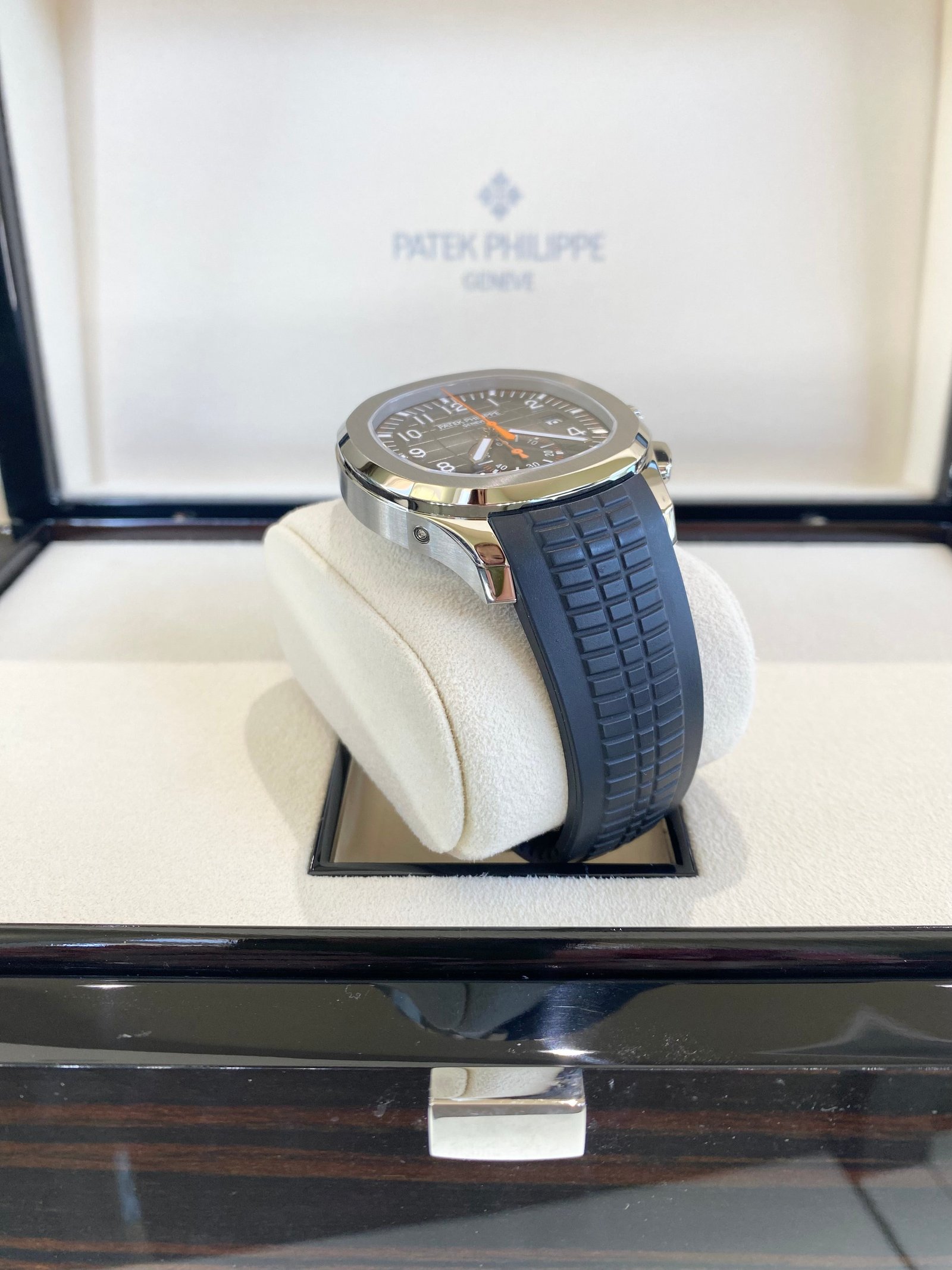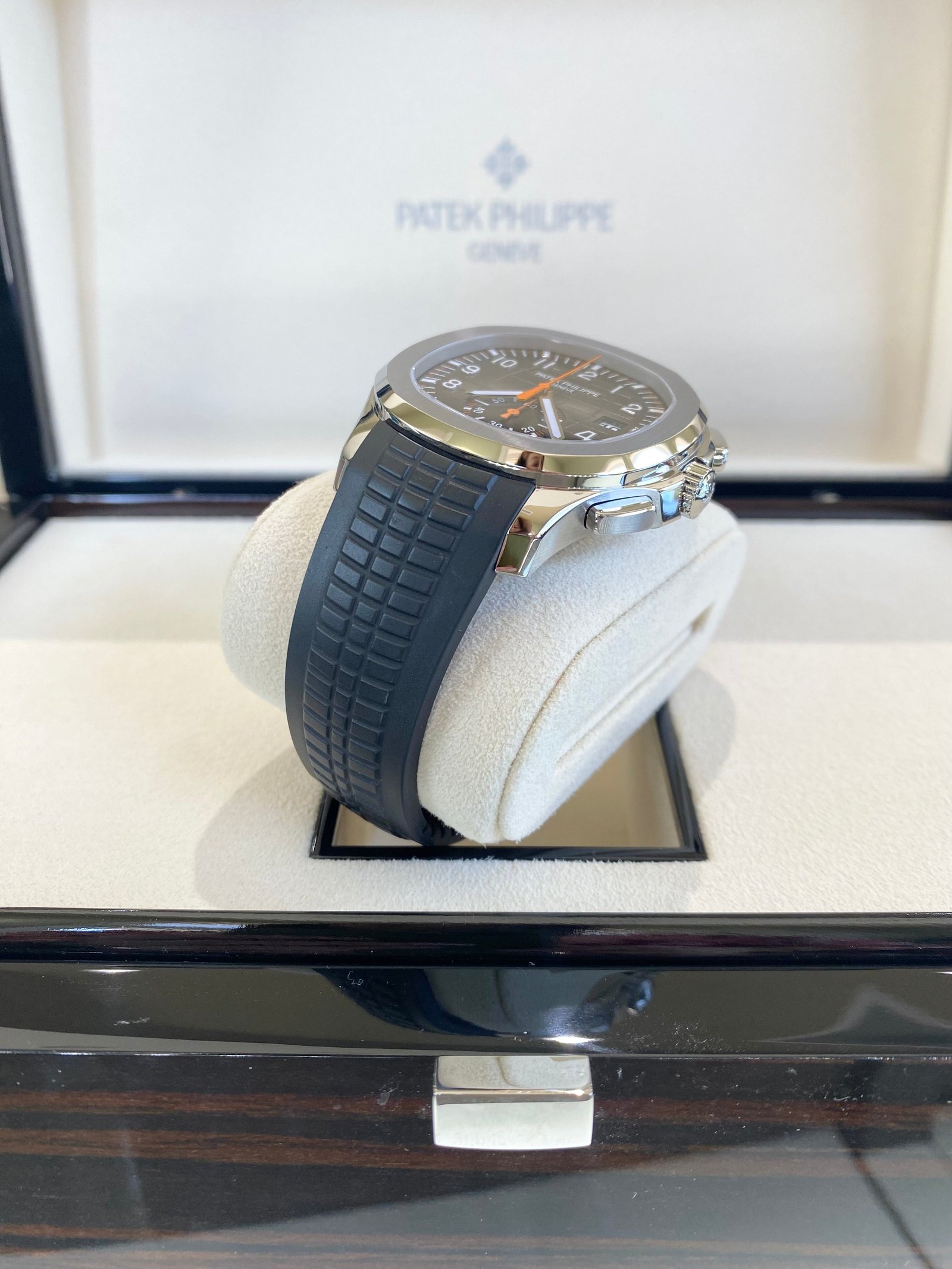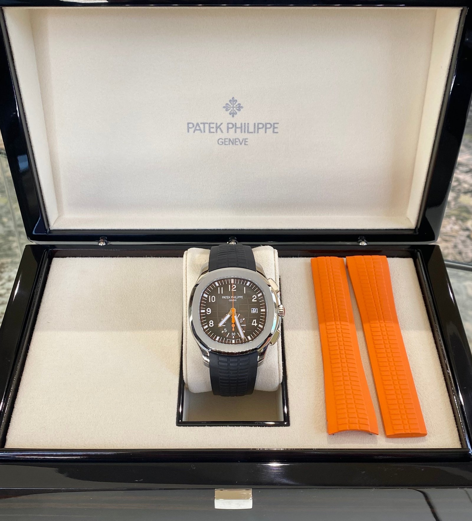 Bracelet: Composite black strap with Aquanaut fold-over clasp, with additional orange composite strap