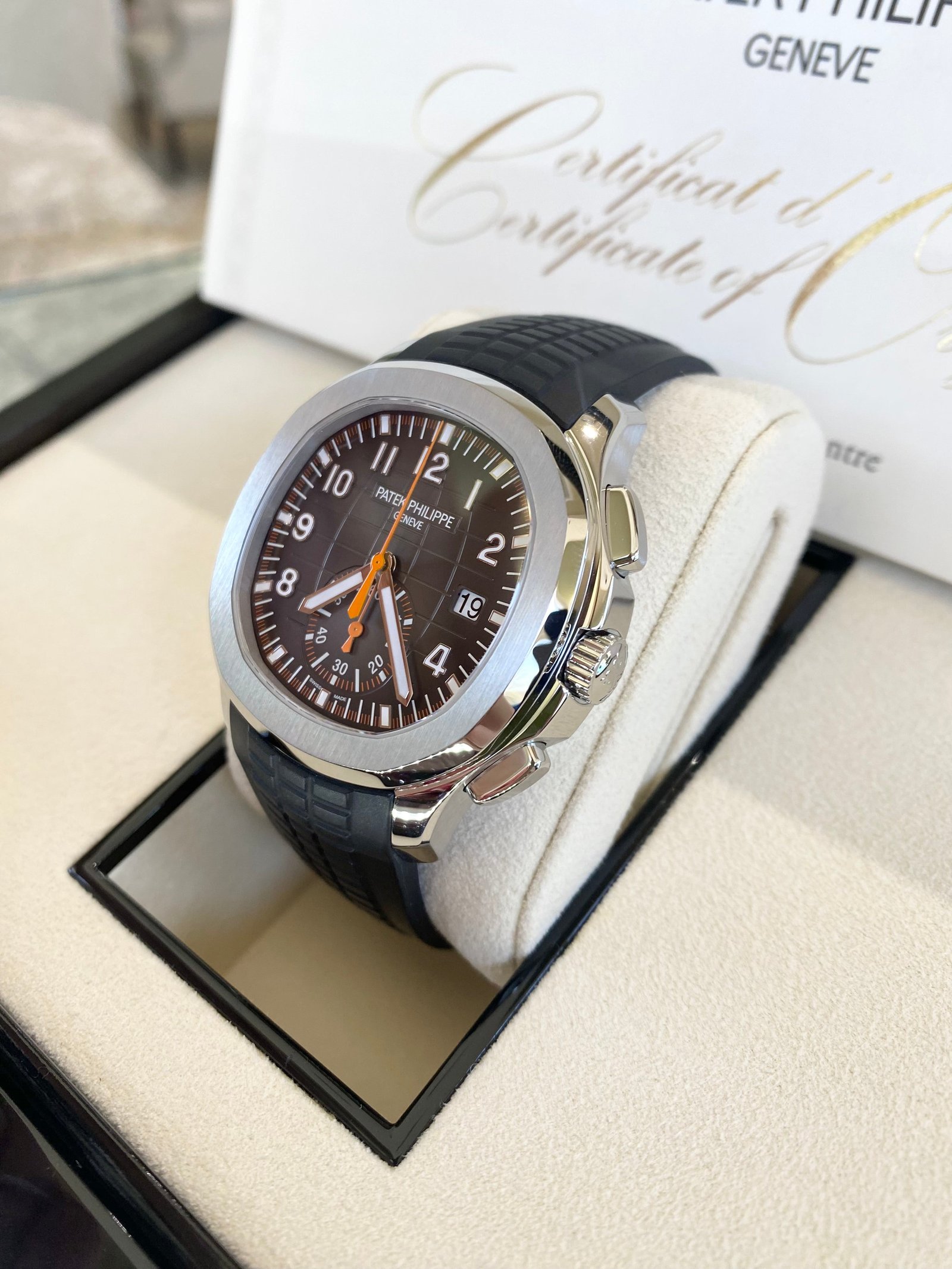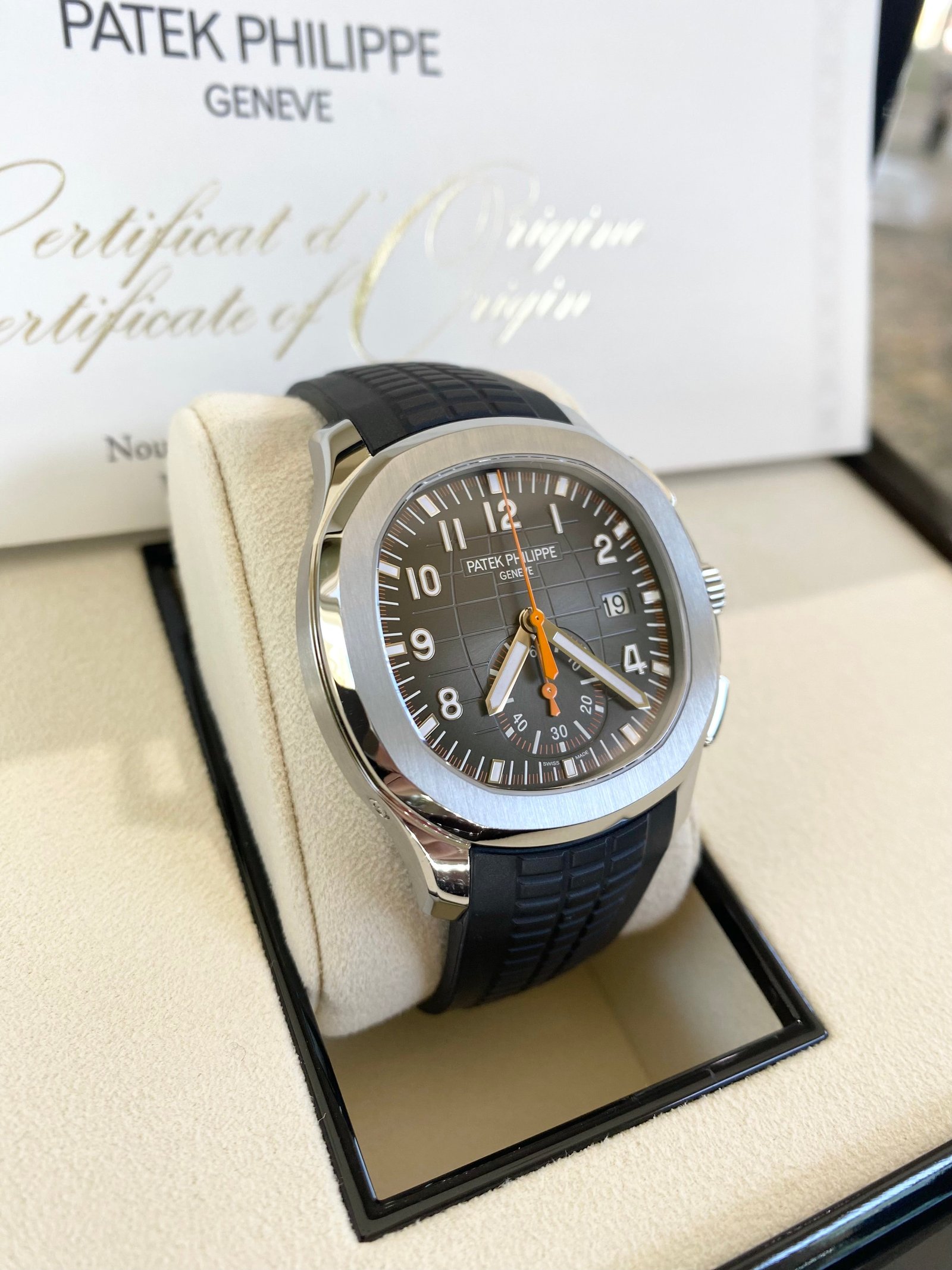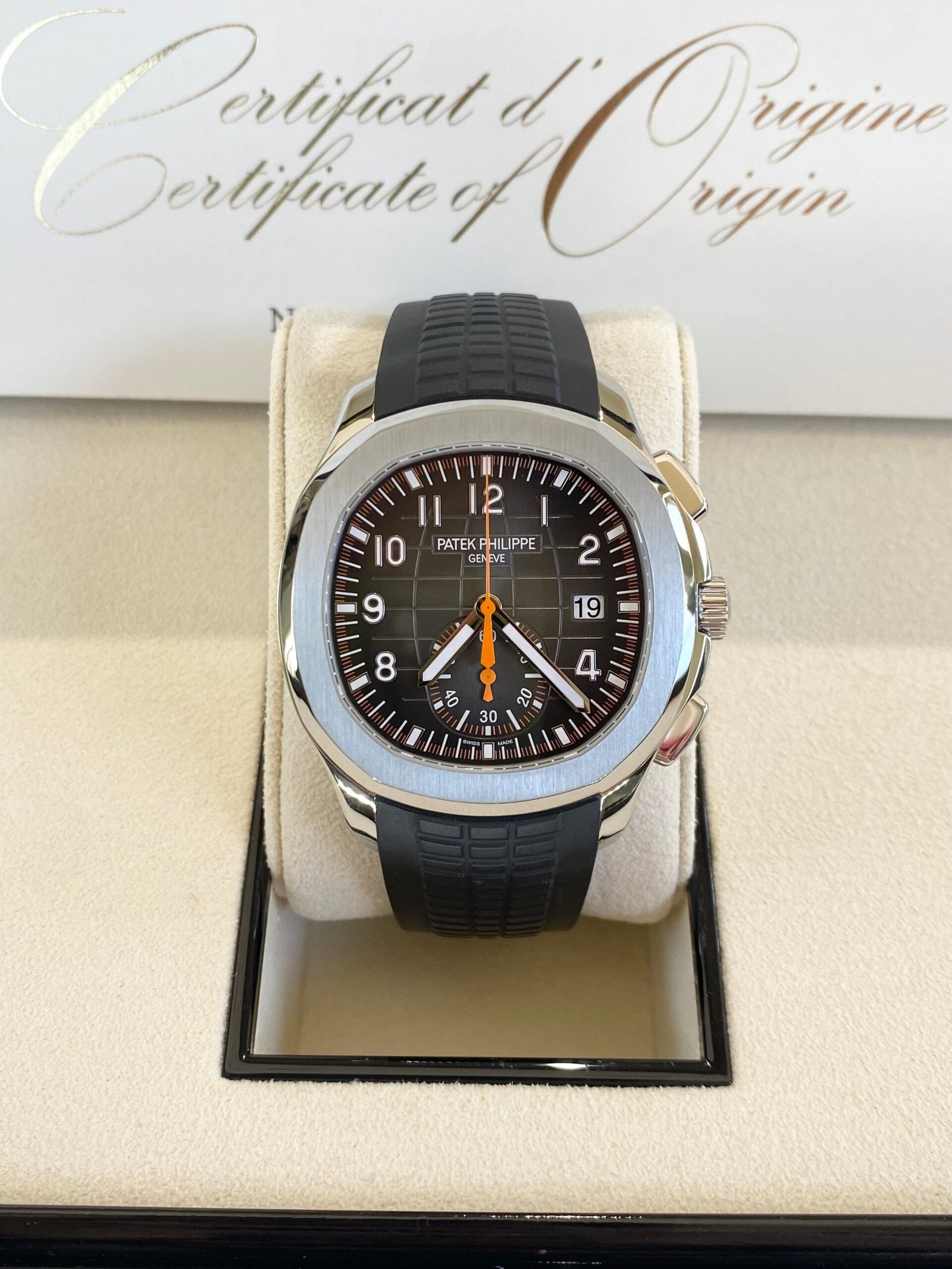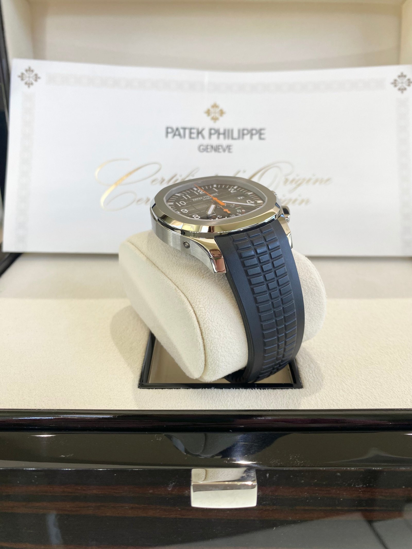 Bracelet: Composite black strap with Aquanaut fold-over clasp, with additional orange composite strap