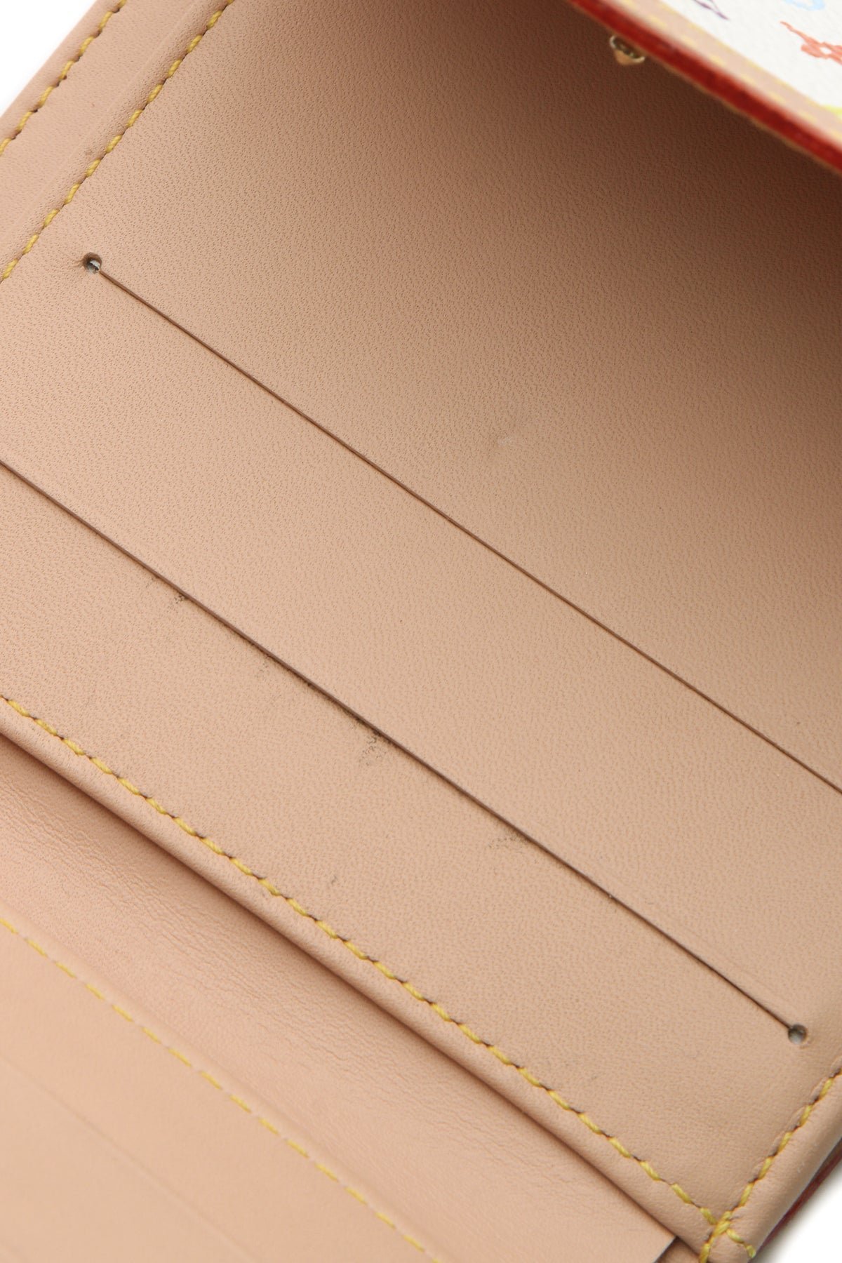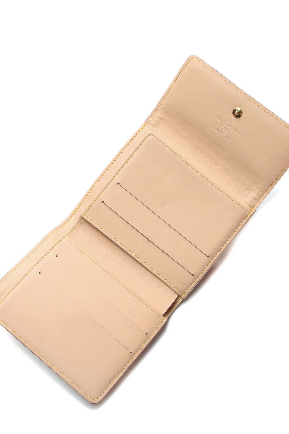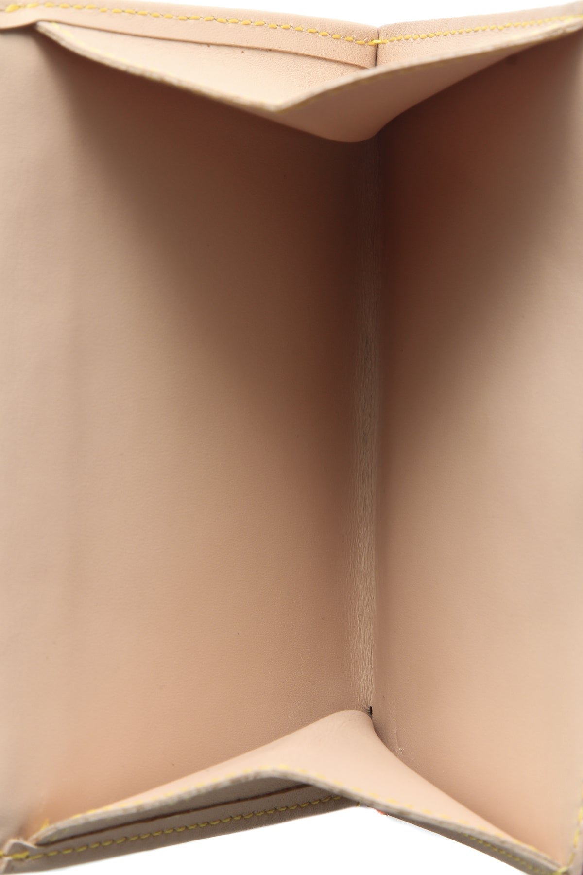 This wallet is in great condition with a medium honey patina, discoloration, and creasing on the Vachetta leather, with creasing/dents and discoloration on the interior lining and scratches on the hardware .