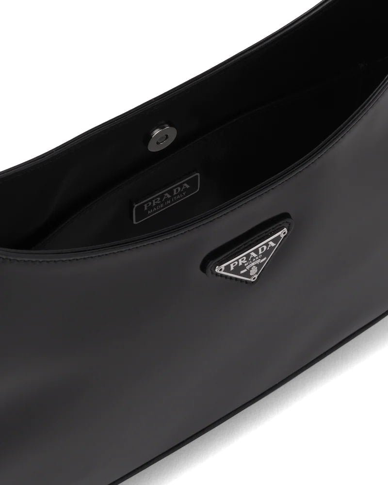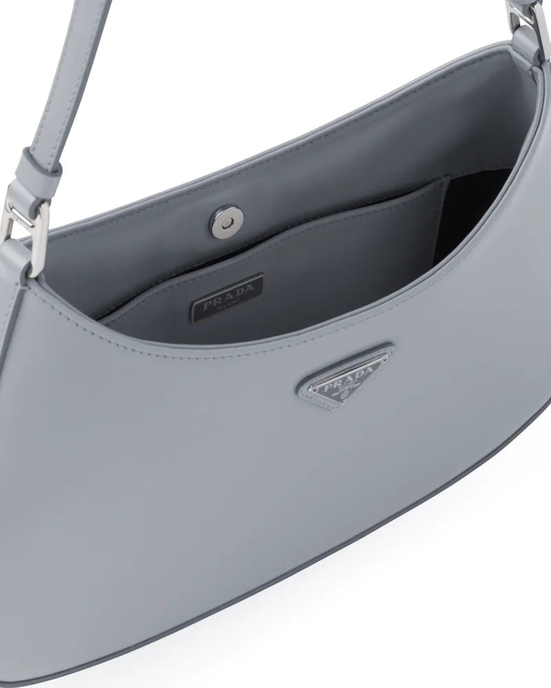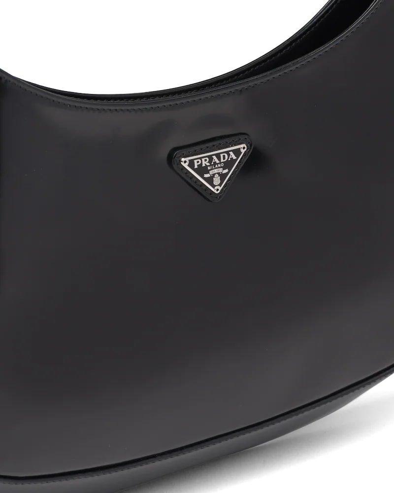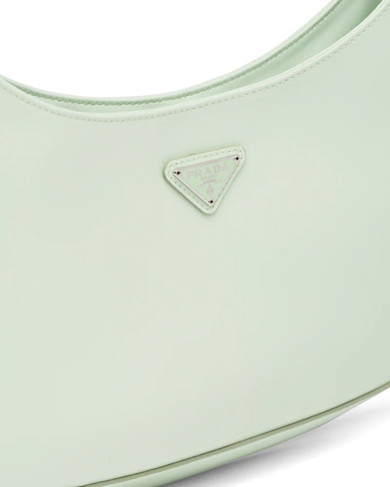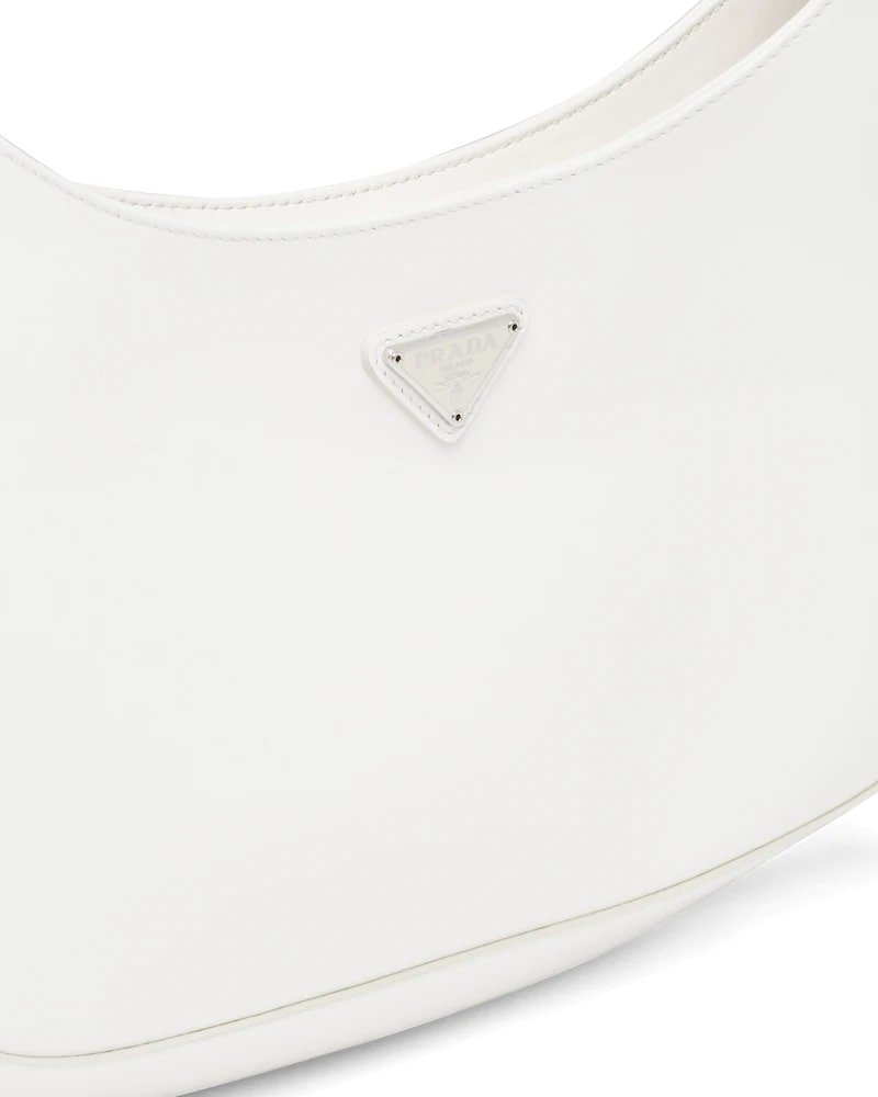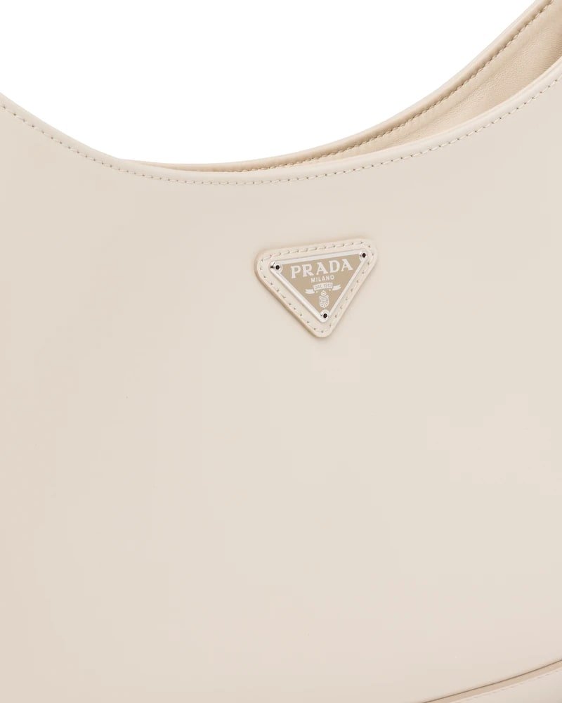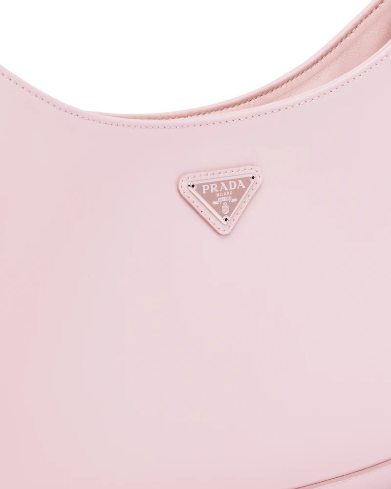 The Prada Cleo bag with sophisticated allure reinterprets an iconic design of the brand from the 1990’s. Sleek curved lines emphasized by the particular construction rounded on the bottom and sides give this hobo bag a soft, light look. Brushed leather, a modern and versatile material that is distinctive in Prada collections, is ideal for creating always new combinations and contrasts. The enamel triangle logo decorates the silhouette.