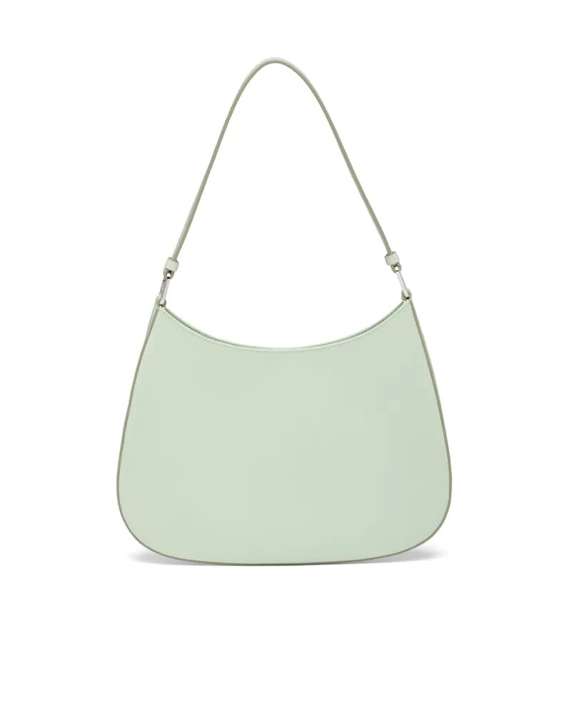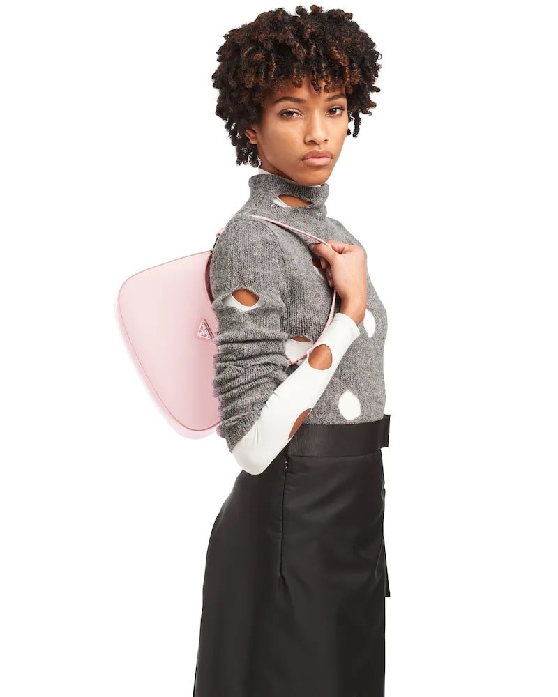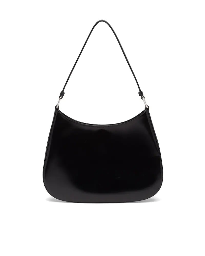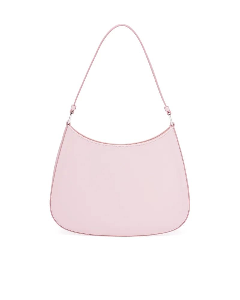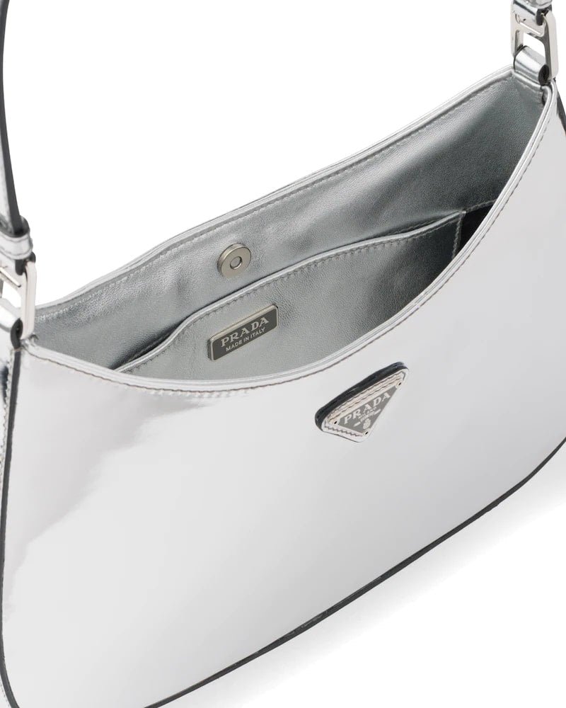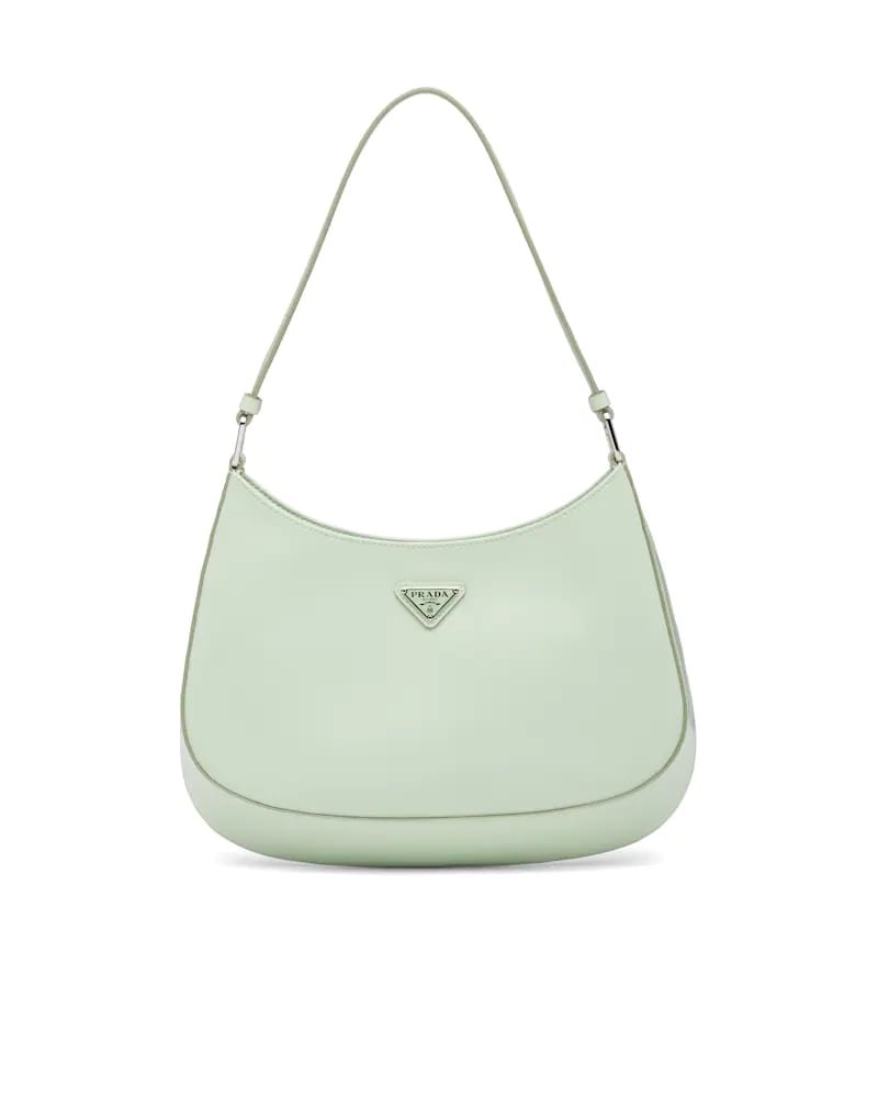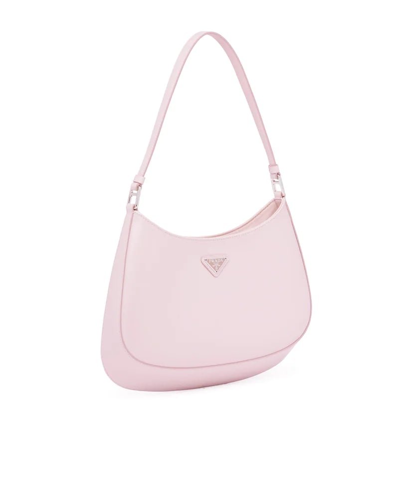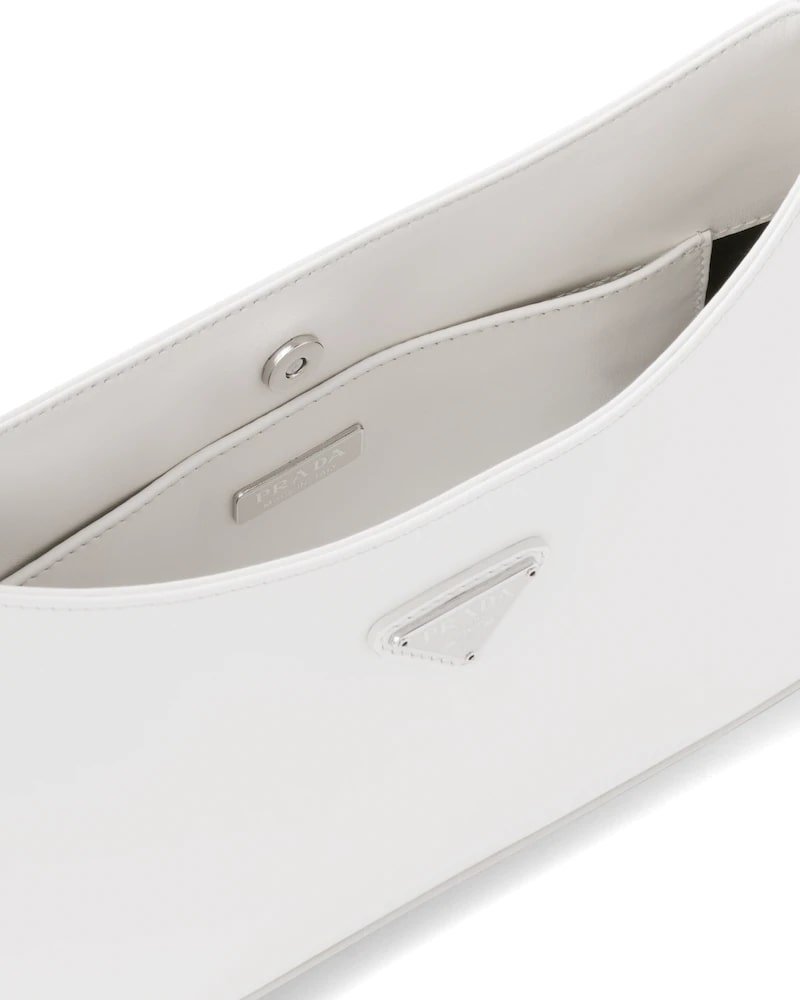 The Prada Cleo bag with sophisticated allure reinterprets an iconic design of the brand from the 1990’s. Sleek curved lines emphasized by the particular construction rounded on the bottom and sides give this hobo bag a soft, light look. Brushed leather, a modern and versatile material that is distinctive in Prada collections, is ideal for creating always new combinations and contrasts. The enamel triangle logo decorates the silhouette.