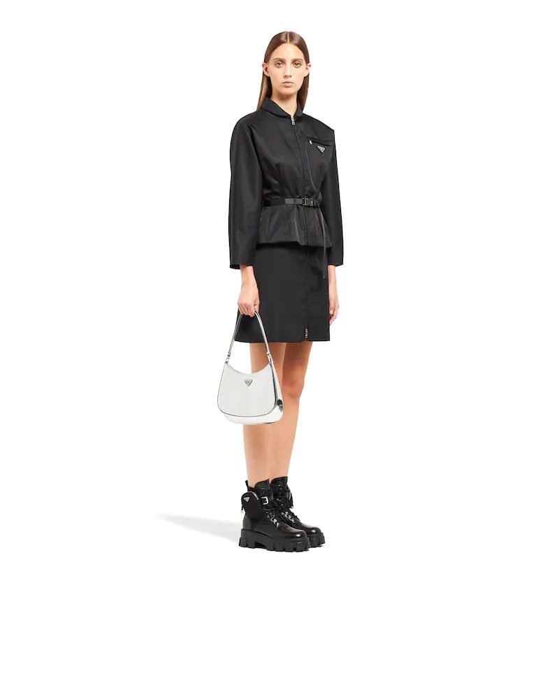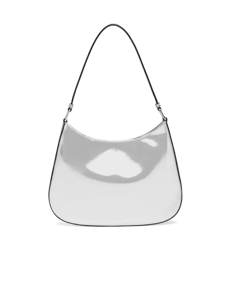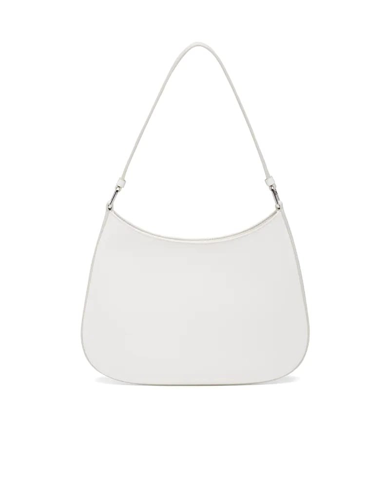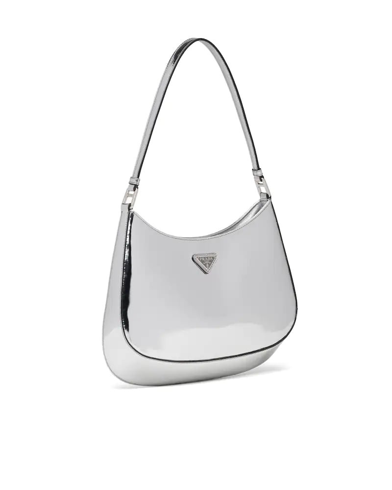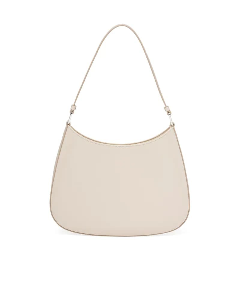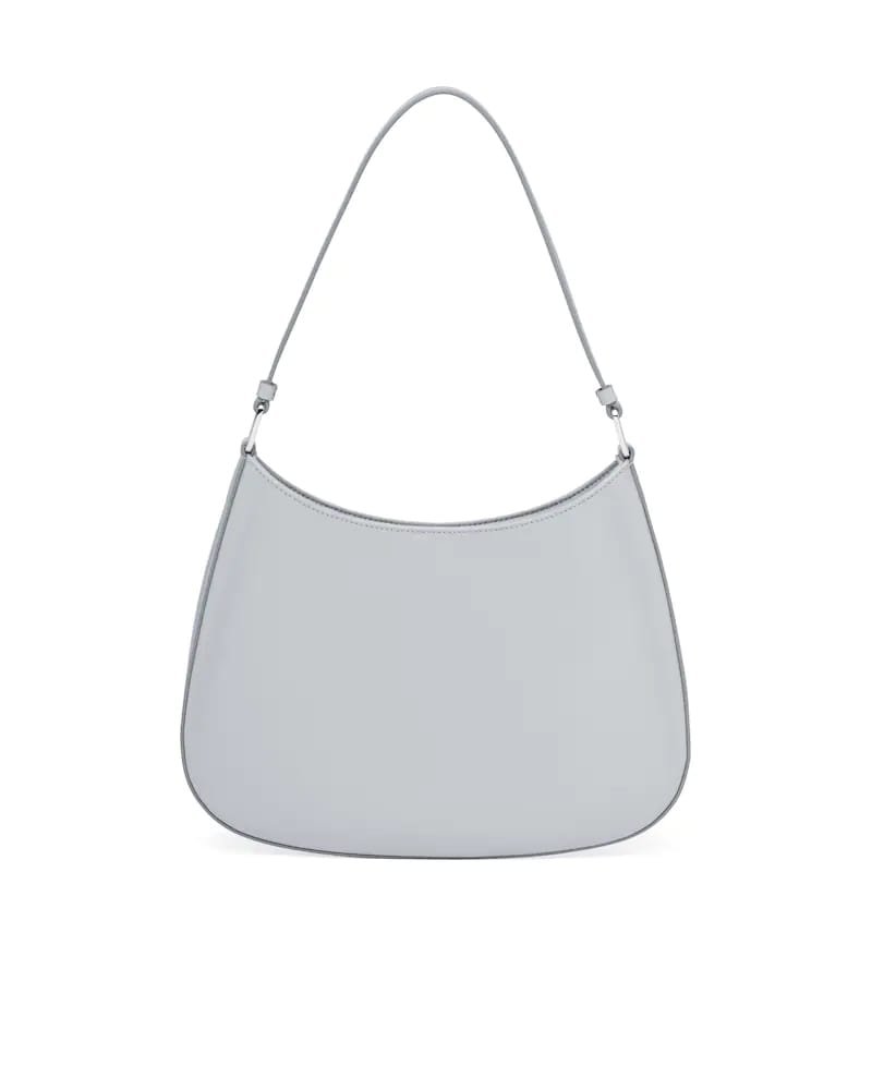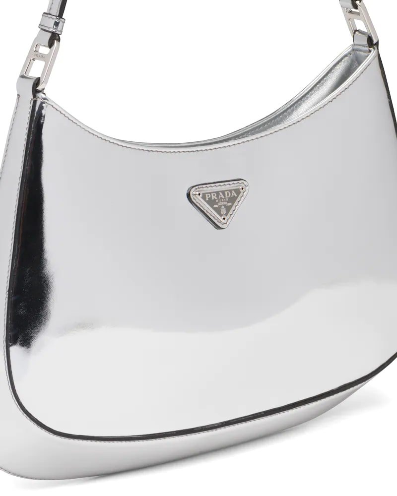 The Prada Cleo bag with sophisticated allure reinterprets an iconic design of the brand from the 1990’s. Sleek curved lines emphasized by the particular construction rounded on the bottom and sides give this hobo bag a soft, light look. Brushed leather, a modern and versatile material that is distinctive in Prada collections, is ideal for creating always new combinations and contrasts. The enamel triangle logo decorates the silhouette.