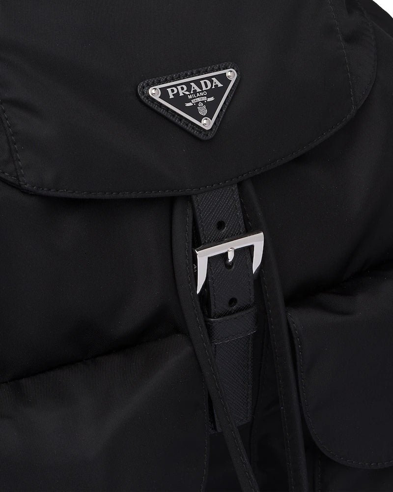 This nylon backpack with refined Saffiano leather trim features a mix of materials, expressing modern charm and timeless elegance. The article is decorated with the metal triangle logo.
