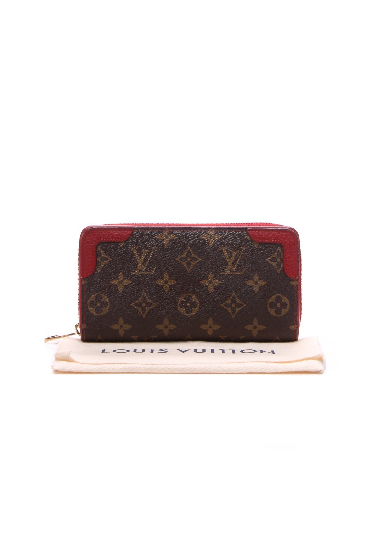 Break away from the ordinary with this authentic Louis Vuitton Retiro wallet. An alluring everyday wallet, this classic piece features an instantly recognizable monogram canvas exterior, cherry red leather trim, and gold-tone hardware. With a spacious interior and multiple pockets to easily store essentials, this wallet is the ideal choice for any modern-day sophisticate.