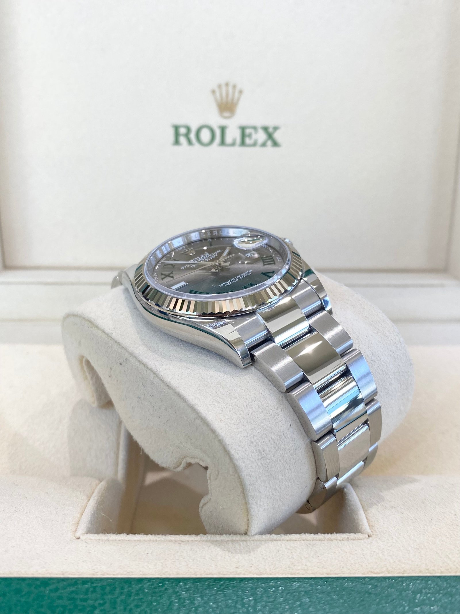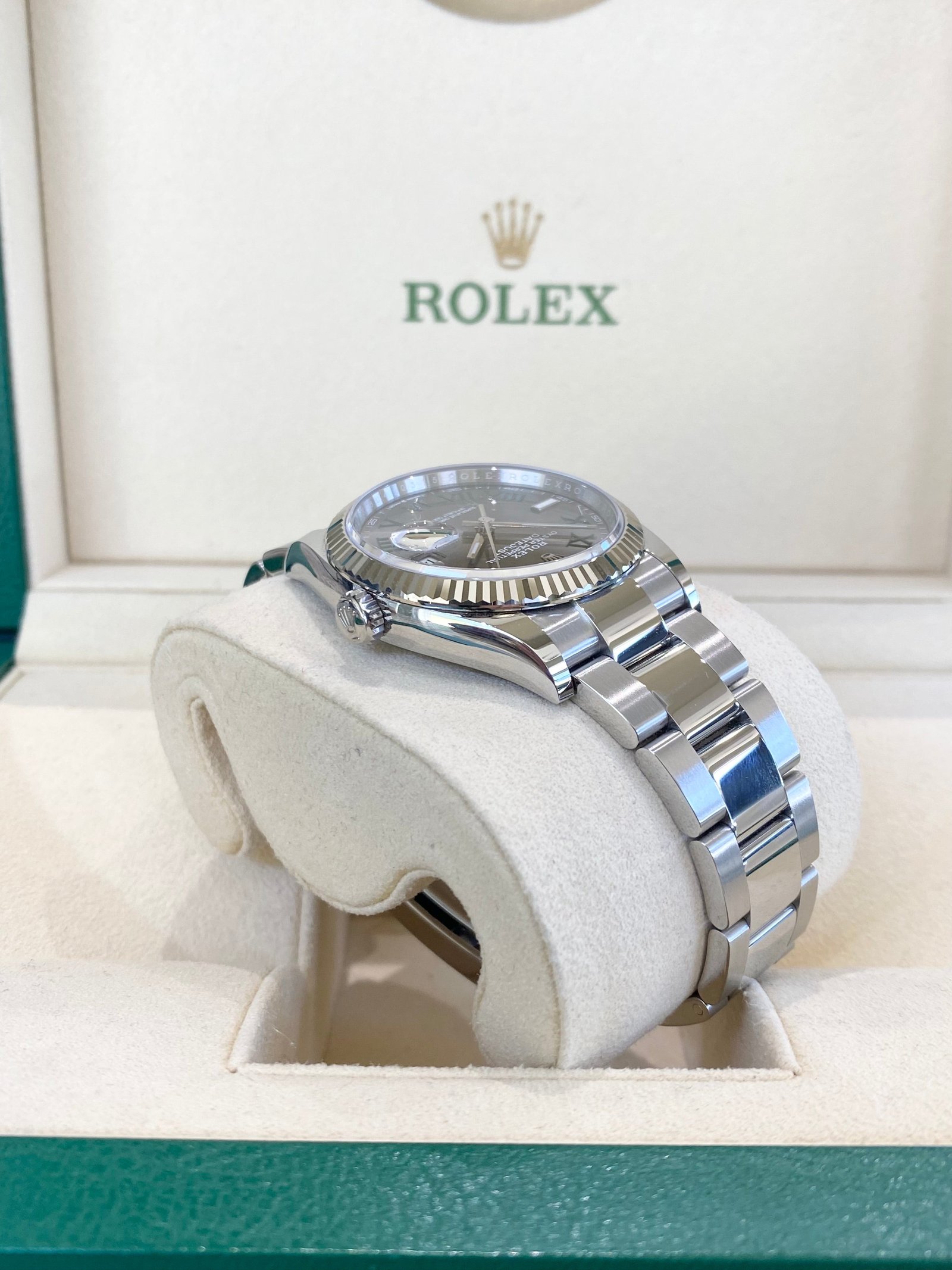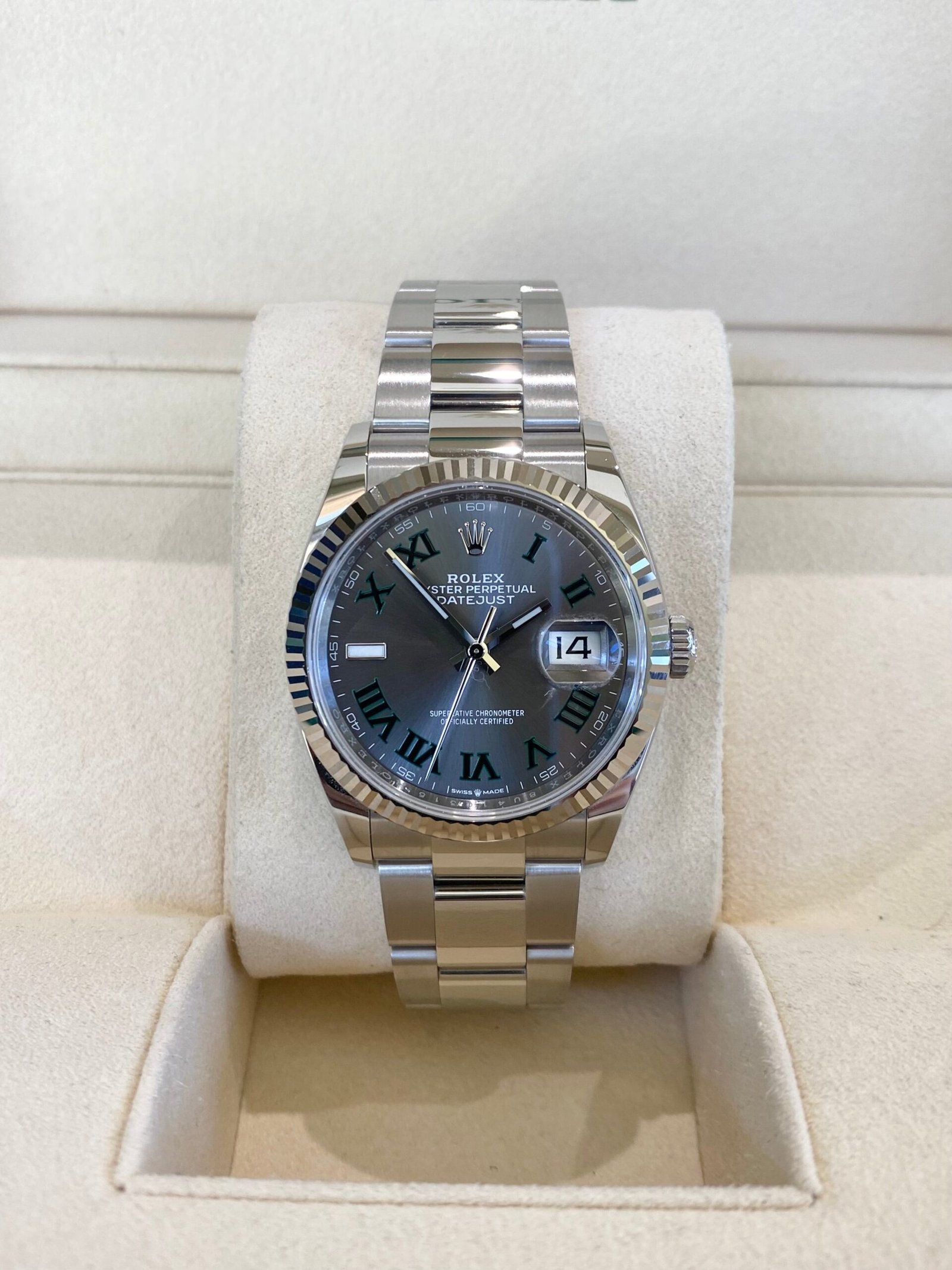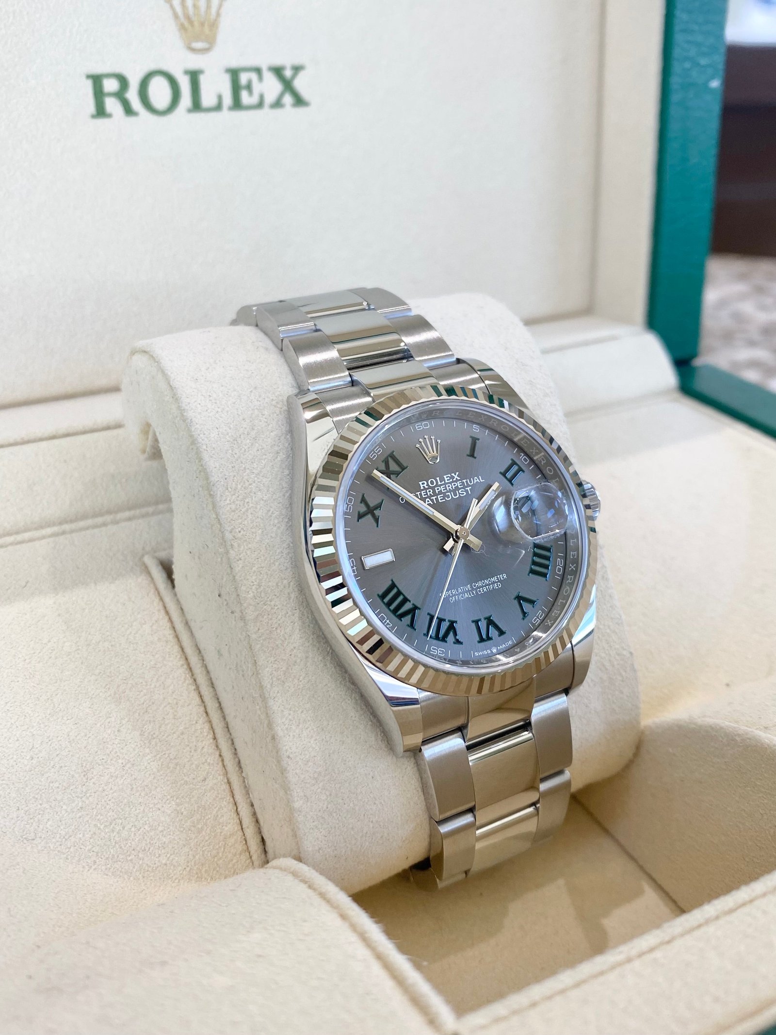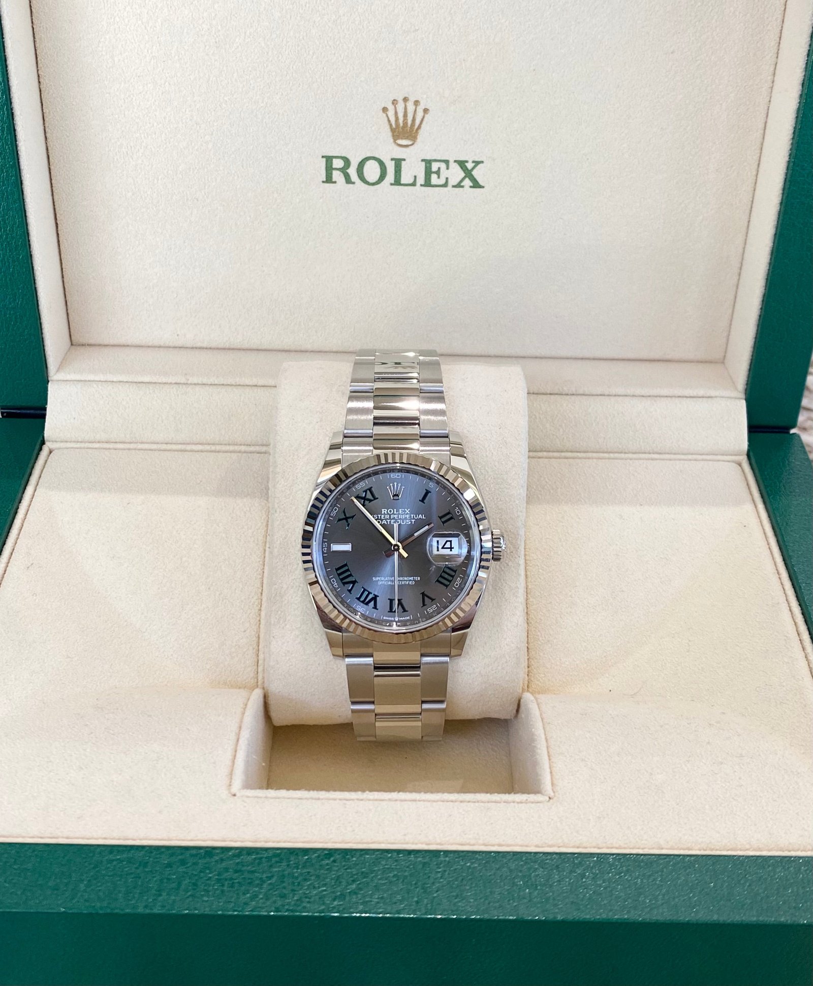 Dial: Slate gray dial with Roman numerals. Date window at 3 o’clock.