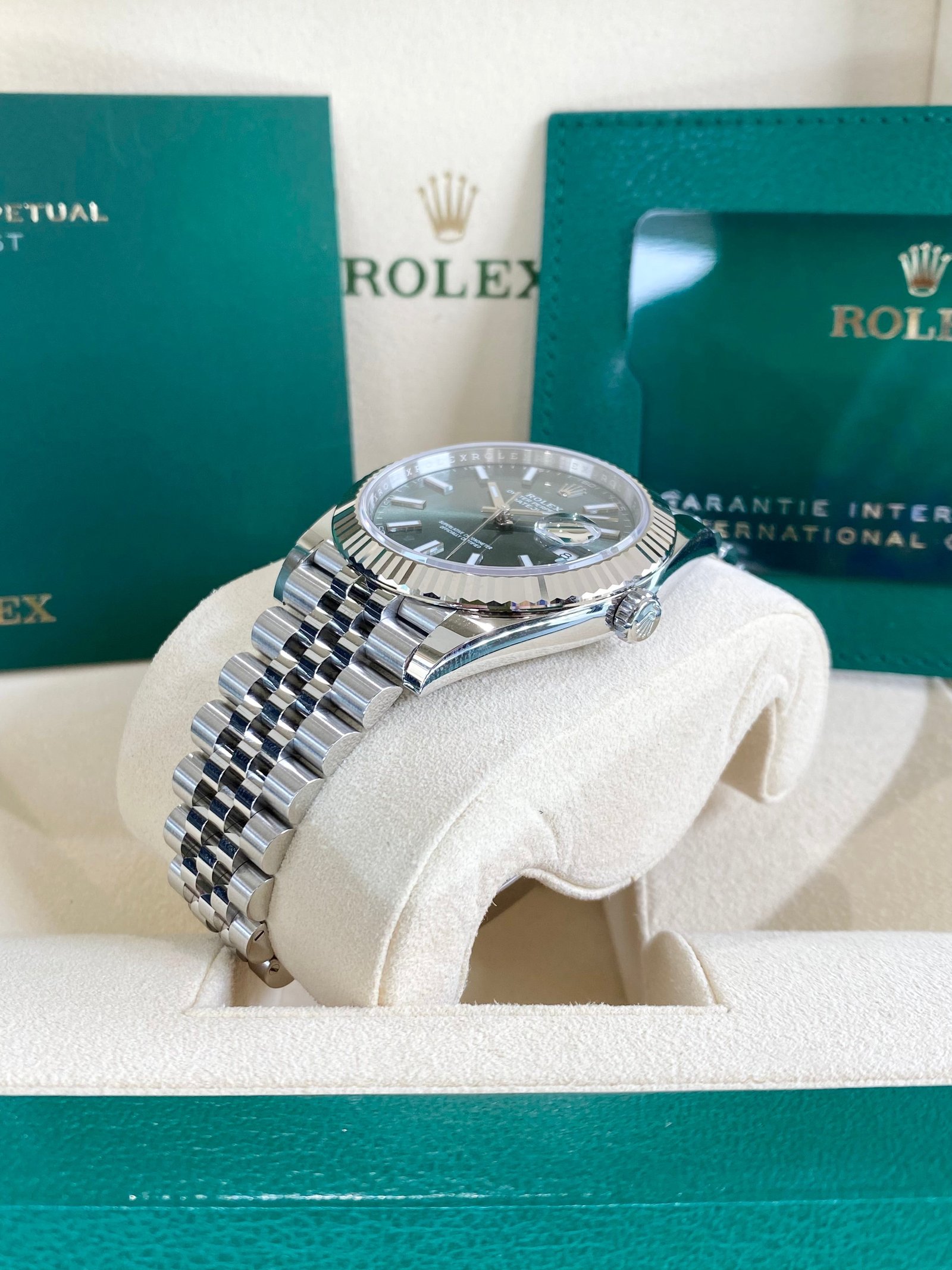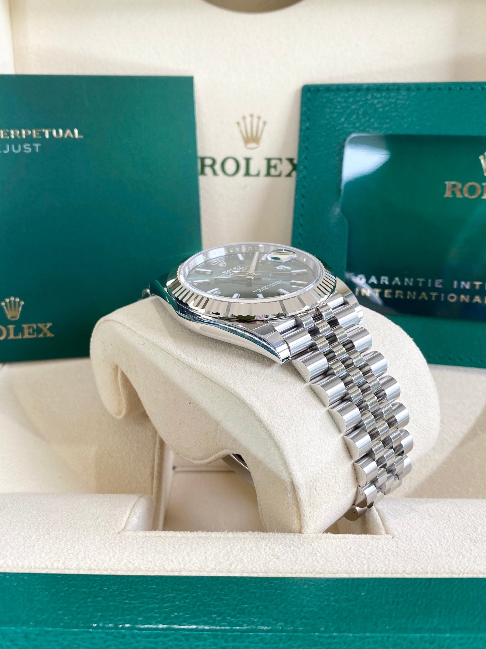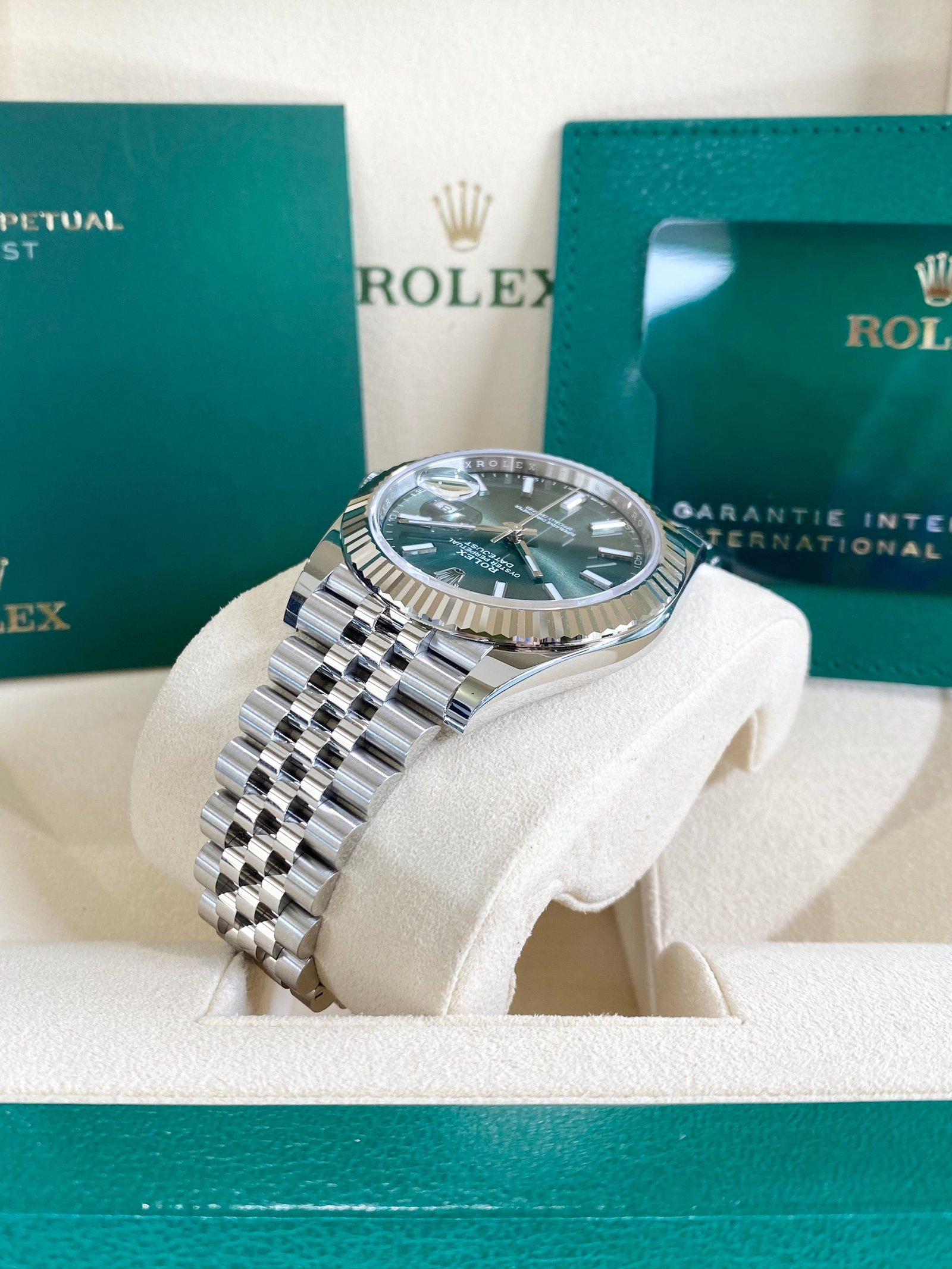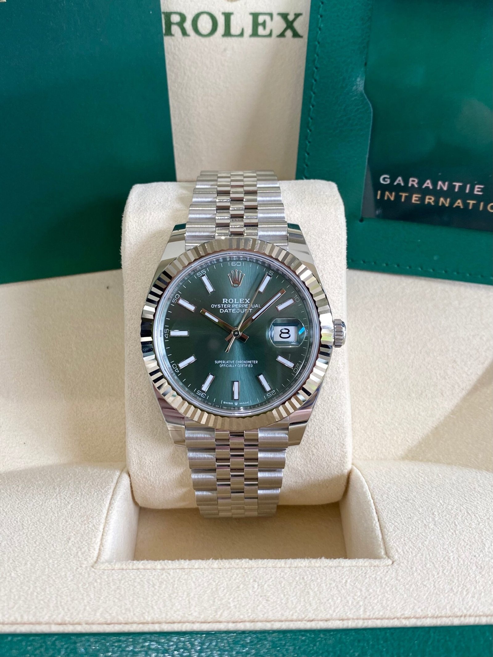 Dial: Mint green dial with luminous hands and hour markers. Date calendar at 3 o’clock aperture.