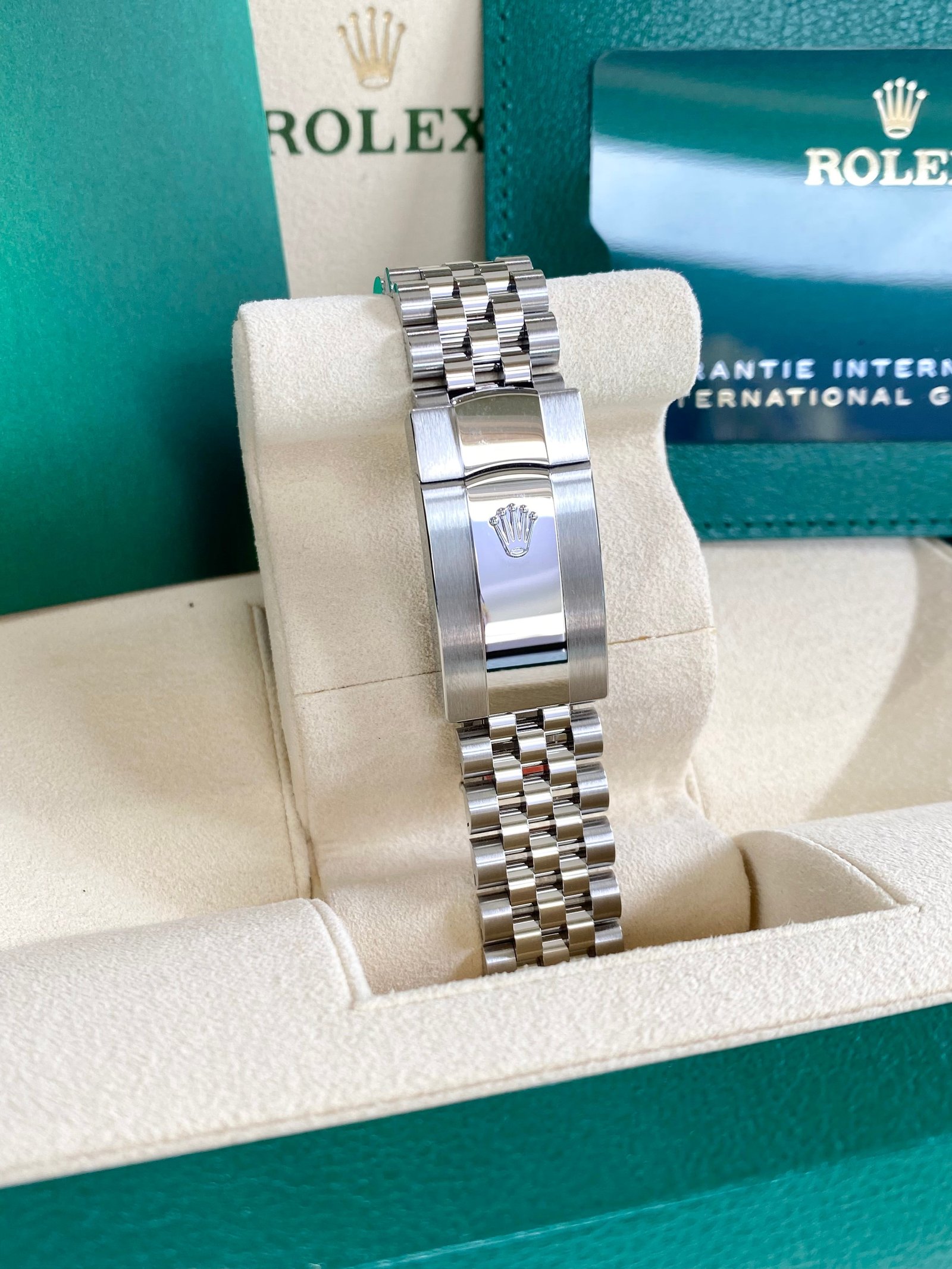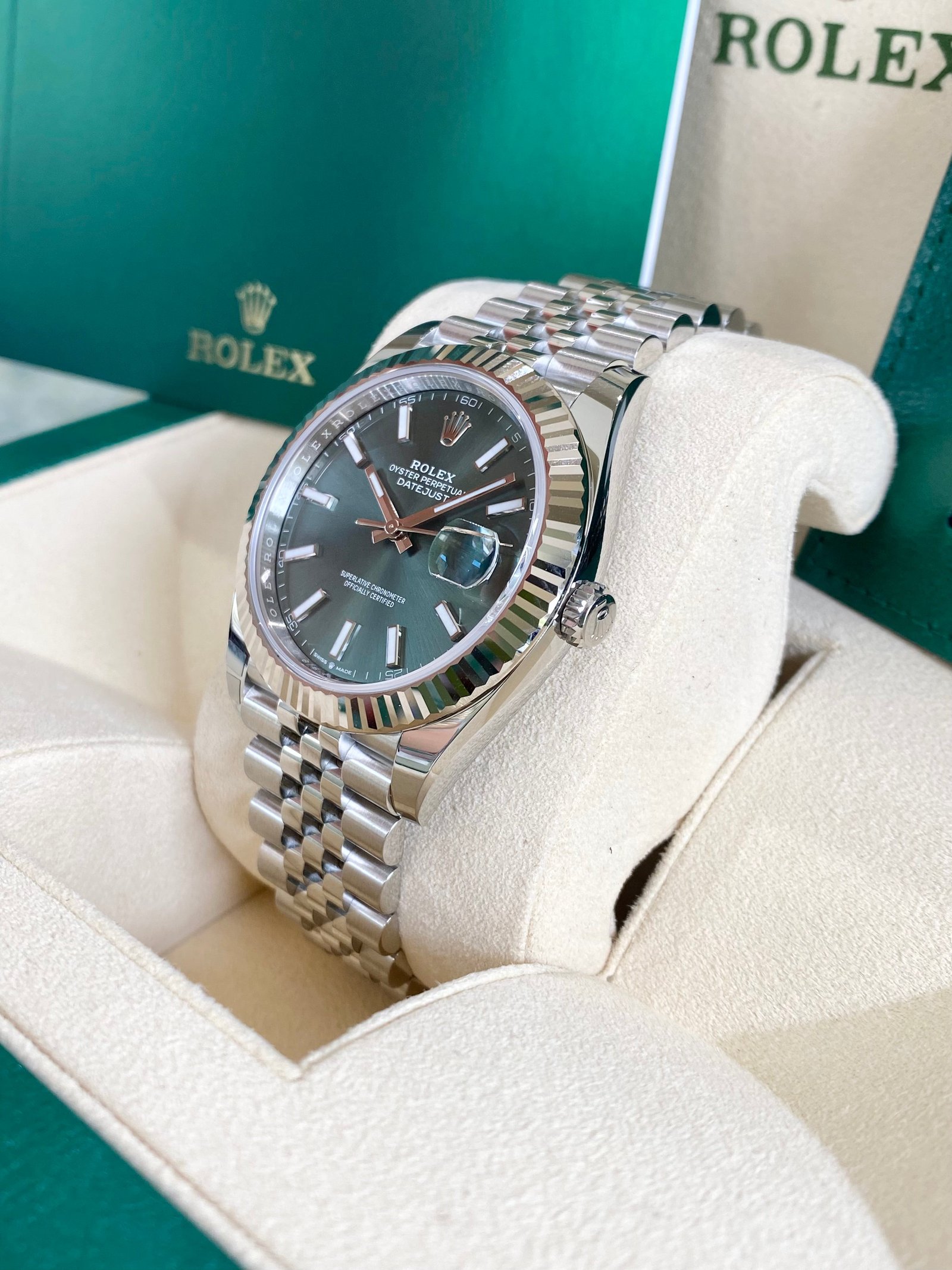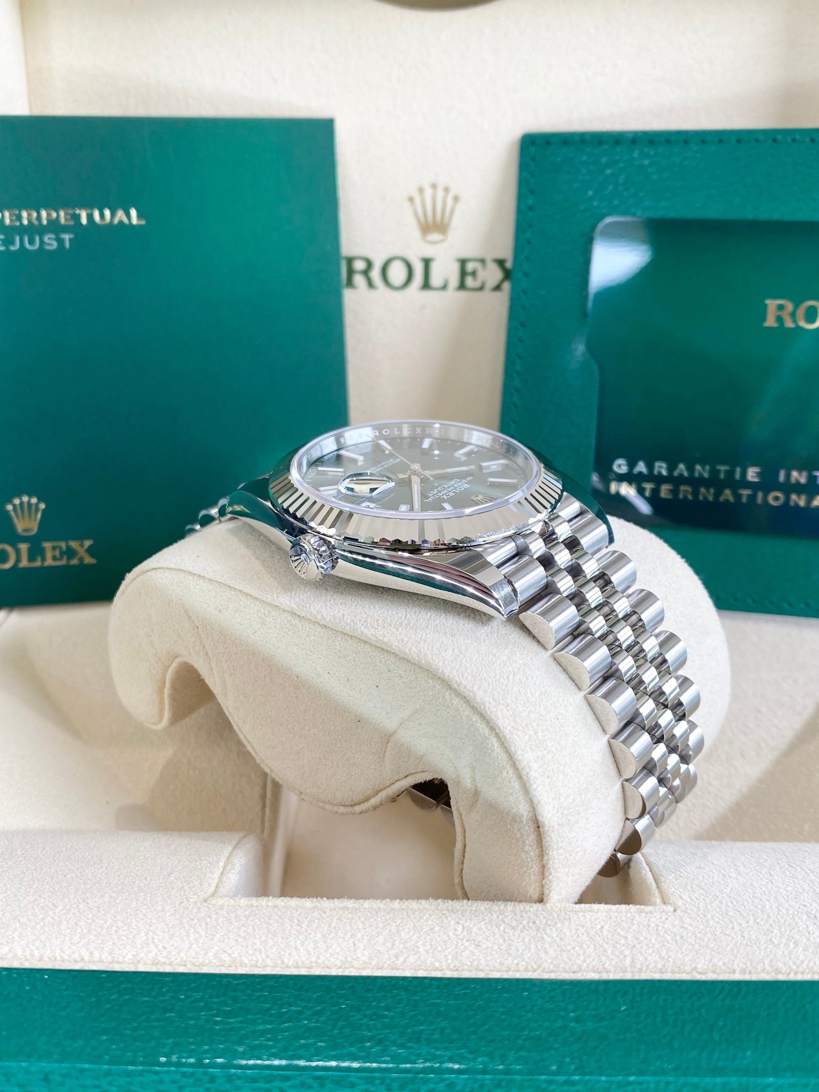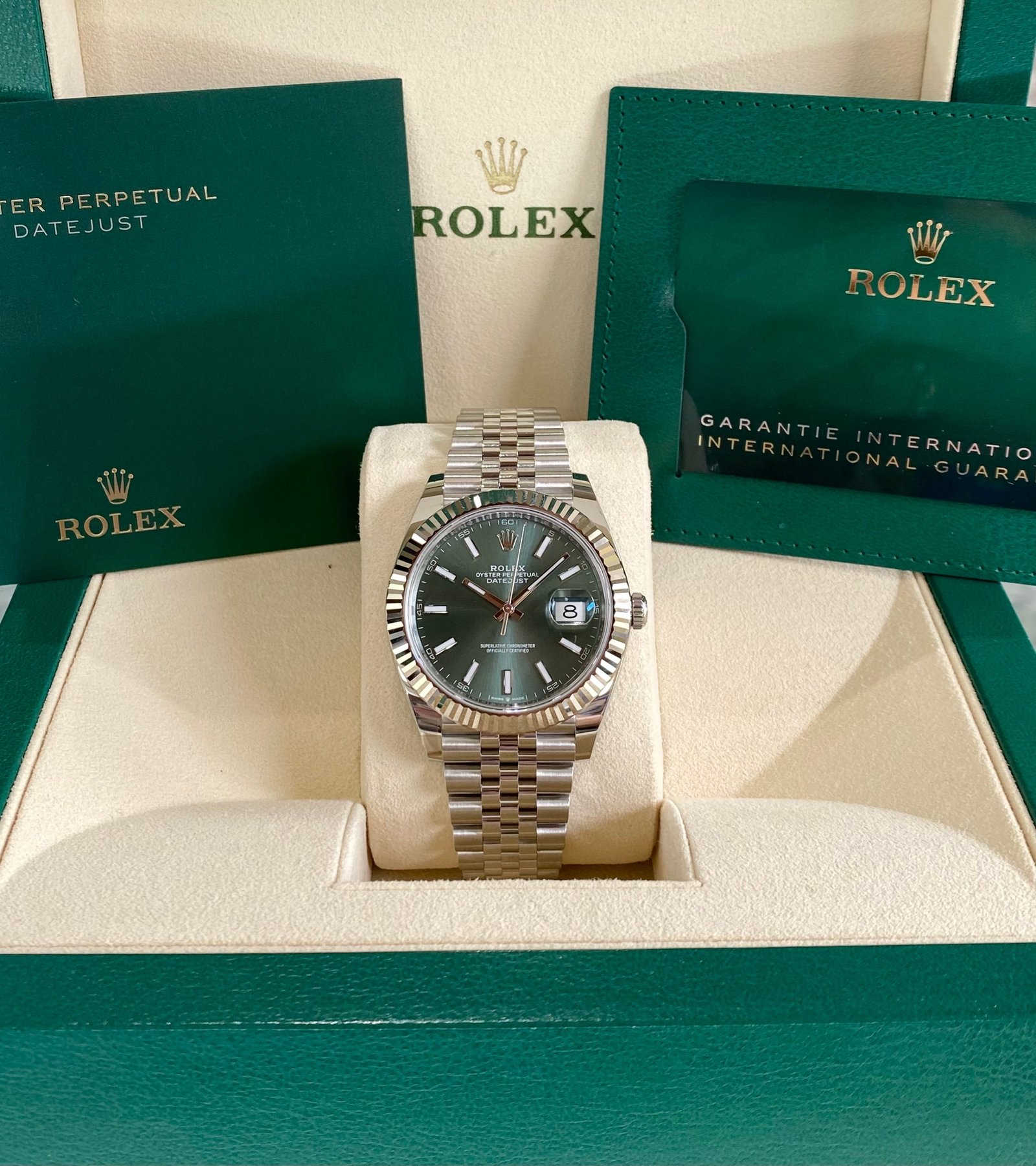 Dial: Mint green dial with luminous hands and hour markers. Date calendar at 3 o’clock aperture.