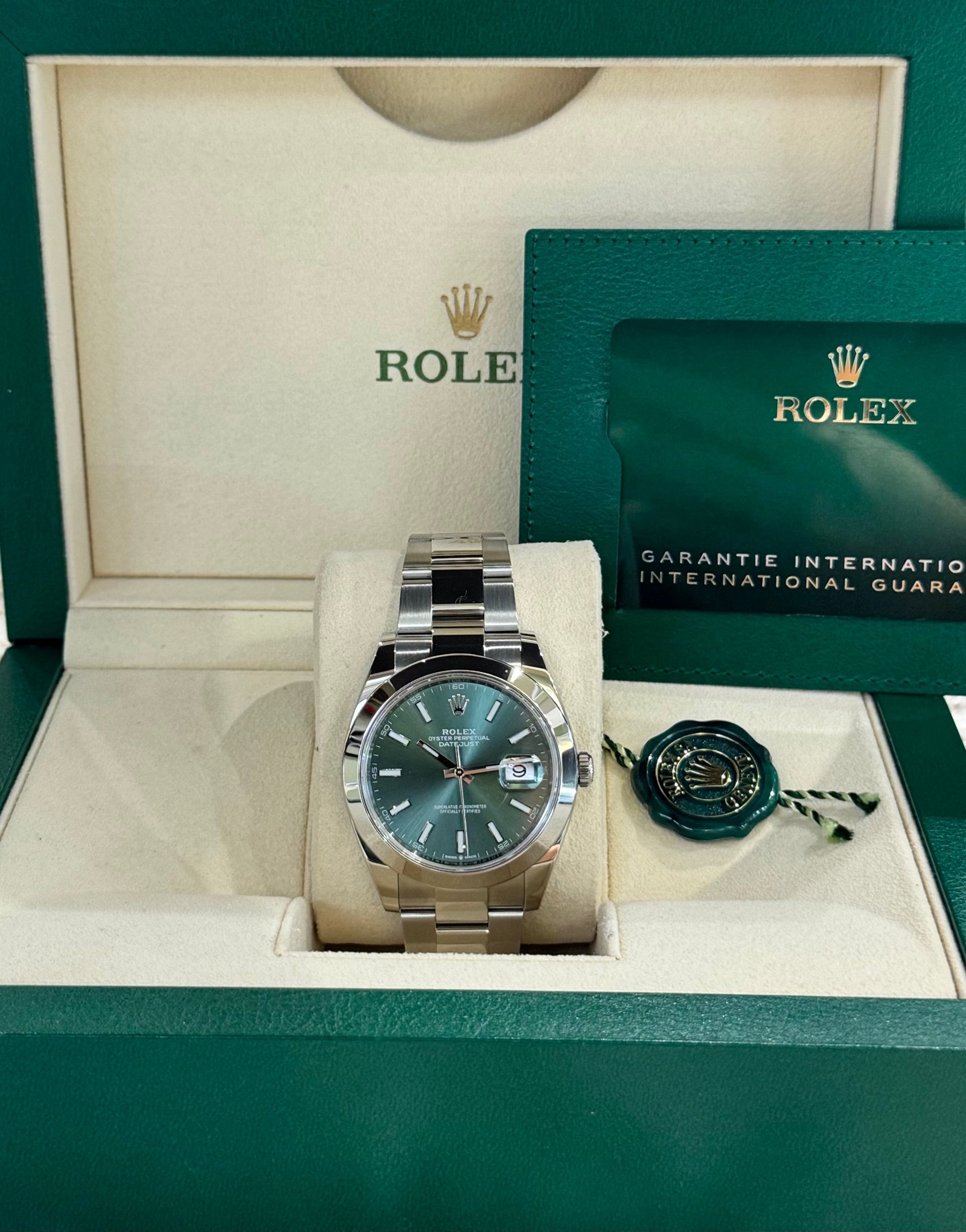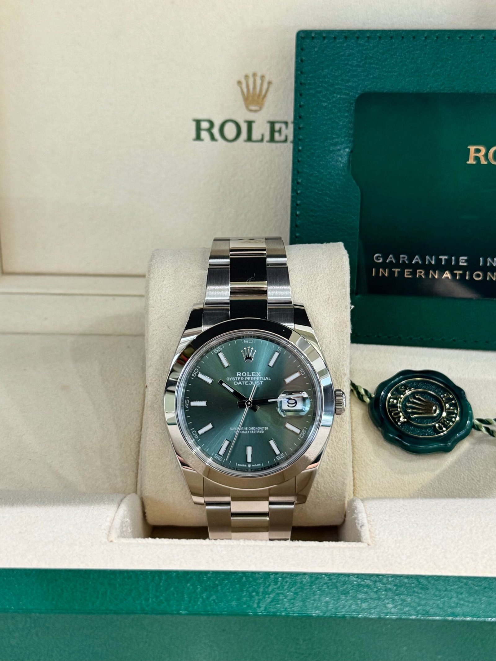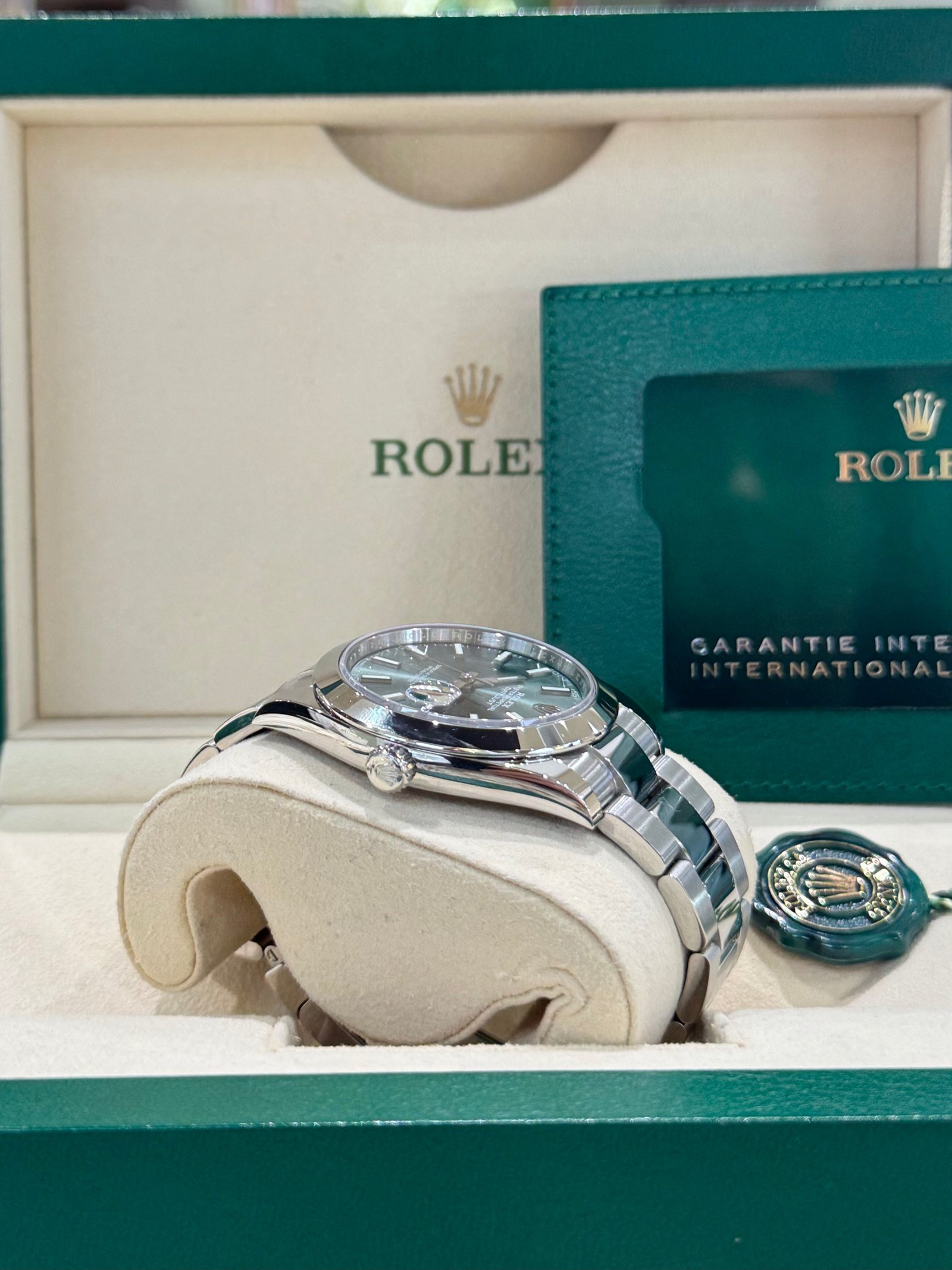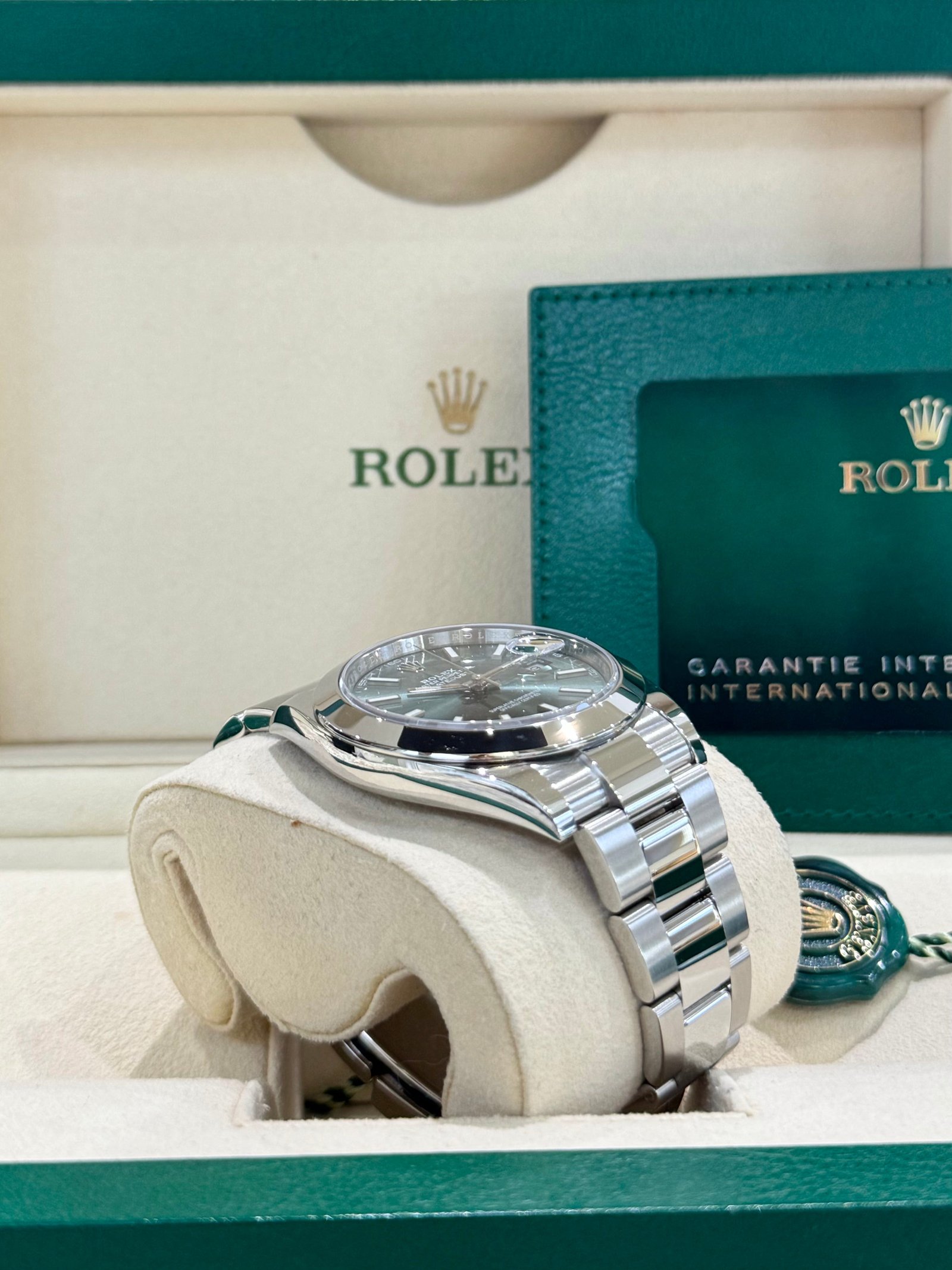 Dial: Mint green dial with luminous hands and hour markers. Date calendar at 3 o’clock aperture.