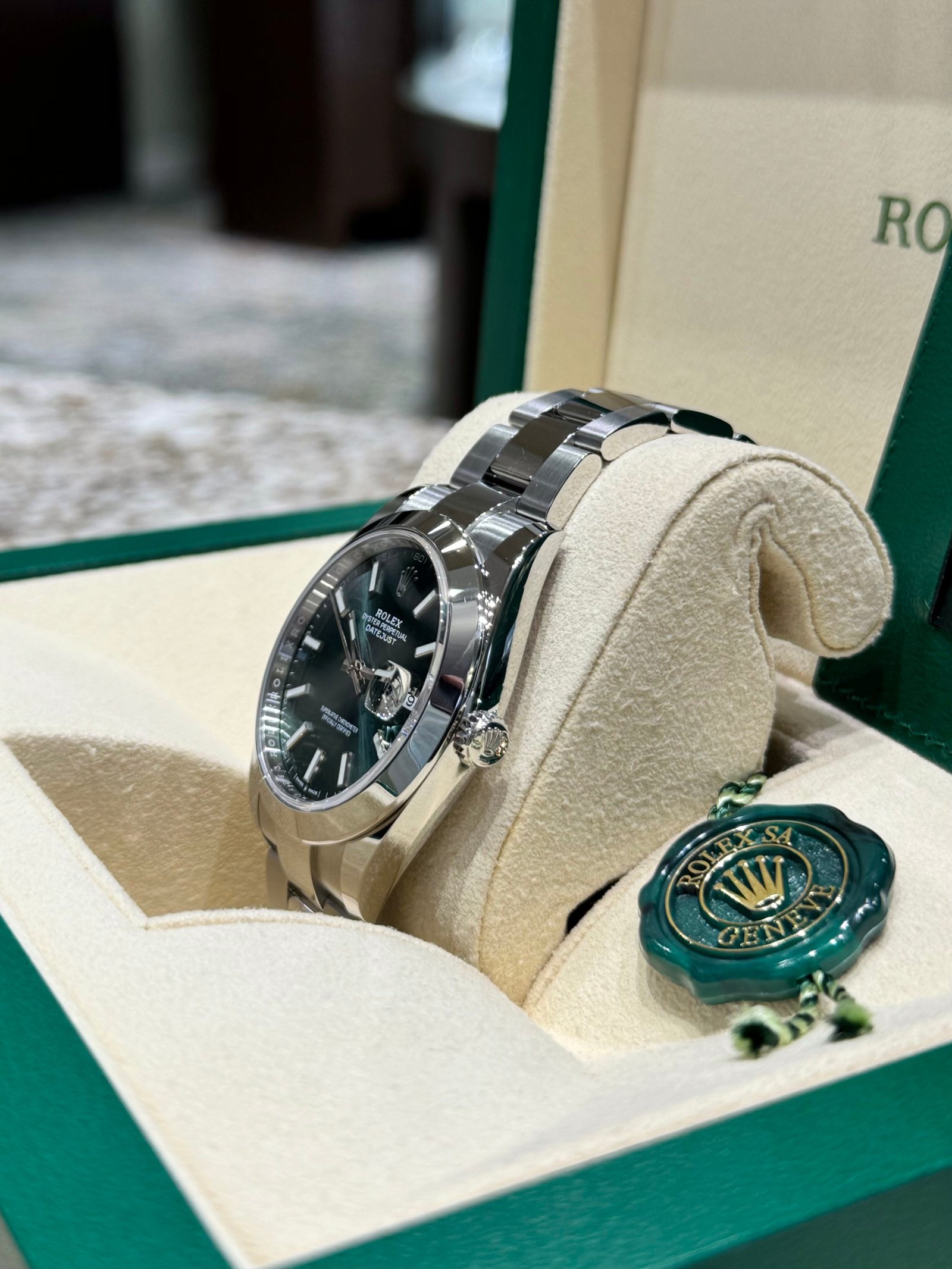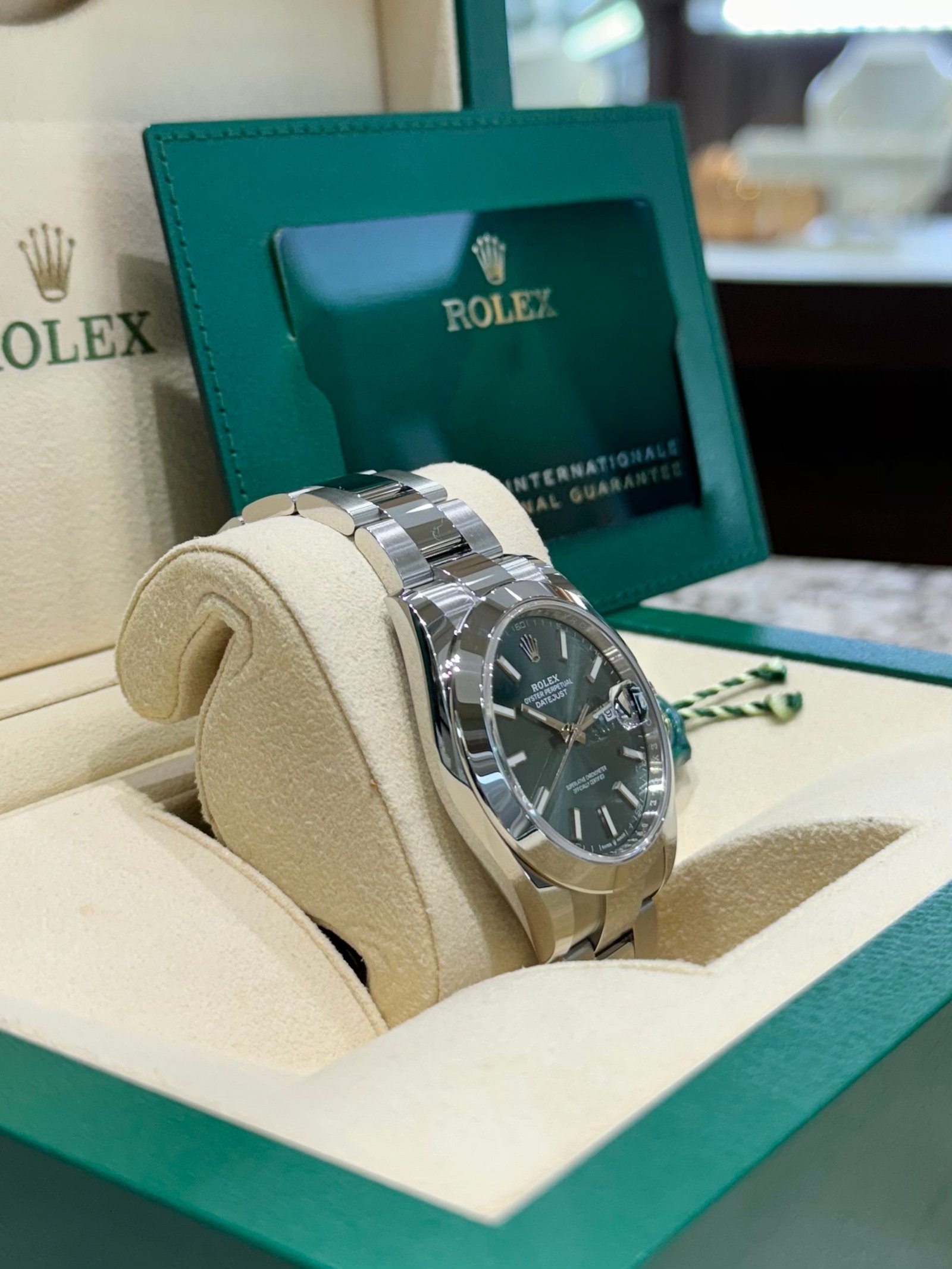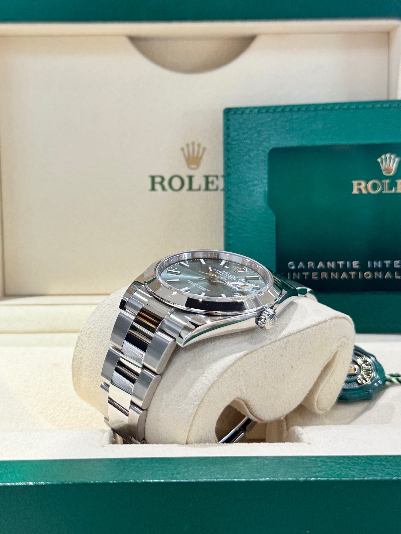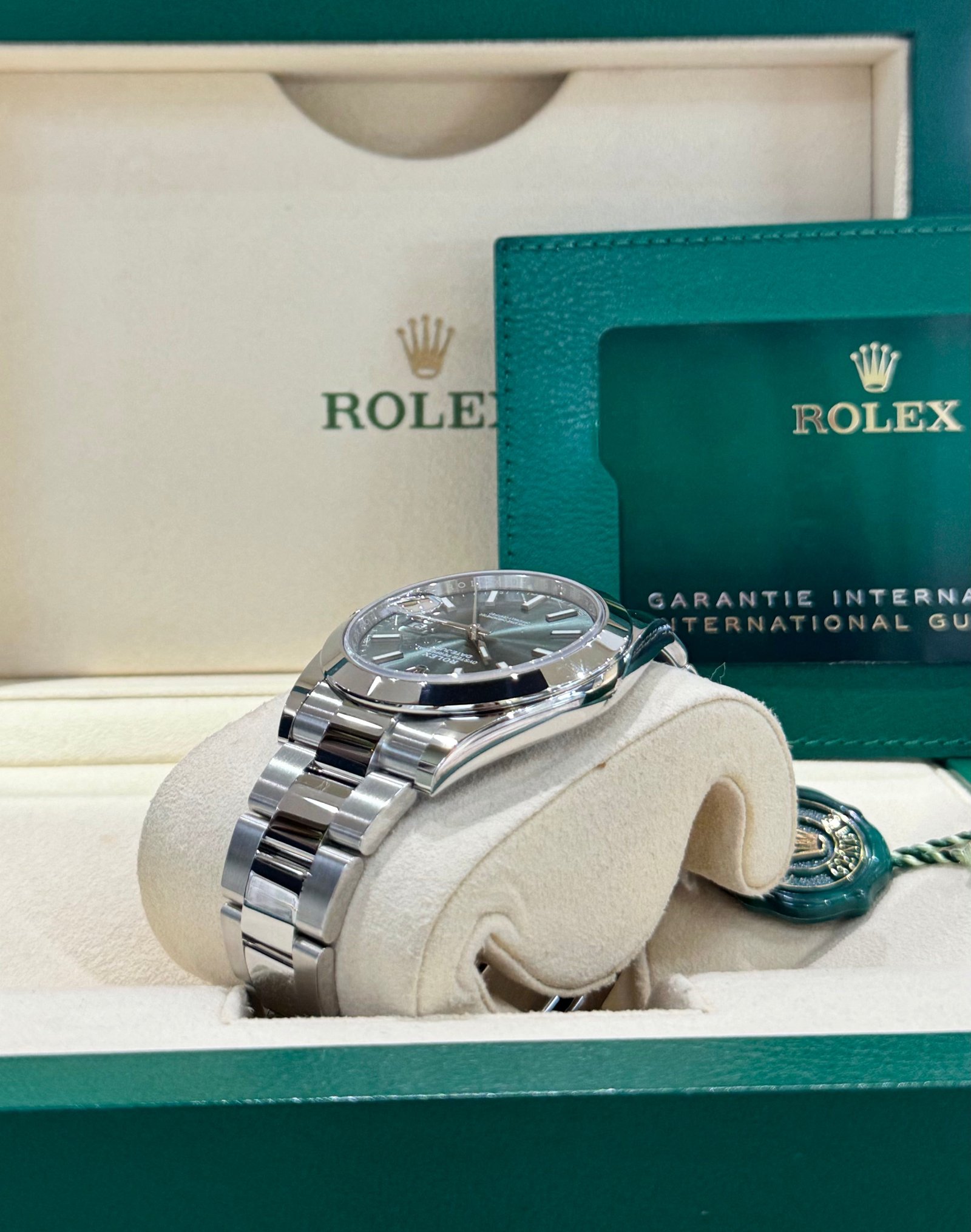 Dial: Mint green dial with luminous hands and hour markers. Date calendar at 3 o’clock aperture.
