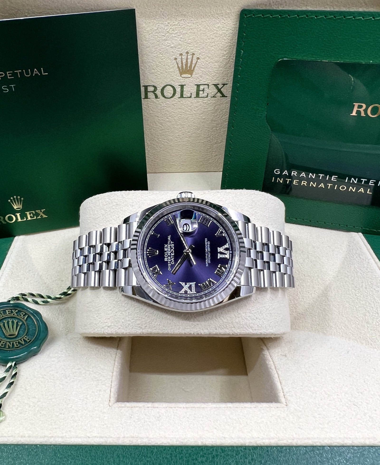 Dial: Purple dial with Roman numerals and diamond set VI and IX. Date calendar at 3 o’clock aperture.
