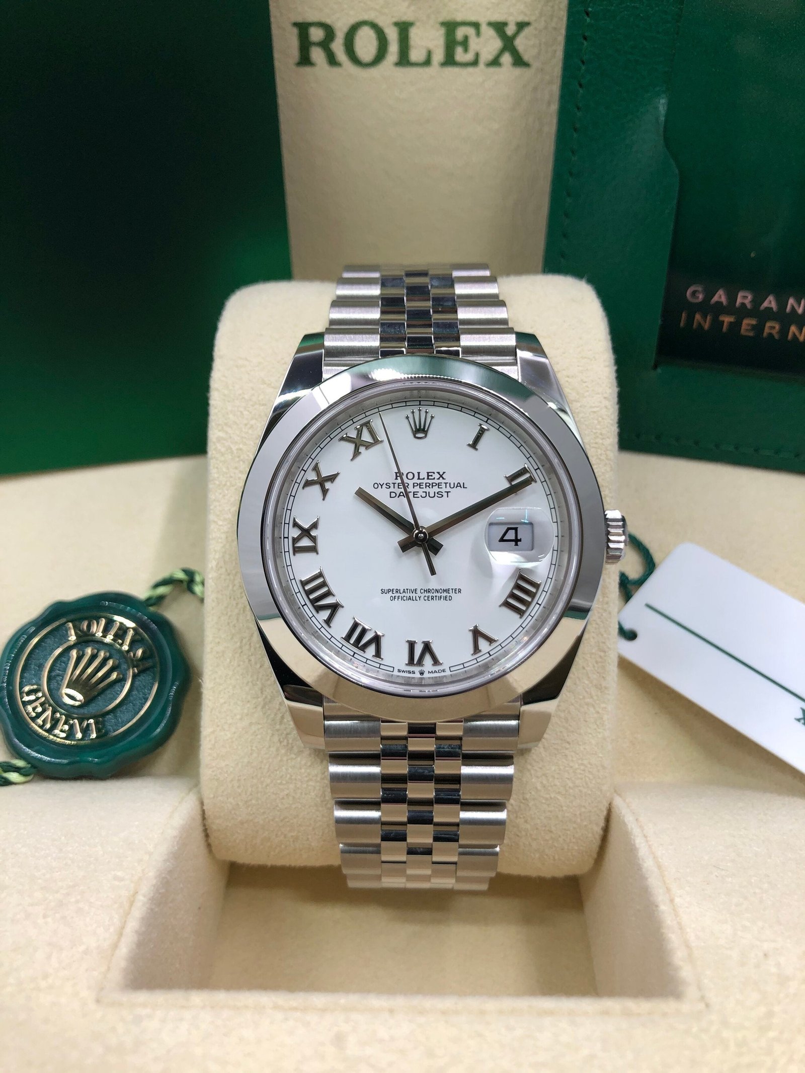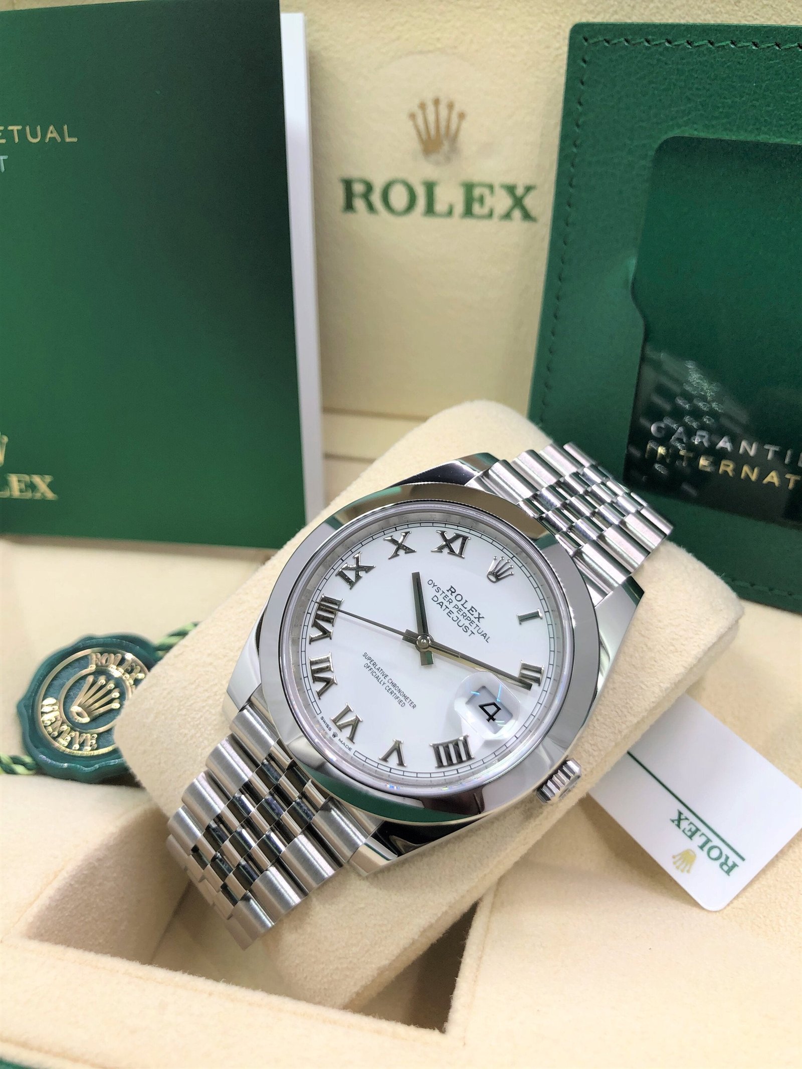 Dial: White dial with Roman numerals. Date calendar at 3 o’clock aperture.