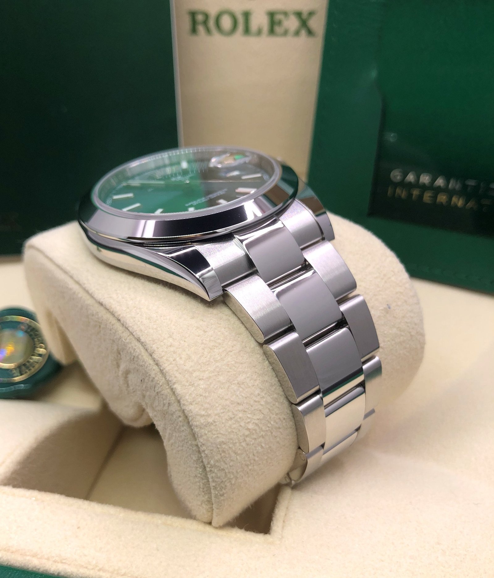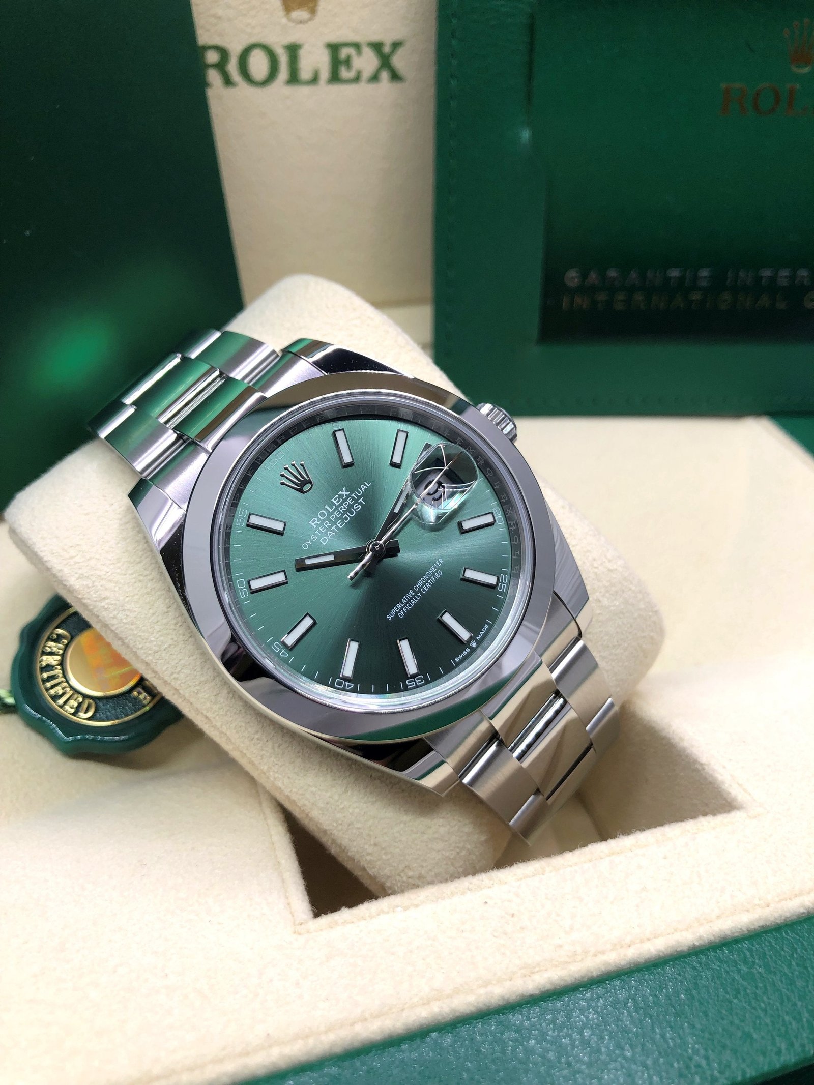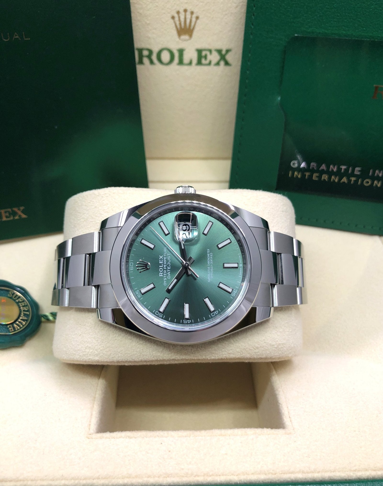 Dial: Green dial with luminous hands and hour markers. Date calendar at 3 o’clock aperture.