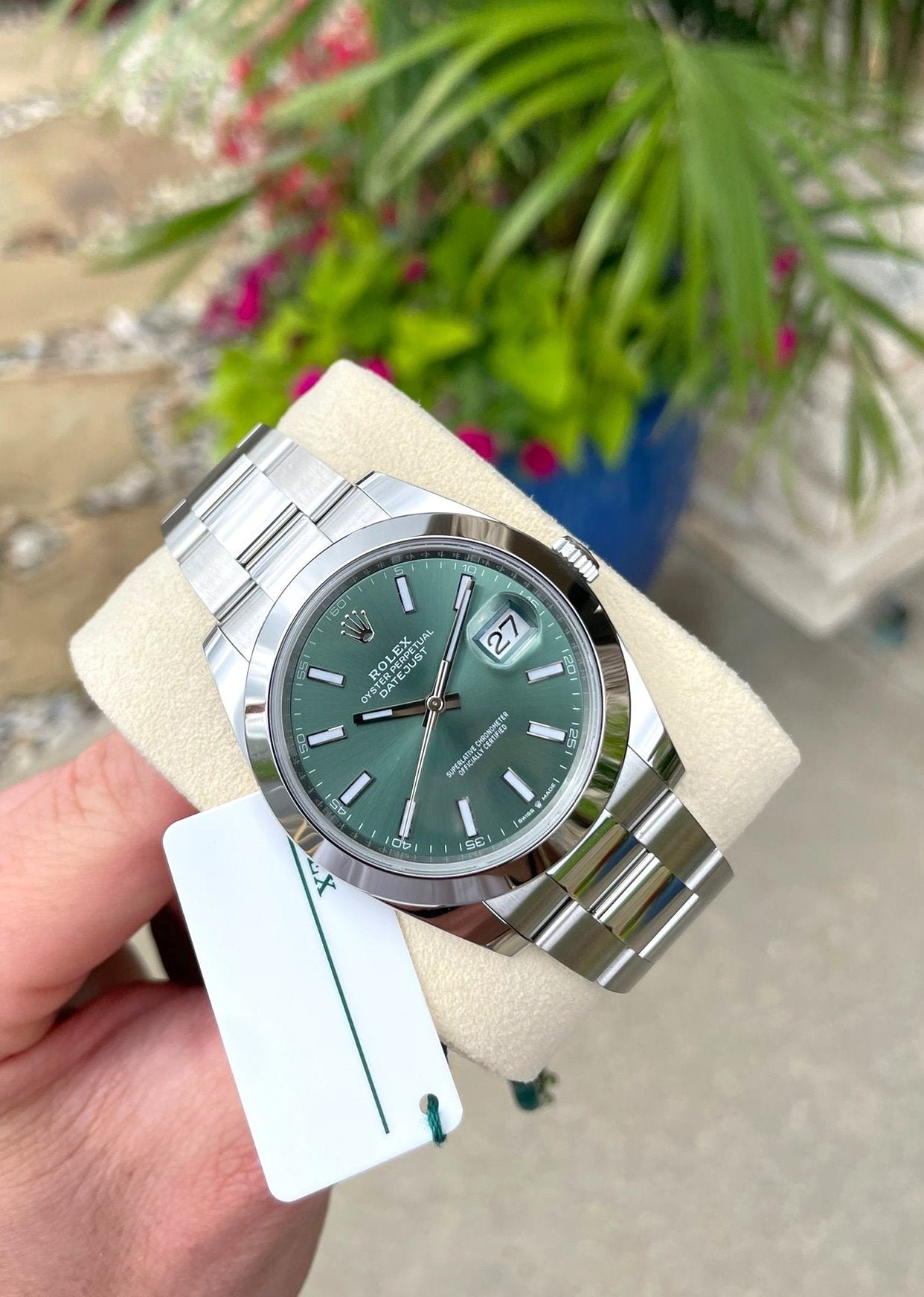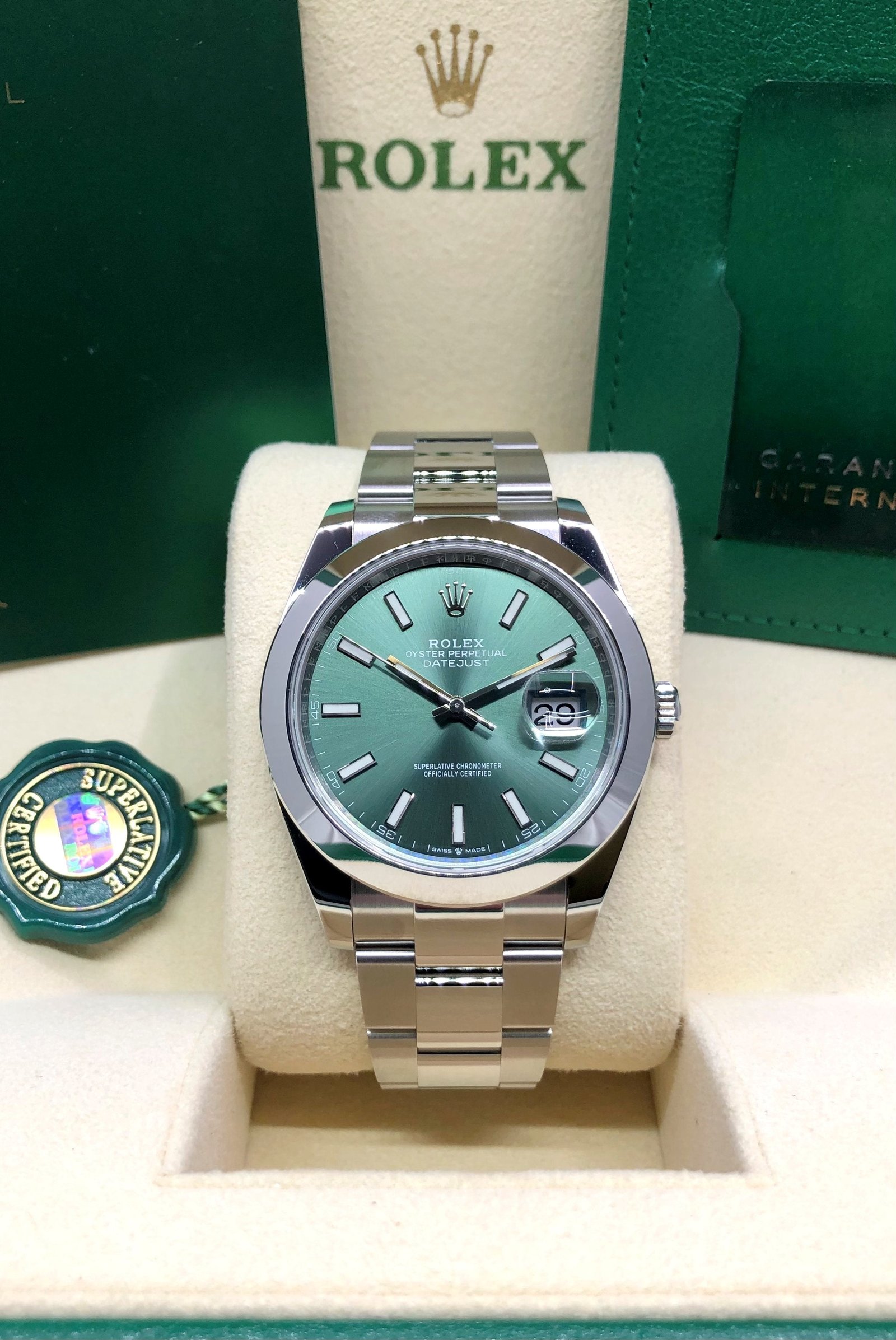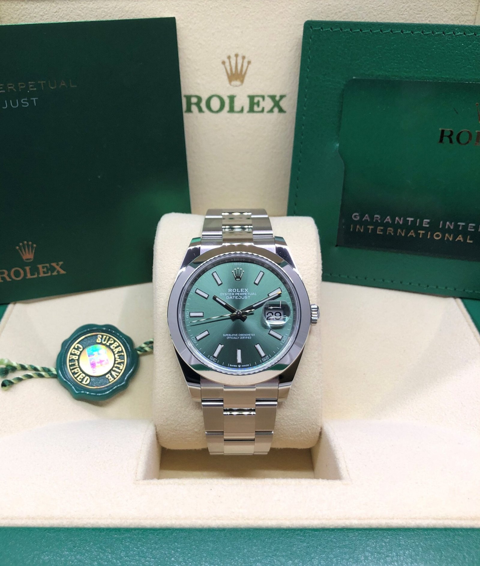 Dial: Green dial with luminous hands and hour markers. Date calendar at 3 o’clock aperture.