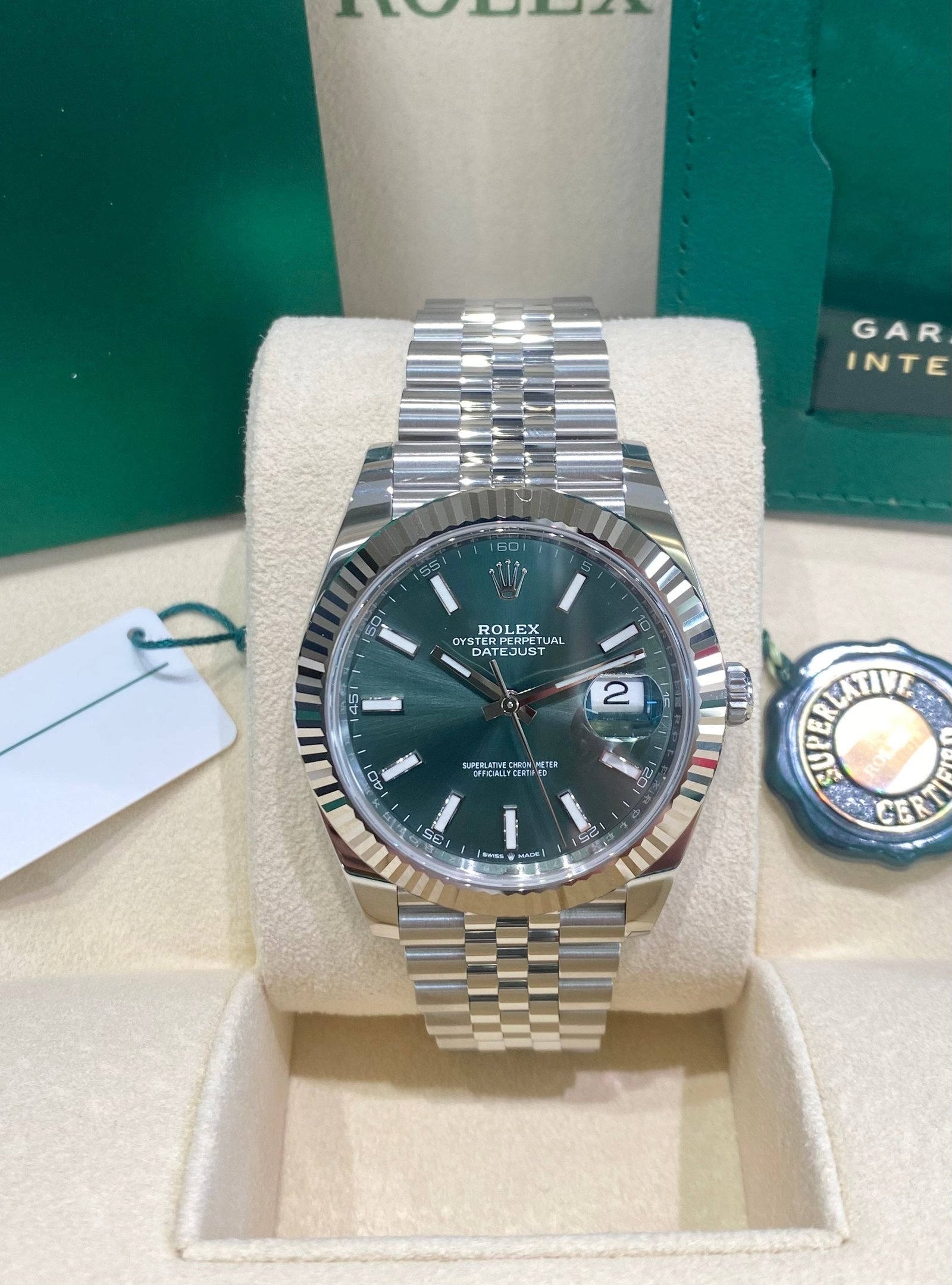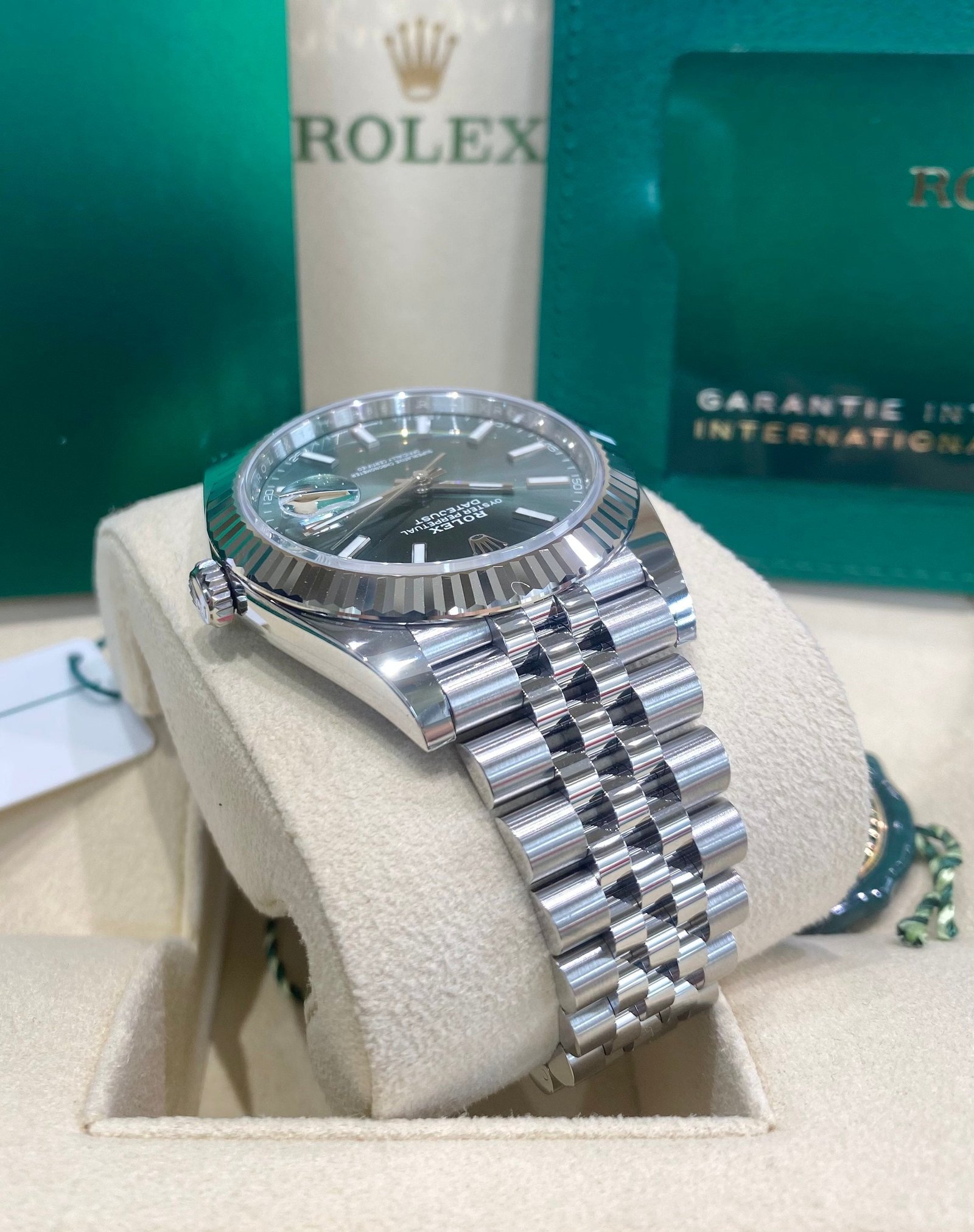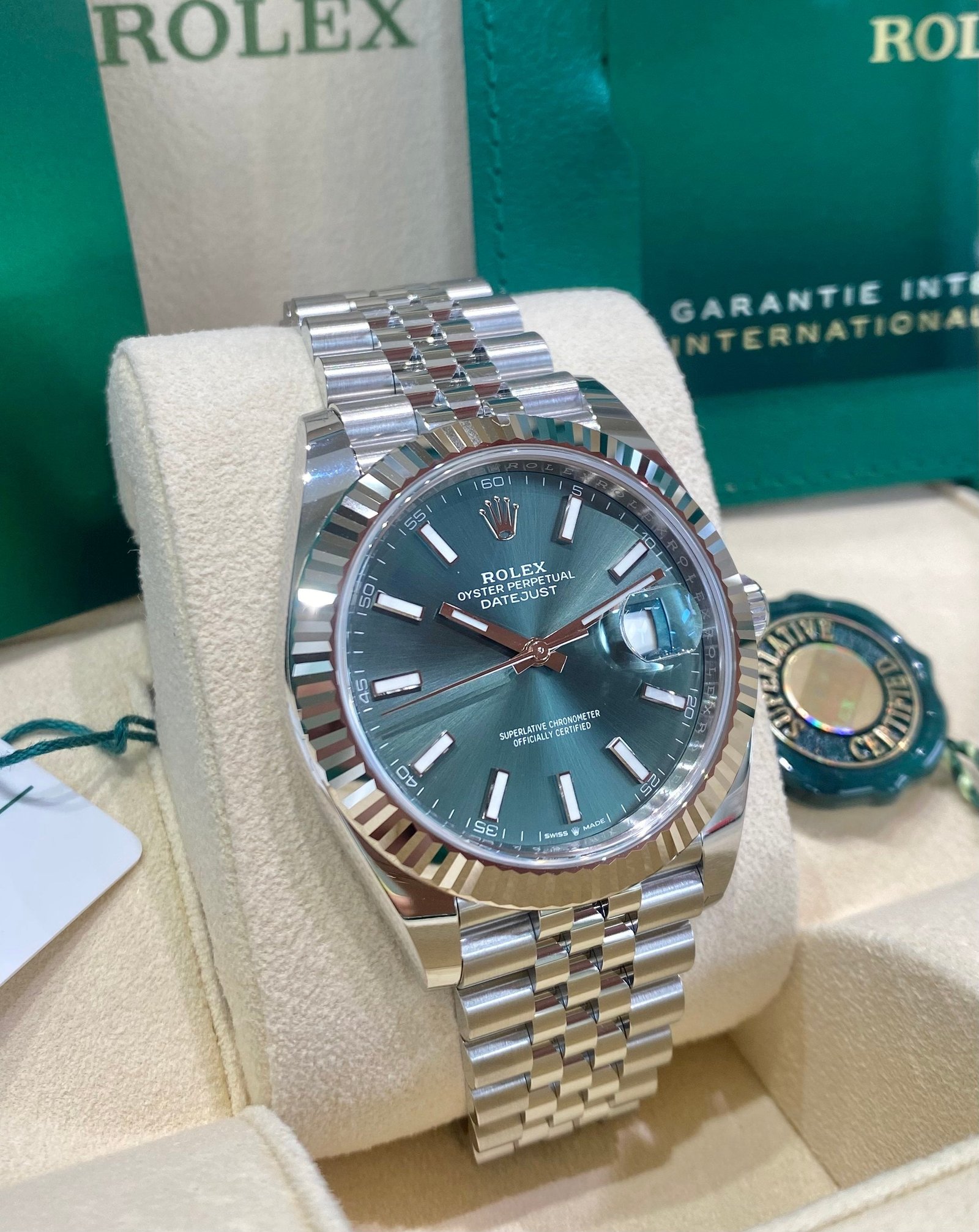 Dial: Mint green dial with luminous hands and hour markers. Date calendar at 3 o’clock aperture.