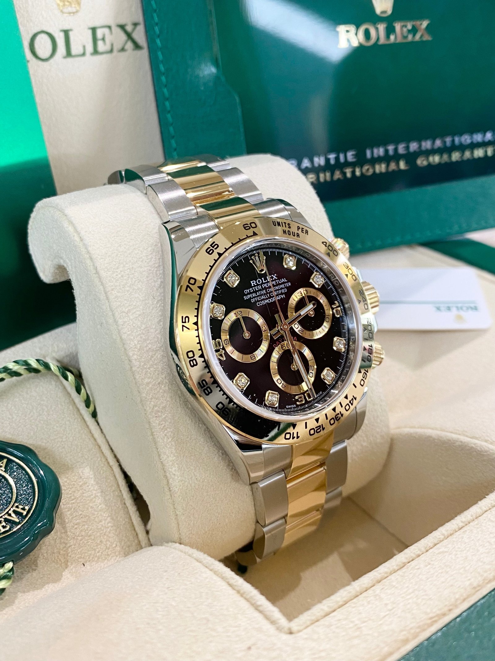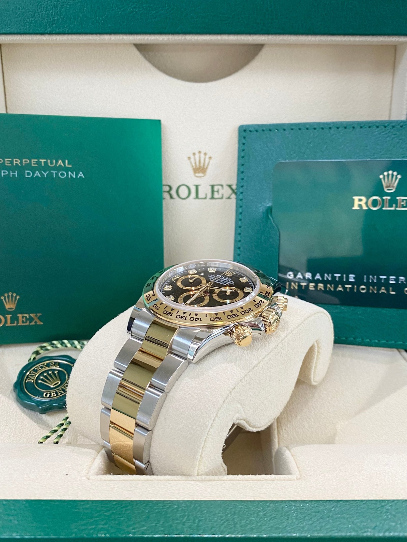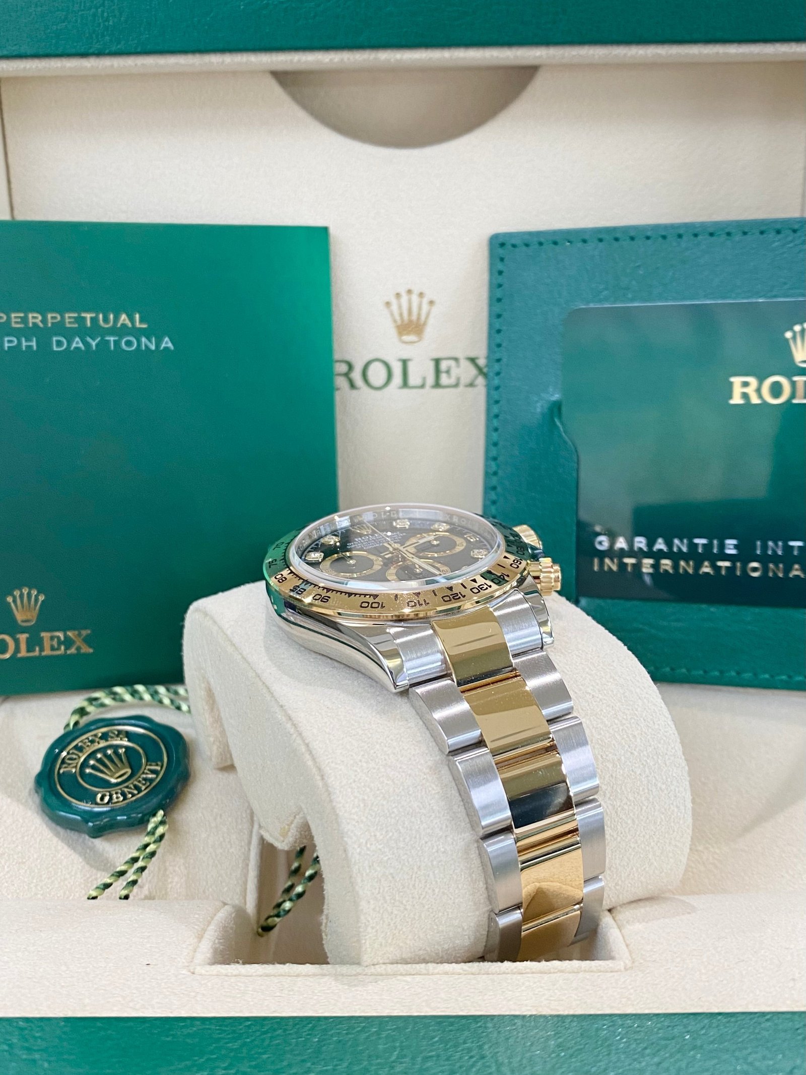 Bezel: Tachymetric engraved 18ct yellow gold bezel. Inner engraved Rolex bezel ring