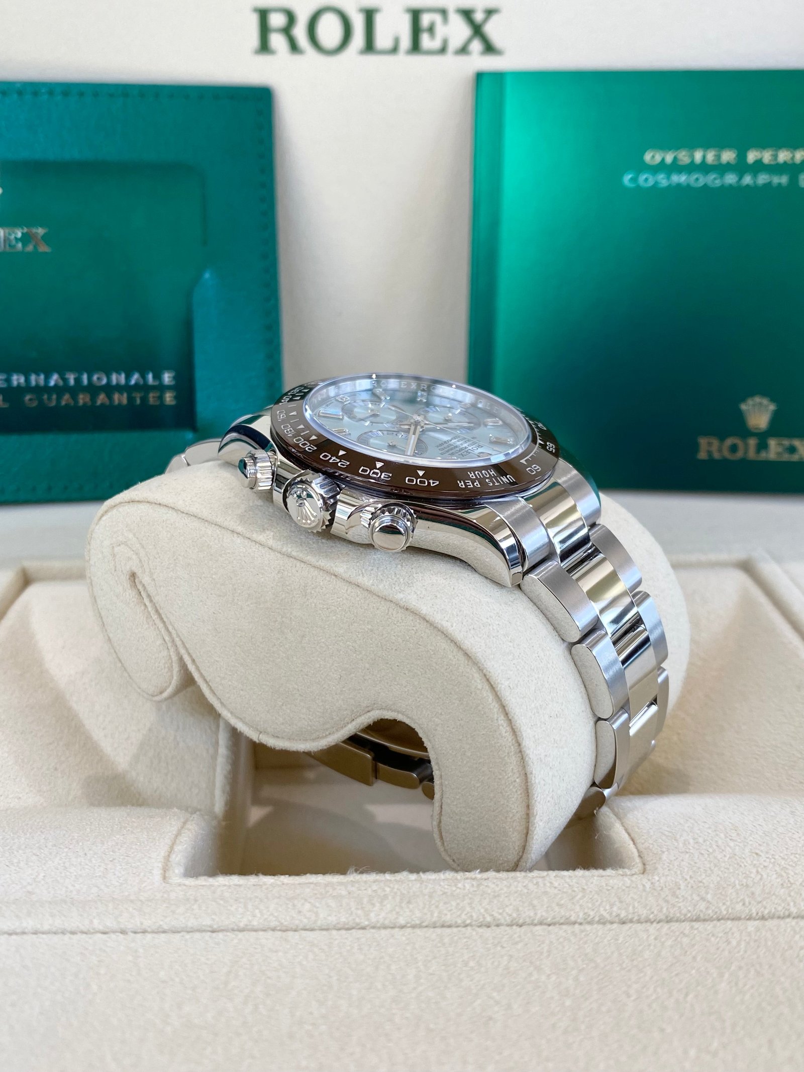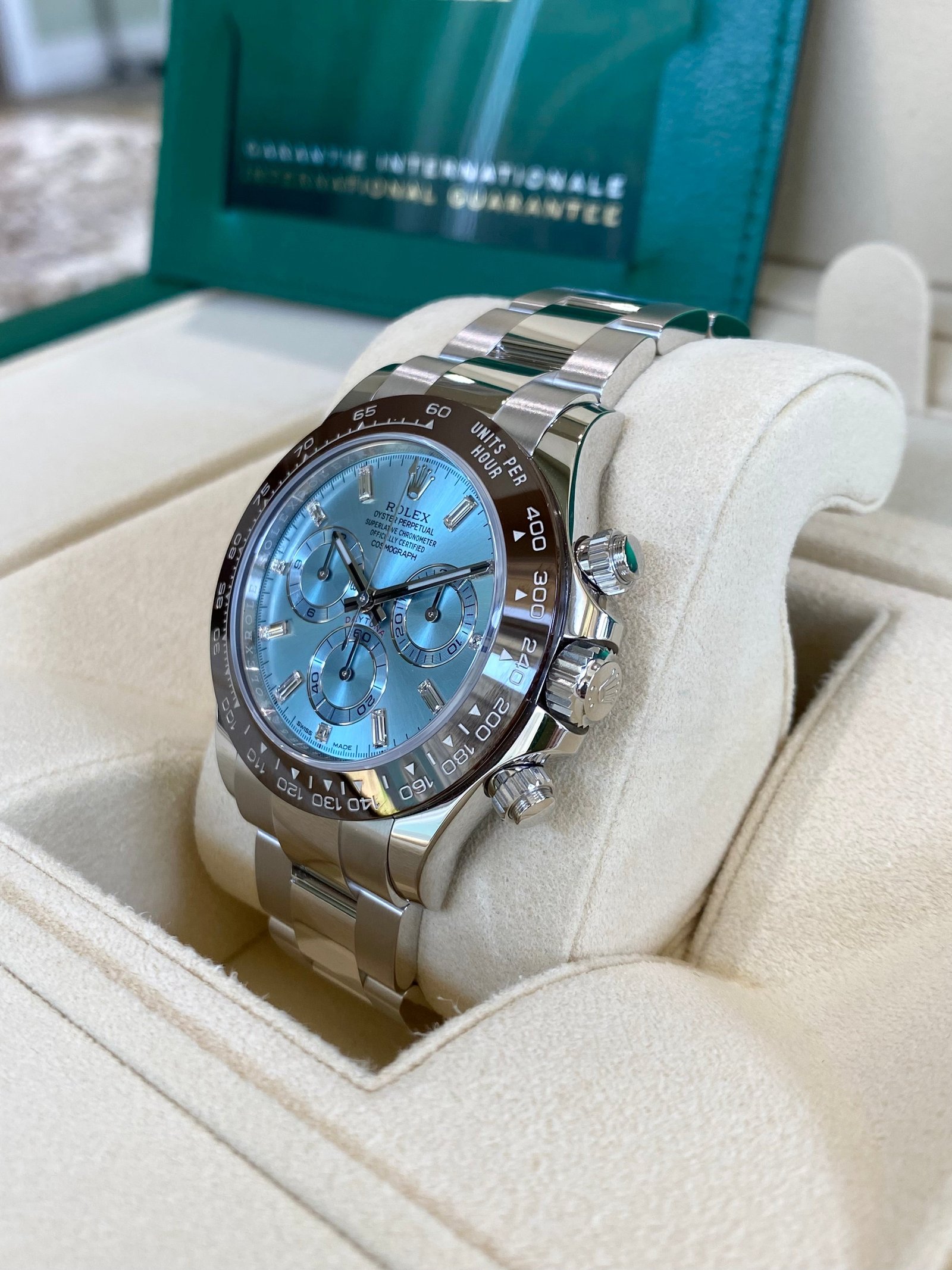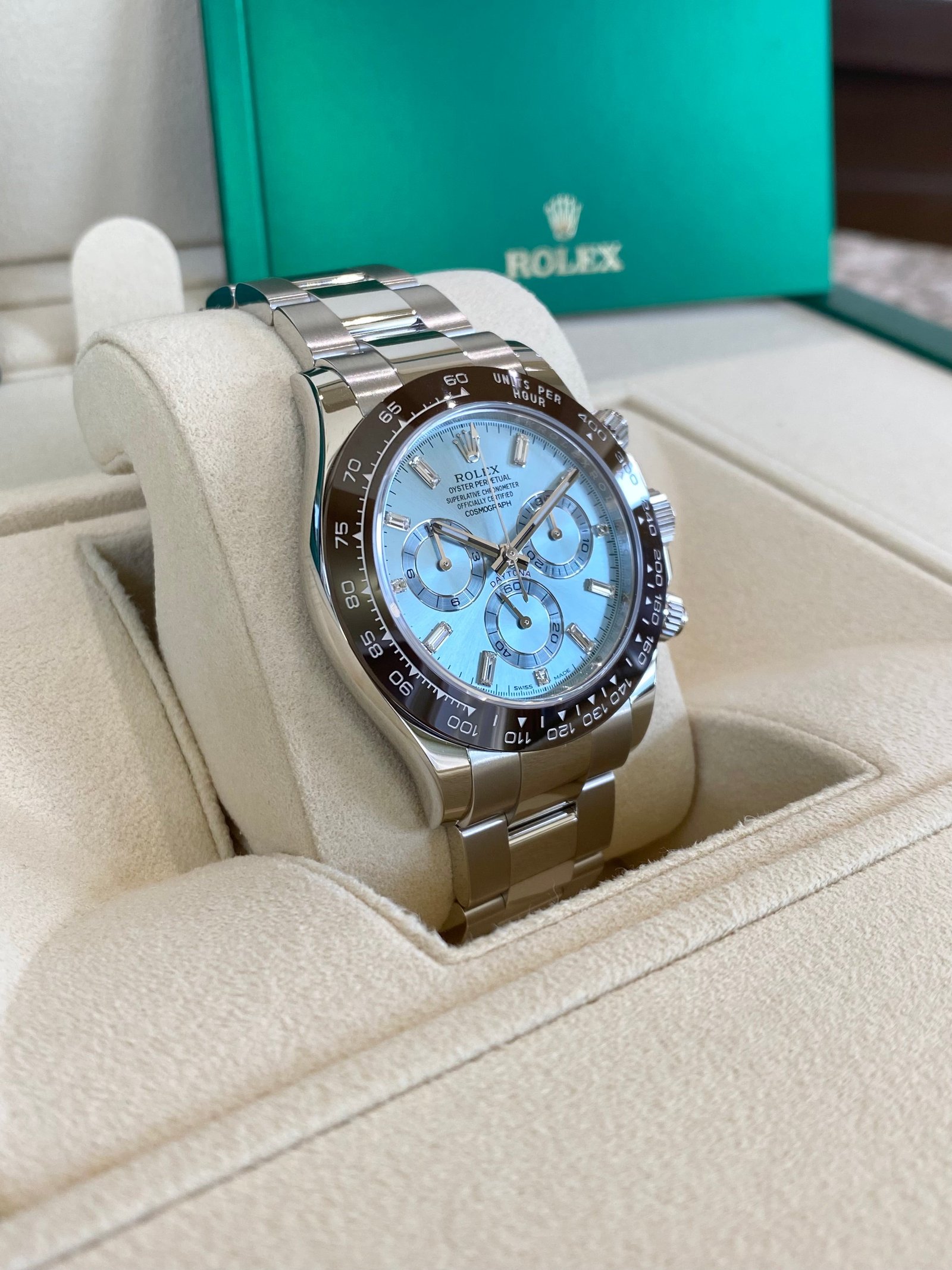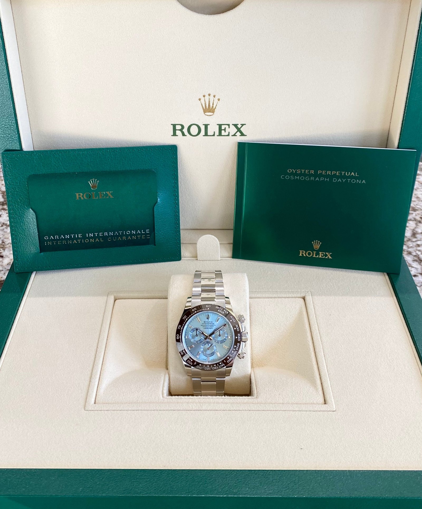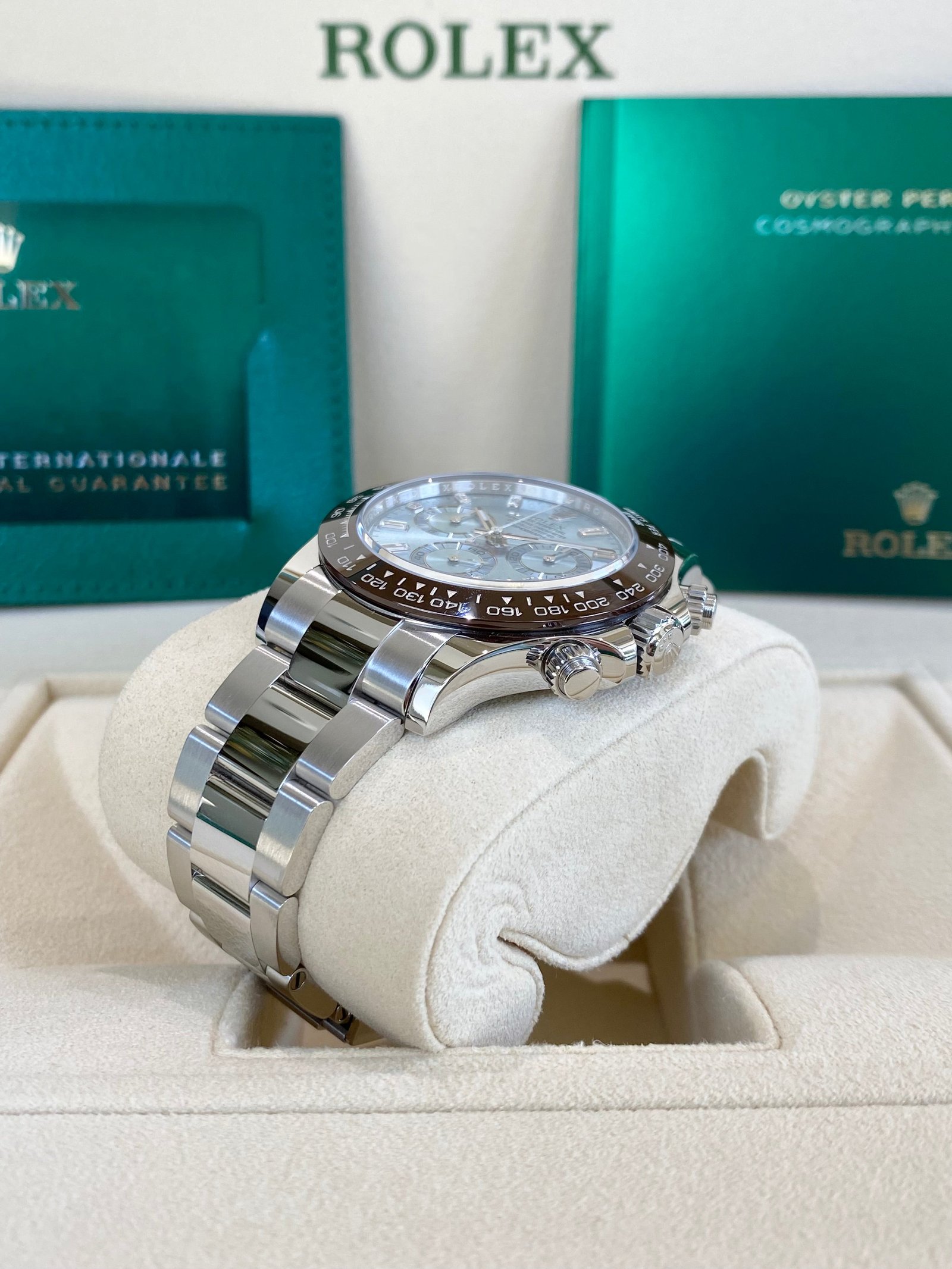 Case: Platinum case 40mm in diameter. Rolex logo on crown