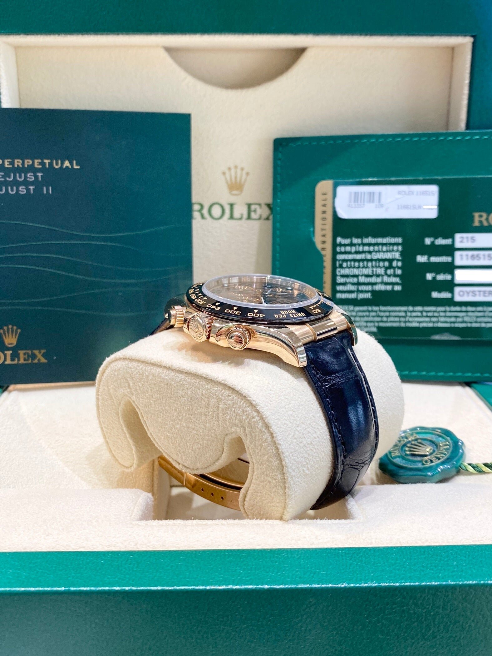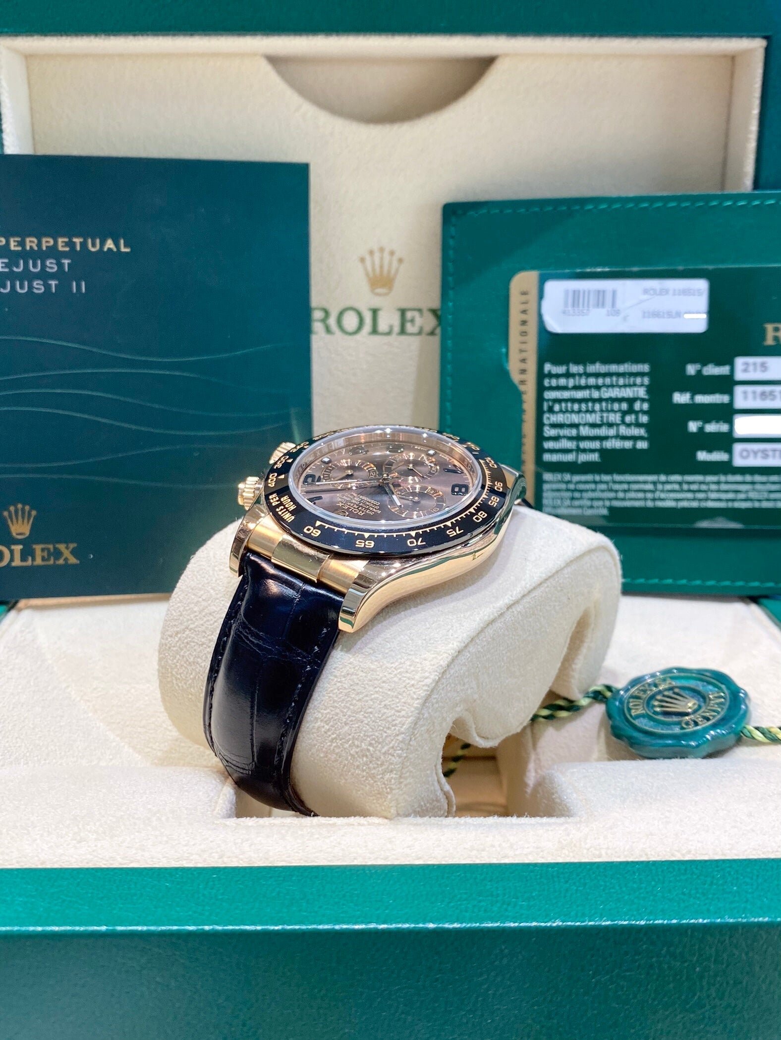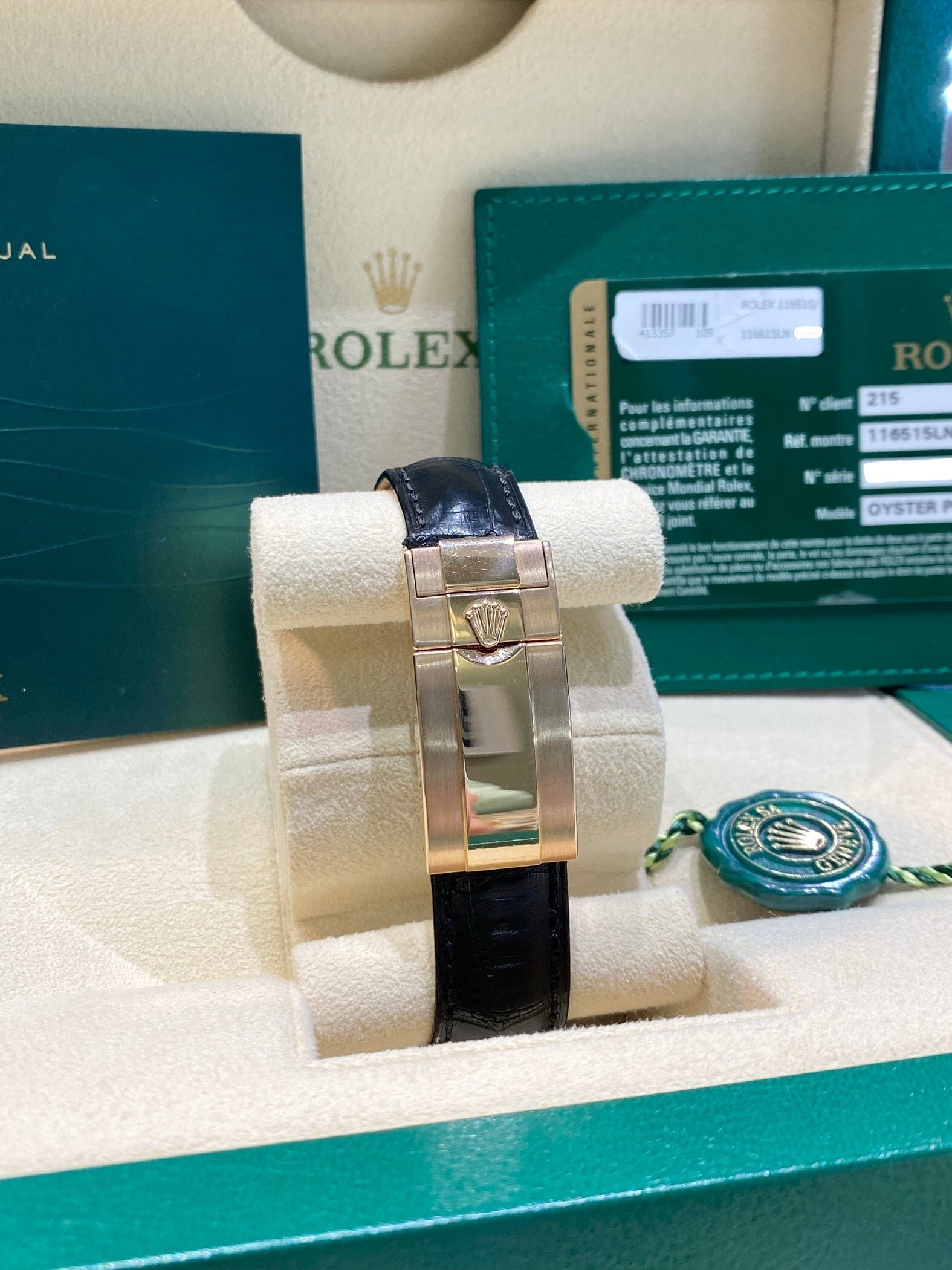 Bracelet: Black Rolex leather strap with 18ct Everose gold Oysterlock clasp