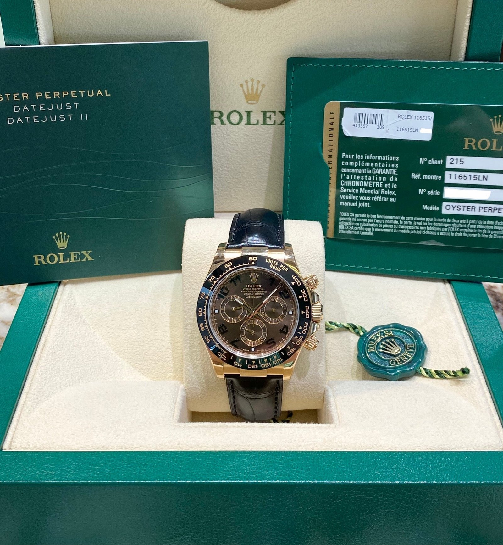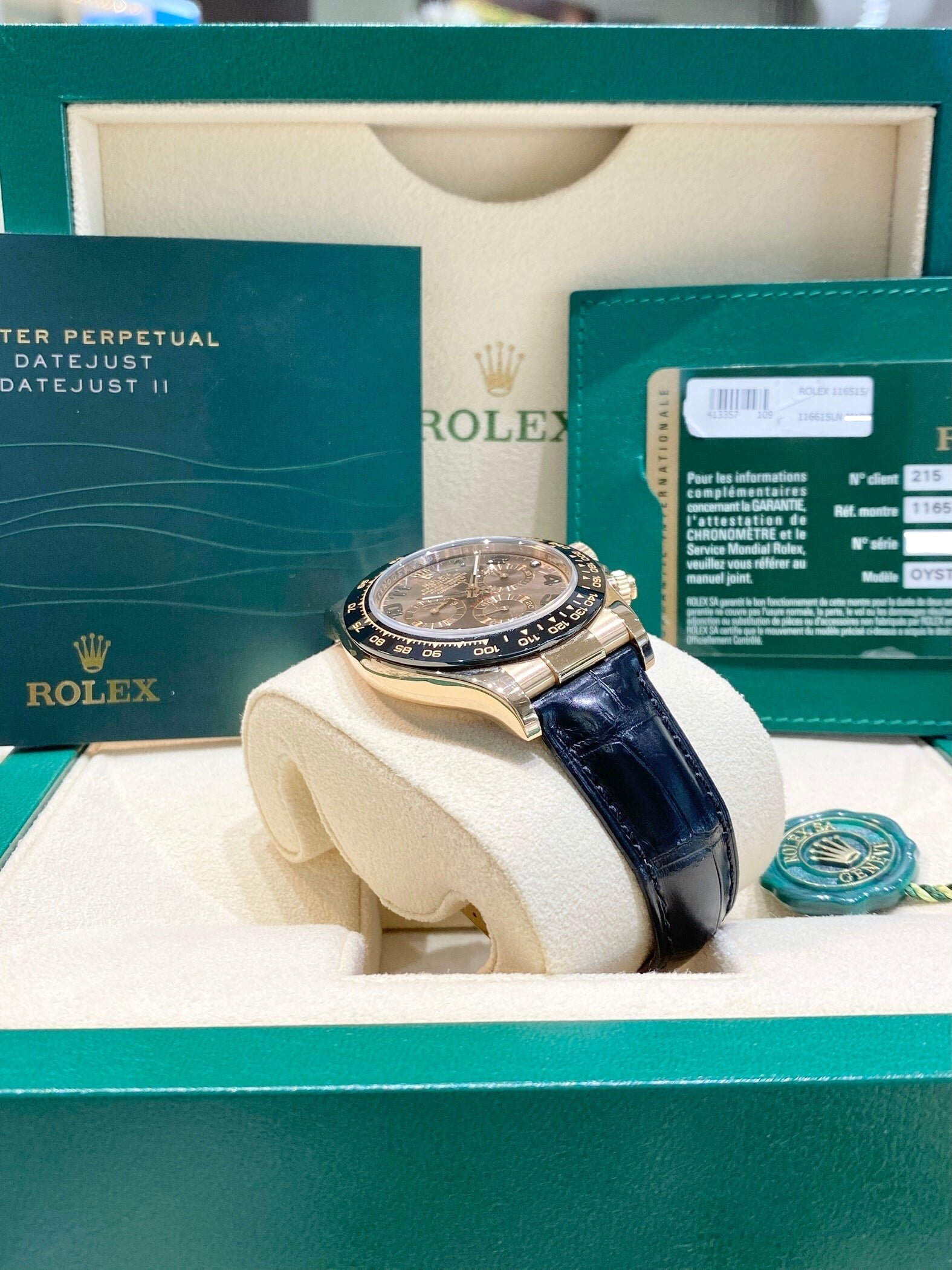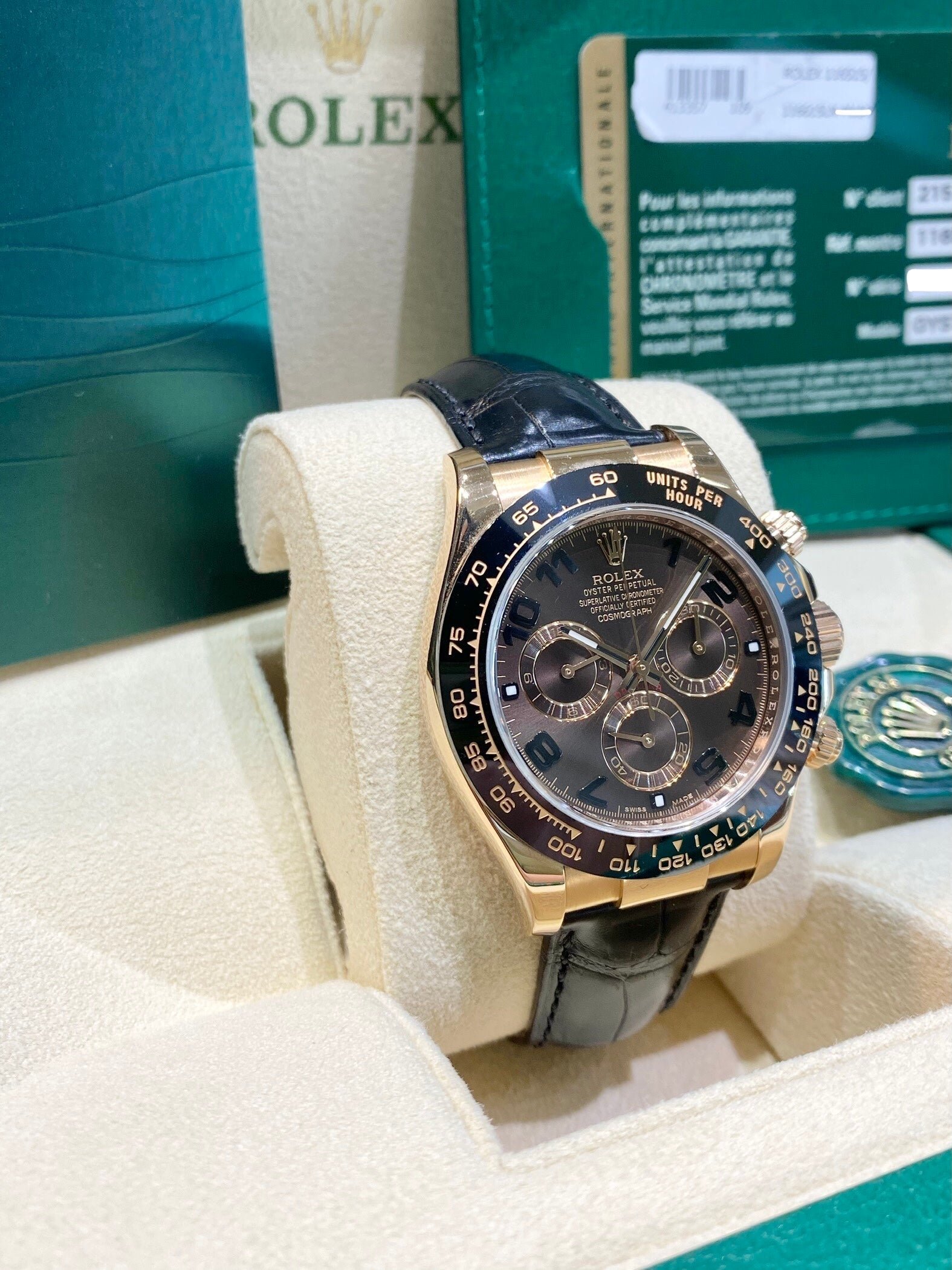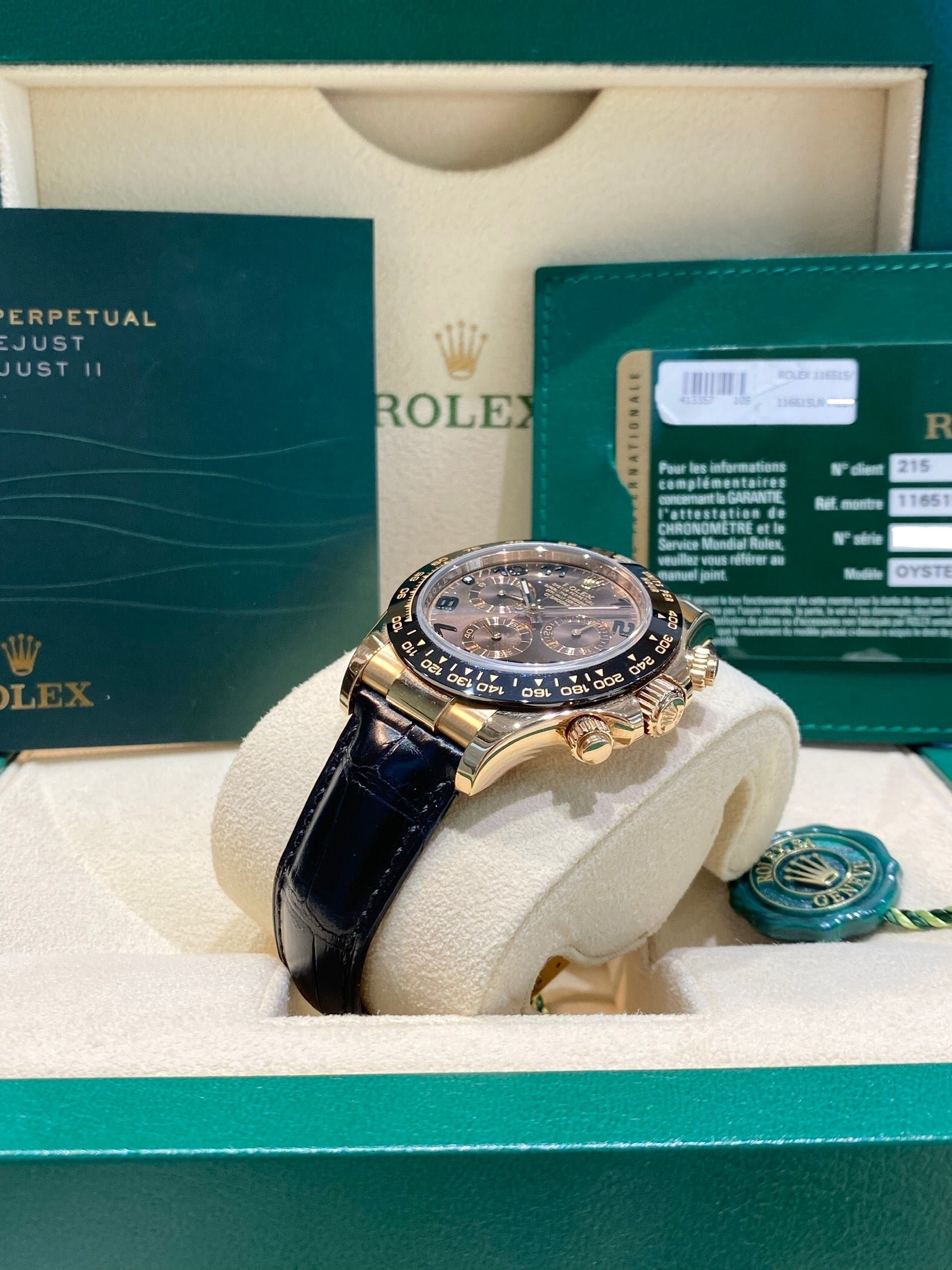 Bracelet: Black Rolex leather strap with 18ct Everose gold Oysterlock clasp