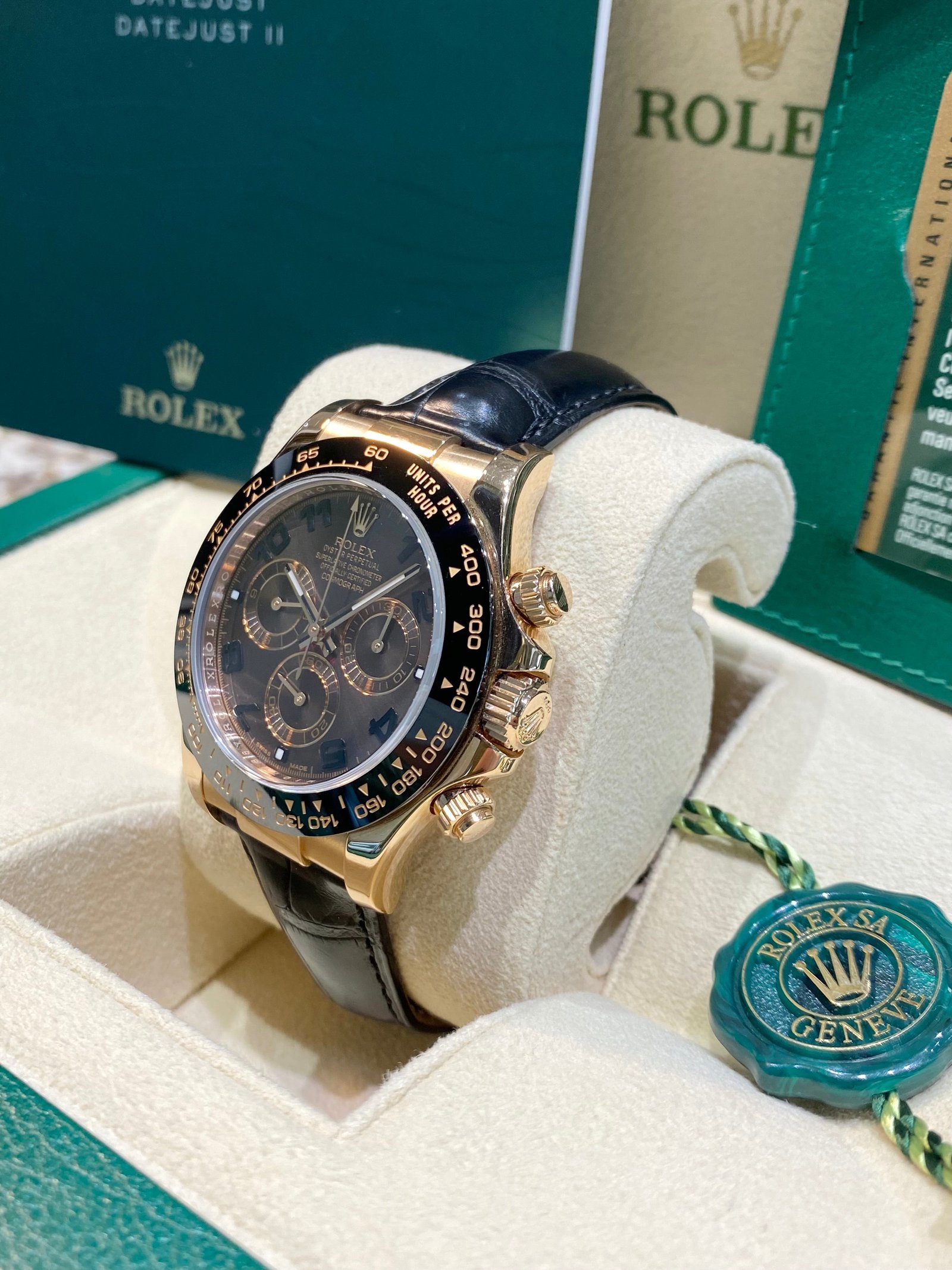 Bezel: Tachymetric engraved black ceramic bezel. Inner engraved Rolex bezel ring