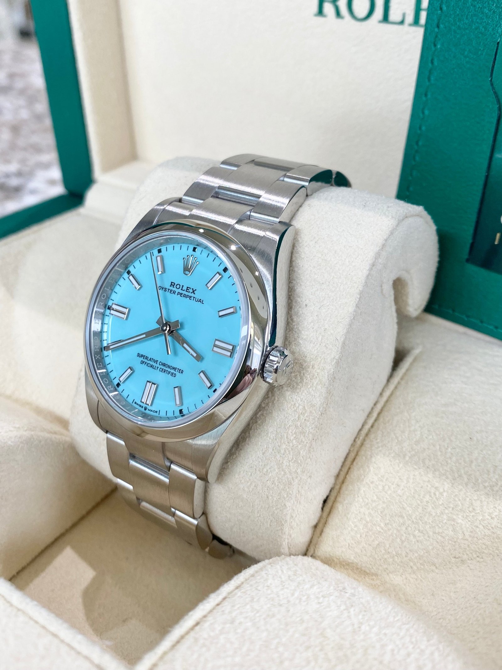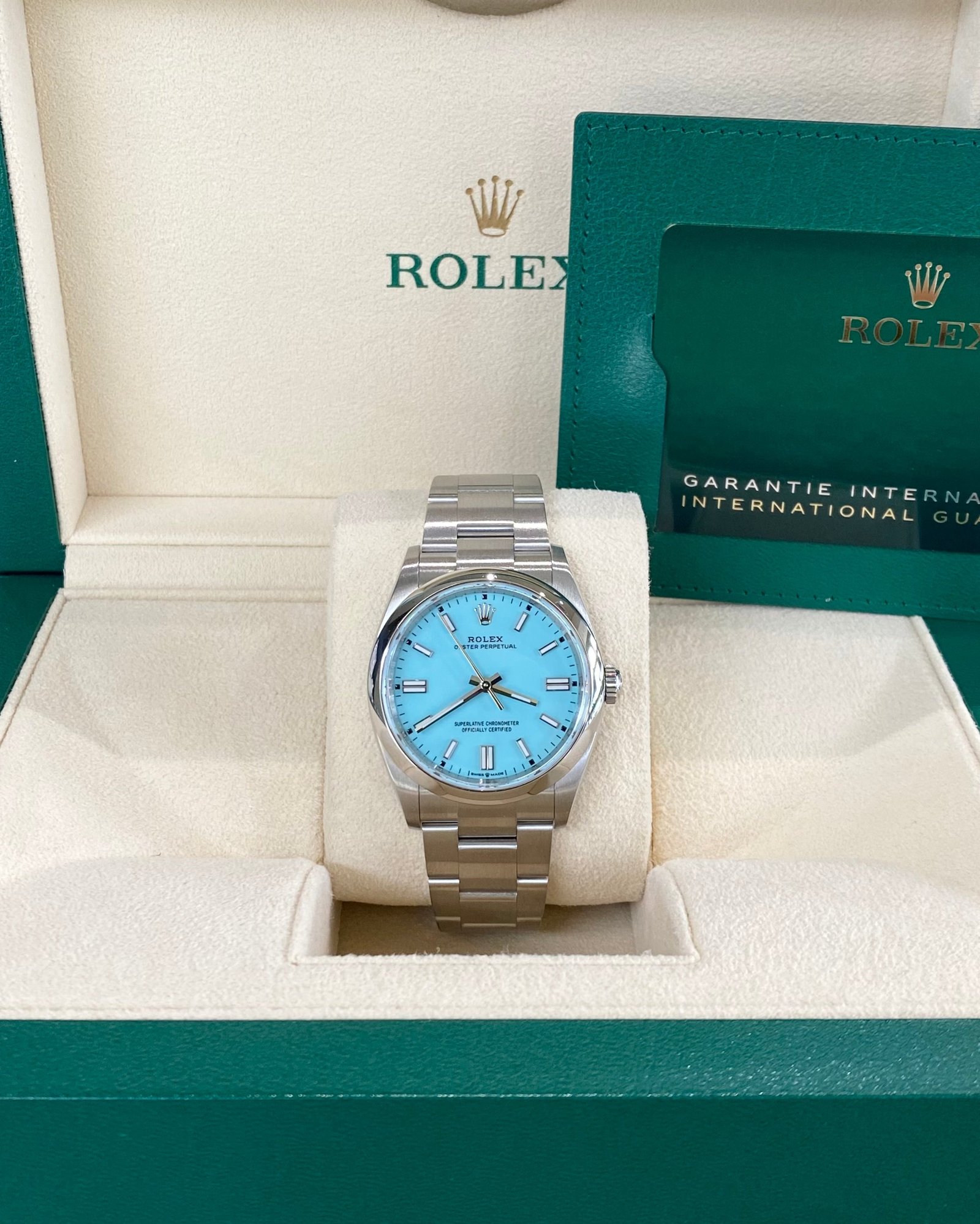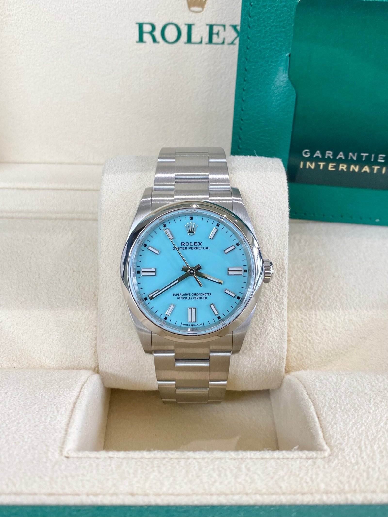 Dial: Turquoise blue dial with luminous inlay hands and hour markers.